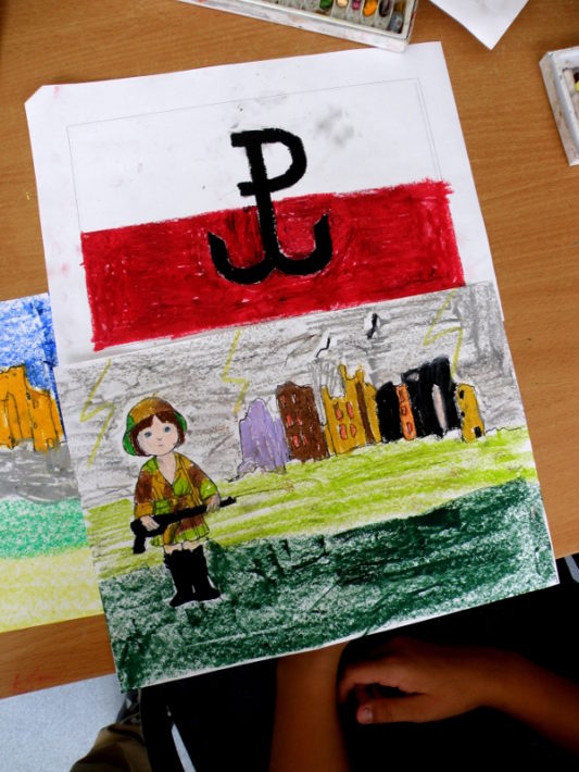 Dzieci podczas wprowadzenie do zajęć umieściły dzień wybuchu Powstania Warszawskiego na linii czasu, a następnie odbyła się dyskusja na temat: godziny „W”, znaku „Polska Walcząca” i zaangażowaniu dzieci oraz młodzieży w Powstanie Warszawskie. Po wprowadzeniu odbyło się wspólne rysowanie symbolu powstańców na tle flagi Polskiej i każdy wychowanek otrzymał kolorowankę o tematyce powstańczej.
