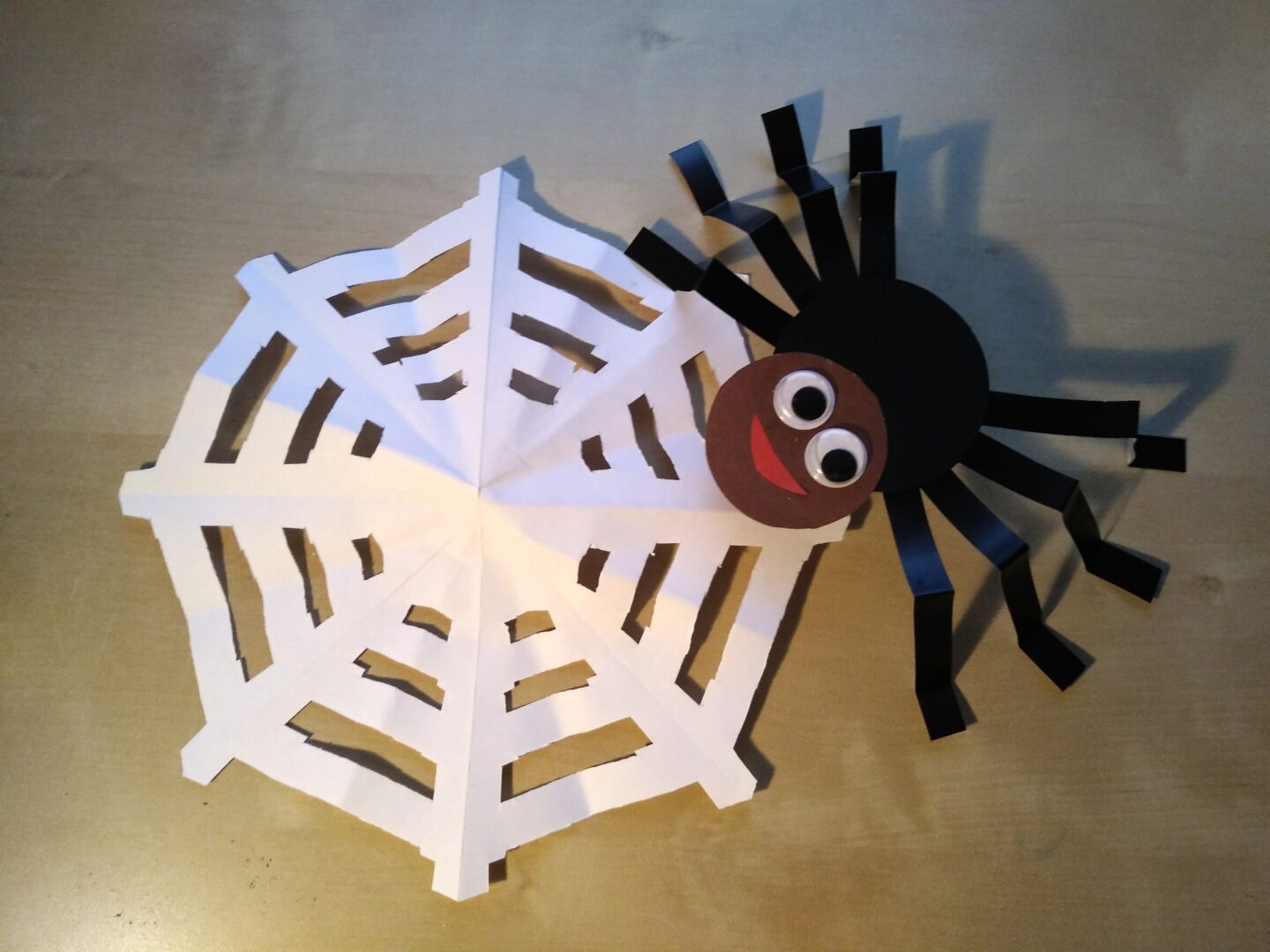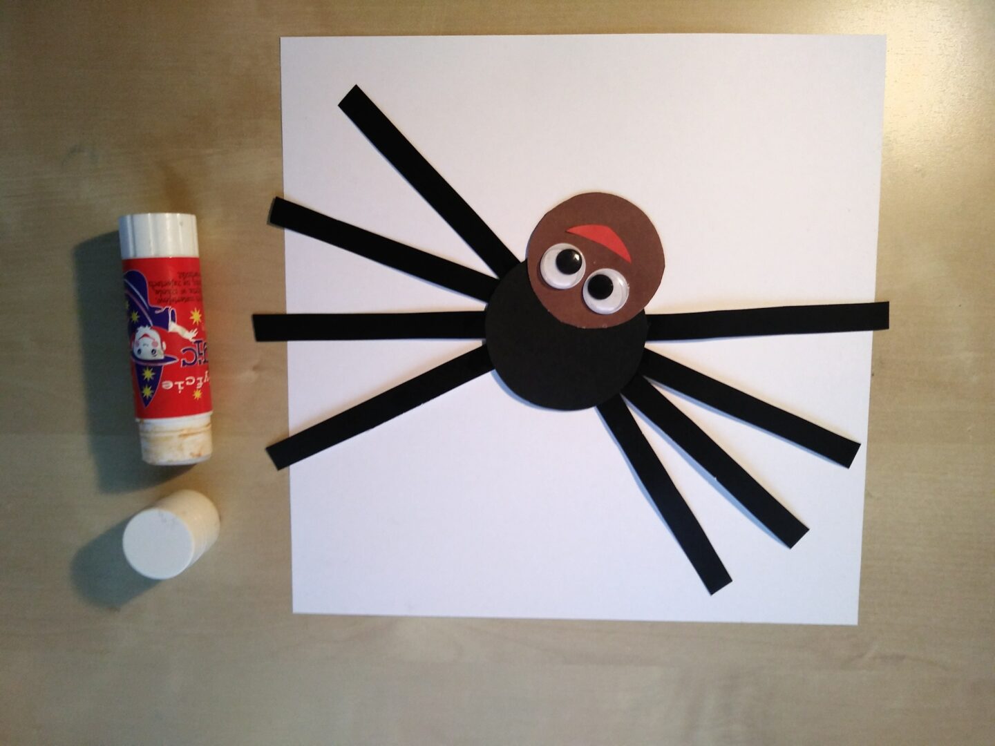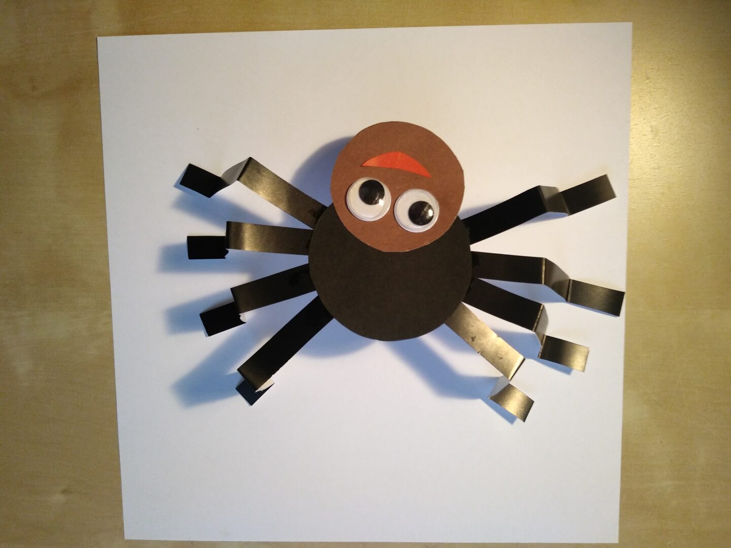 Wytnij i sklej wesołego pajączka. Potrzebne są: dwa koła wycięte z kolorowego papieru, 4 długie lub 8 krótkich pasków na odnóża, oczy, kwadratowa kartka do wykonanie pajęczyny.