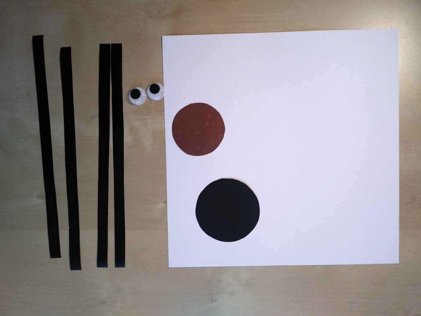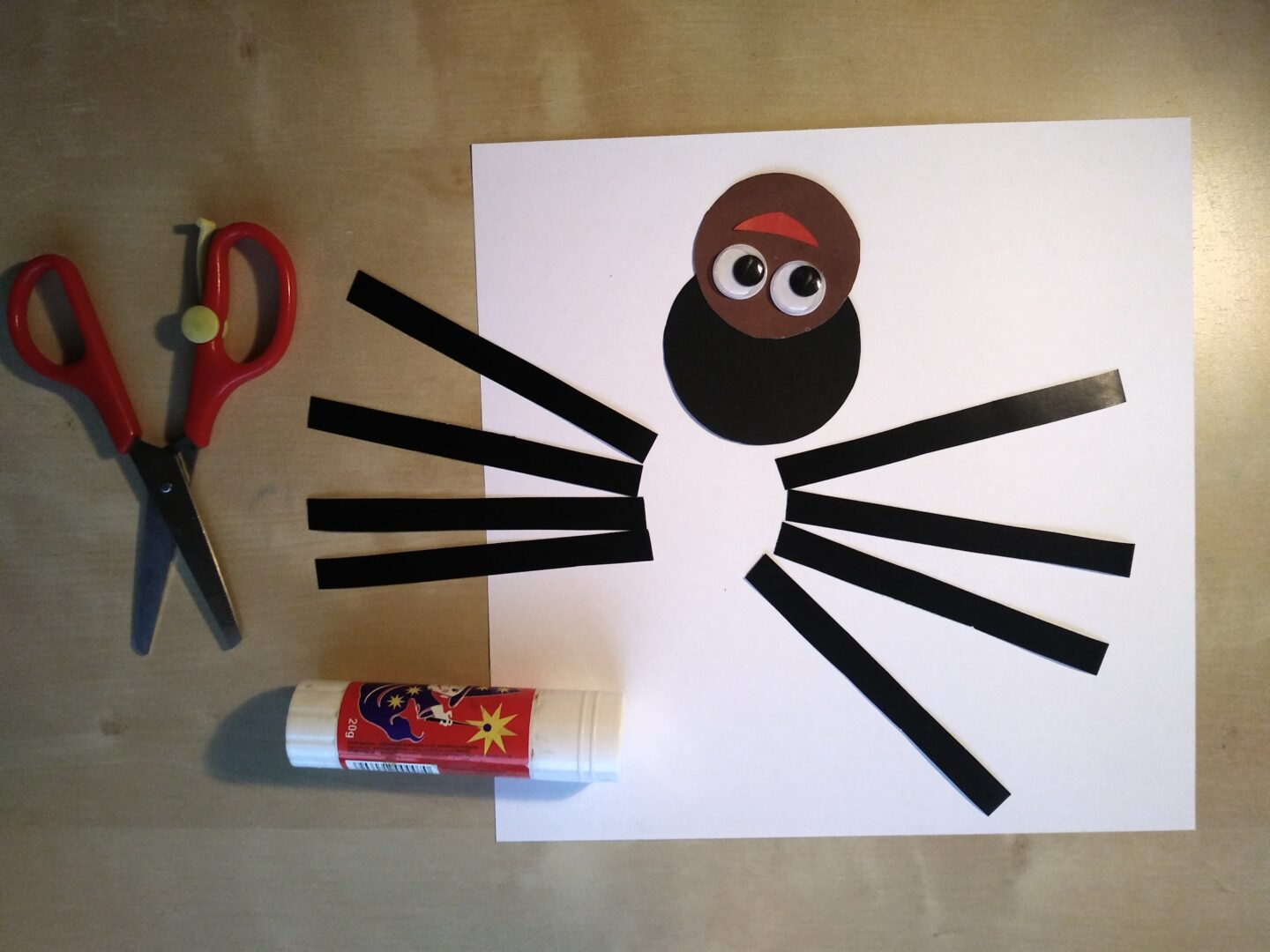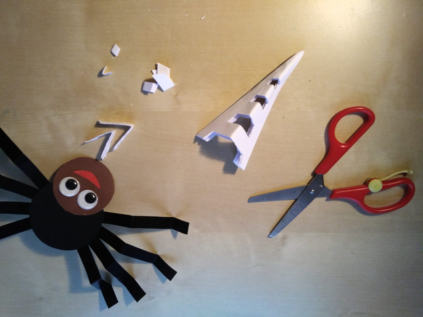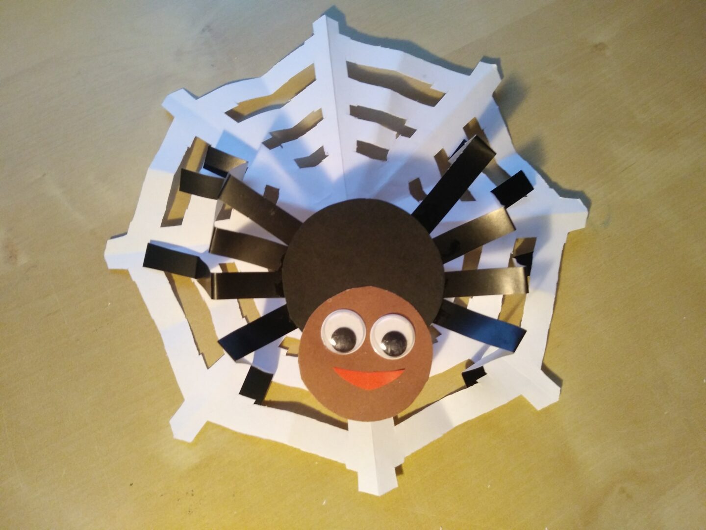 Wytnij i sklej wesołego pajączka. Potrzebne są: dwa koła wycięte z kolorowego papieru, 4 długie lub 8 krótkich pasków na odnóża, oczy, kwadratowa kartka do wykonanie pajęczyny.