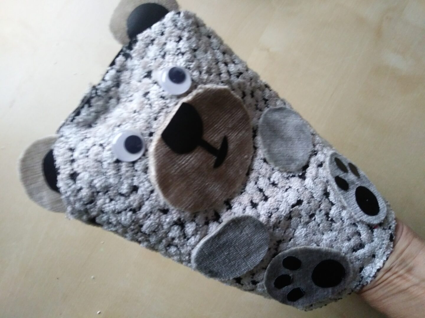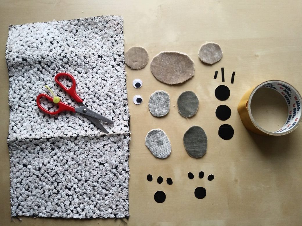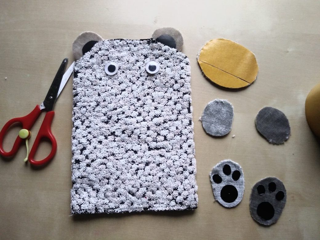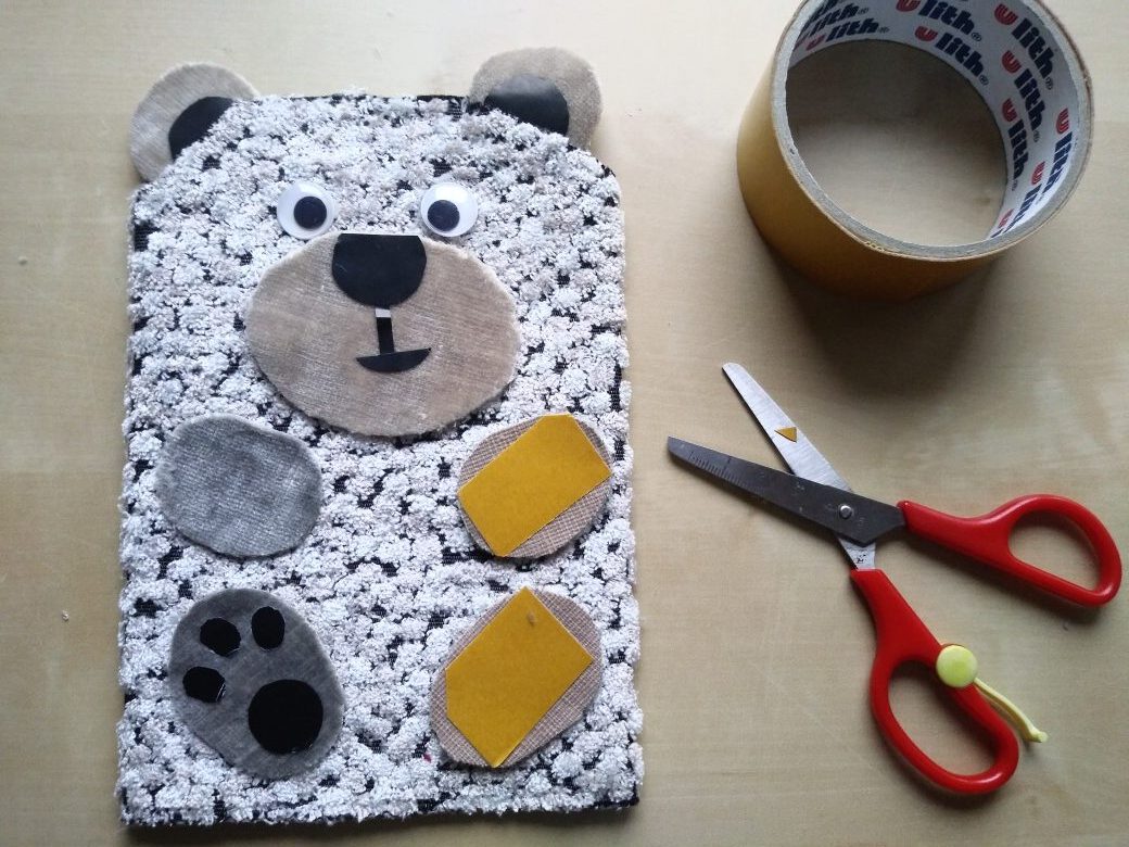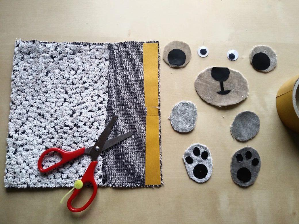 Wśród nietypowych świąt, 28 października jest Dniem Miłośników Pluszaków. Na dzisiejszych warsztatach pokażę jak wykonać z pluszowego materiału Misia- pacynkę. Potrzebny jest: prostokątny, nieduży kawałek materiał, koła na uszy, oczy, nosek i łapki.Wycięte elementy sklejamy taśmą dwustronną jak na zdjęciach. Gotową pacynką możemy bawić się w teatr.