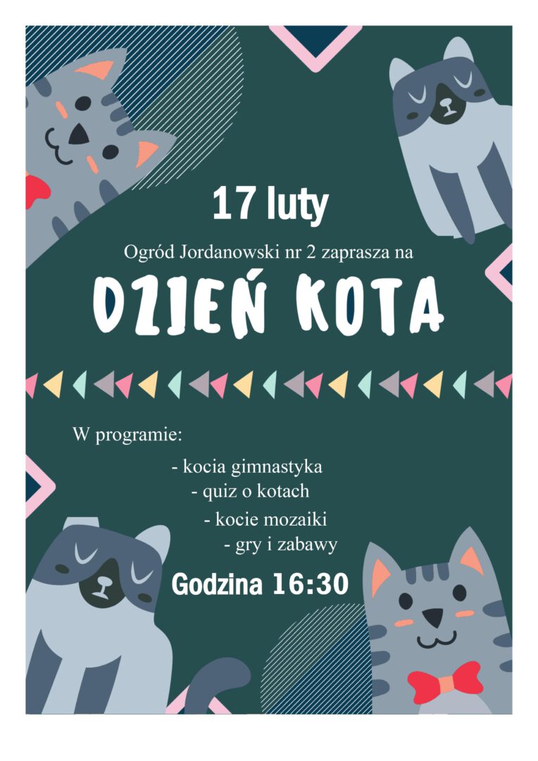 Pomimo deszczowej i wietrznej pogody Dzień Kota w Ogrodzie Jordanowskim nr2 upłynął w ciepłym nastroju. Powstały baśniowe koty, rozwiązywaliśmy quiz o obyczajach kocich, a także odbyły się kocie zabawy i gry. Nie zabrakło niespodzianek.