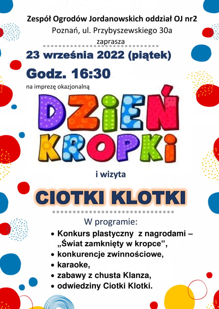 Dzień Kropki z wizytą Ciotki Klotki to impreza okazjonalna promująca zajęcia w naszej placówce. Rysowaliśmy świat zamknięty w kropce, tańczyliśmy z naszym gościem, nauczyliśmy się piosenki o kropce i głosowaliśmy na najlepszą pracę rysunkową. Było dużo śmiechu, pozytywnych emocji i zdrowej rywalizacji. Dzień Kropki to święto kreatywności, a dzieci udowodniły, że są twórcze i potrafią się świetnie bawić.