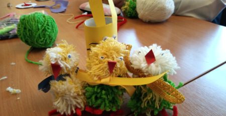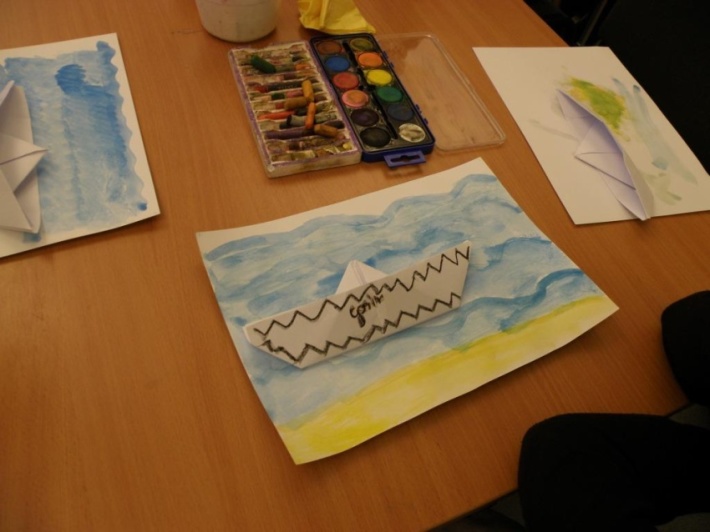 Po sportowych zmaganiach w świetlicy Ogrodu Jordanowskiego zostały przeprowadzone warsztaty plastyczne. Nasi sympatyczni goście w ramach tych zajęć pracowali metodą origami. Złożyli z papieru statek, następnie pokolorowali i podpisali go kredkami. Kolorowe łódki zostały naklejone na wymyślone i namalowane farbami wodnymi – tło. Powstały piękne, przestrzenne prace!