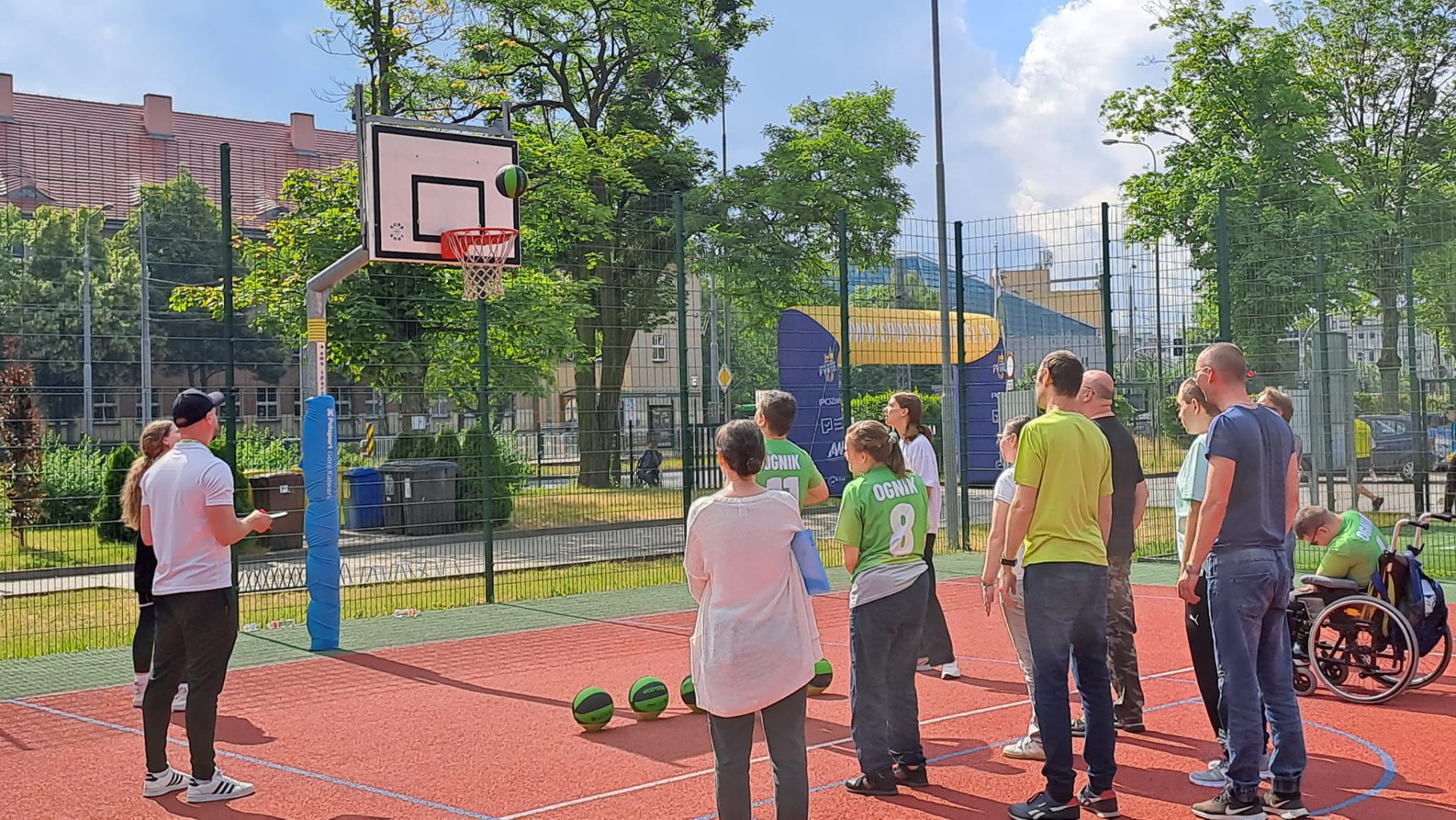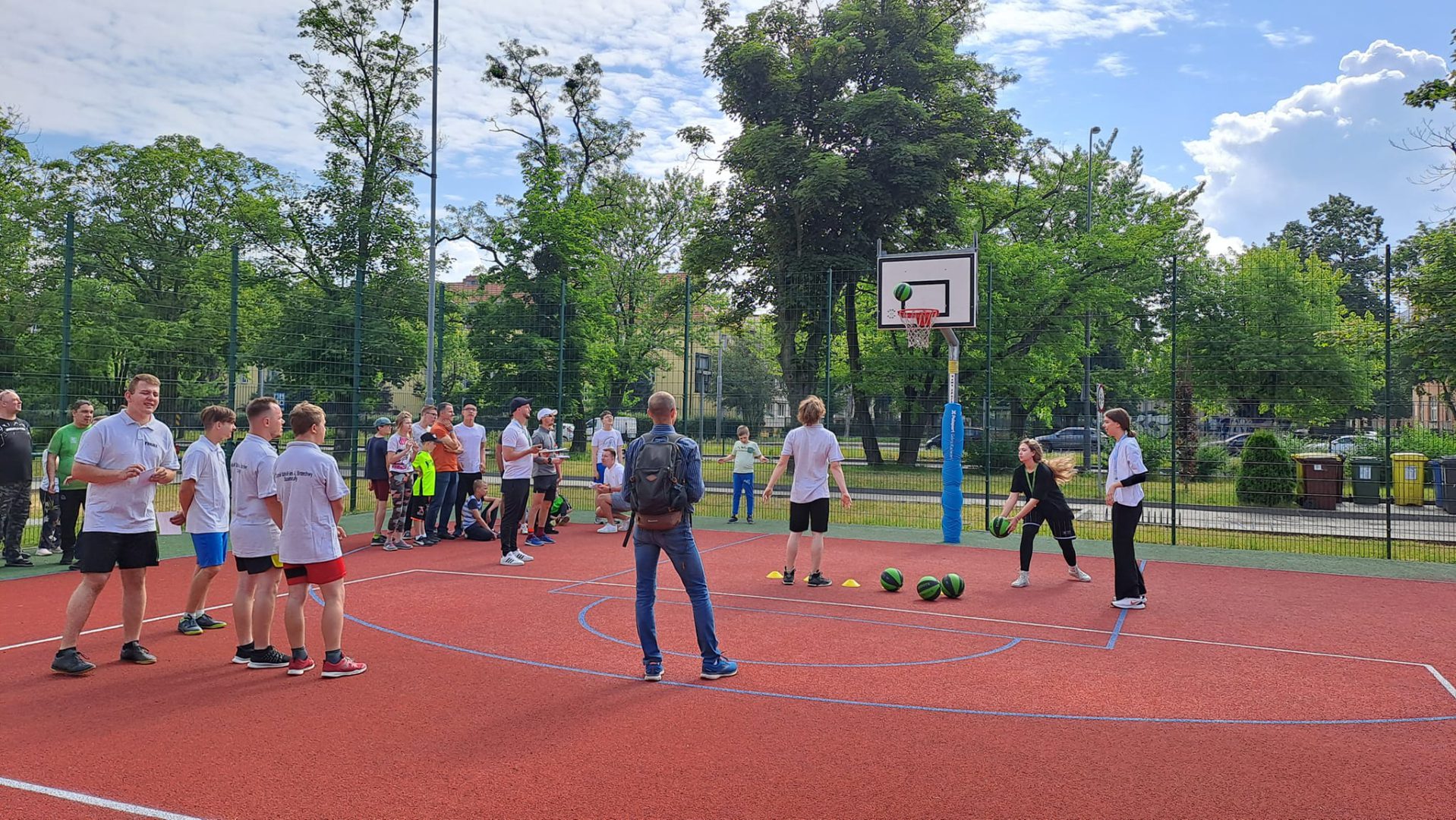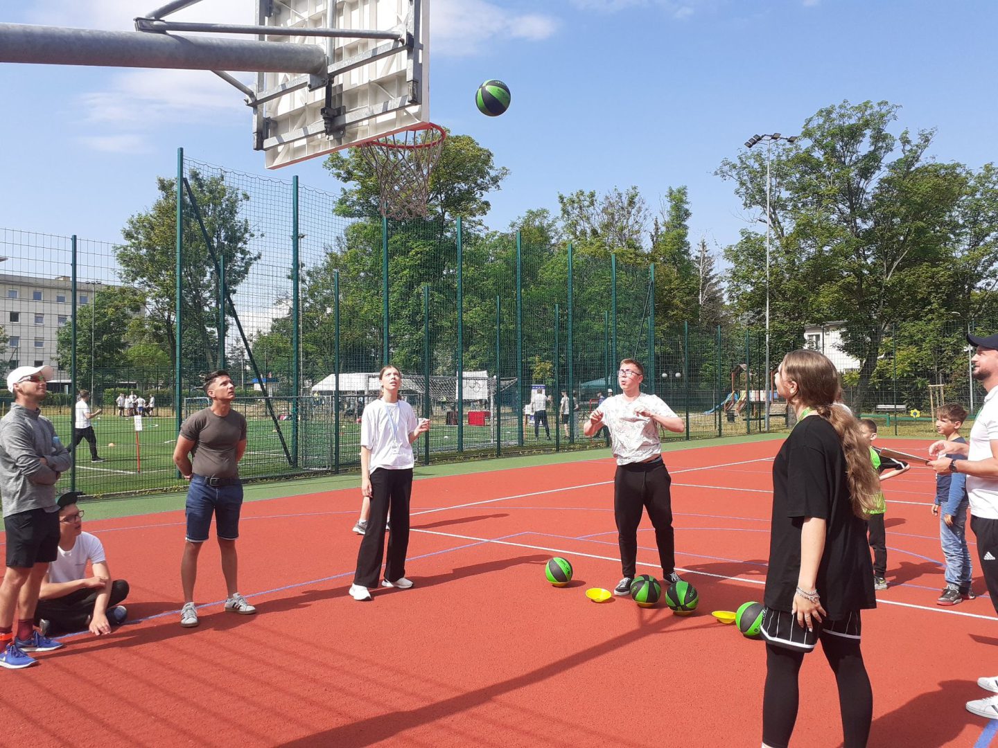 c) rzuty piłką do kosza – konkurencja polega na oddaniu rzutu do kosza z wyznaczonych miejsc. Konkurencja będzie rozgrywana na boisku wielofunkcyjnym (czerwonym). Miejsce, w którym rozegra się konkurencja, będzie oznaczone tablicą.