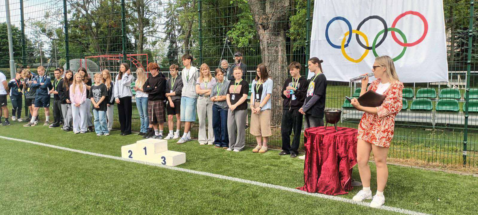 Znicz wspólnie z uczestnikiem igrzysk zapaliła Julia Walczyk- Klimaszyk – florecistka uczestniczka Igrzysk Olimpijskich w Paryżu 2024, wielokrotna medalistka Mistrzostw Polski. Na otwarciu gościliśmy Mariusza Wiśniewskiego – Z-ca Prezydenta Miasta Poznania, Dariusza Kozelana z Wydziału Oświaty, prof. AWF dr hab. Małgorzatę Bronikowską wiceprzewodniczącą Polskiej Akademi Olimpijskiej, Danutę Hyżak z Kuratorium Oświaty.