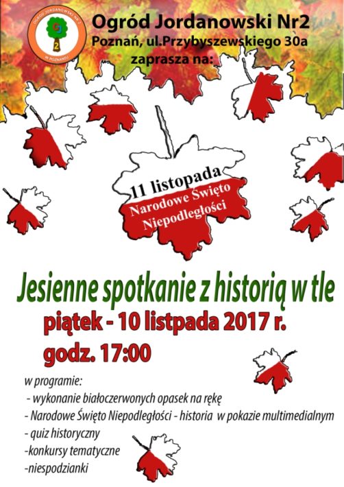 W przeddzień obchodów Narodowego Święta Niepodległości w placówce odbyła się impreza okazjonalna pt. „Jesienne spotkanie z historią w tle”. Z tej okazji został przypomniany w pokazie multimedialnym rys historyczny wydarzeń z 11 listopada 1918 roku. Wychowankowie sprawdzili i utrwalili nabytą wiedzę w quizie. Dzieci współpracując ze sobą w  grupach  odpowiadały na pytania wspaniale, a znajomość tekstu hymnu narodowego  wypadła śpiewająco. Dodatkowo uczestnicy wykonali opaski biało-czerwone z własnoręcznie pokolorowanym godłem.