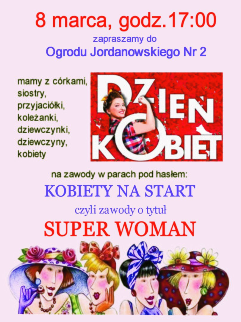 Dzień Kobiet w Ogrodzie Jordanowskim Nr 2 był pełen atrakcji. Odbyły się zawody w parach pod tytułem „Kobiety na start”. Były konkurencje sprawnościowe, a także ze znajomości „męskich” przedmiotów takich jak: obcęgi, młotek, korkociąg, nóż introligatorski, miara stolarska, maszynka do golenia. Uczestniczki odpowiadały na podchwytliwe pytania i rysowały ślimaka z pomocą „szczęśliwych” numerków. Zawodom towarzyszyło wiele emocji i śmiechu. Po wyrównanej rywalizacji wyłoniono zwycięską parę, która otrzymała tytuł SUPER WOMAN 2019.