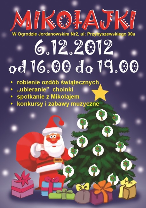 W dniu 06-12-2012 Ogród Jordanowski Nr 2 tętnił zabawą, śpiewem i tańcami w atmosferze zbliżających się świąt. Wychowankowie OJ nr 2 wraz z młodszym rodzeństwem i opiekunami integrowali się przy tworzeniu ozdób, łańcuchów, wisiorków oraz ubieraniu choinki. Pracę umilała muzyka i kolędowanie dzieci. Punktem kulminacyjnym imprezy było przybycie Mikołaja.