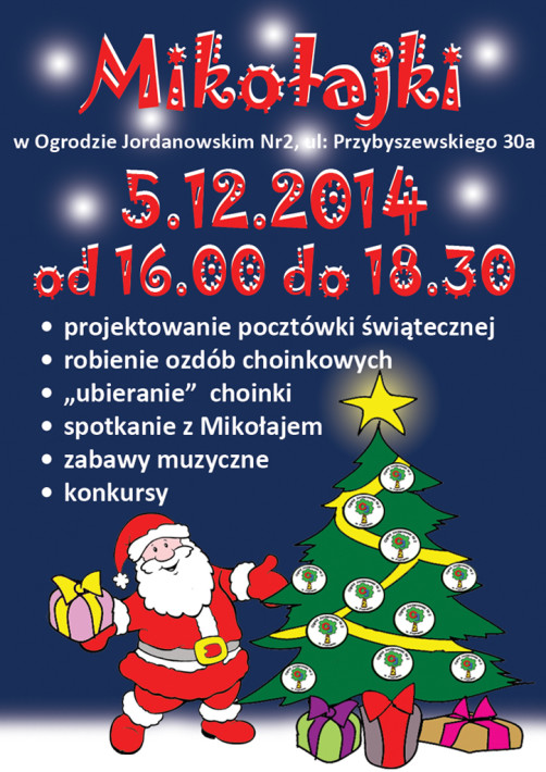 Tradycyjnie w Ogrodzie Jordanowskim Nr 2 dużą frekwencją cieszyła się impreza okazjonalna – Mikołajki. Od przedszkolaka do gimnazjalisty, wszyscy tworzyli ozdoby świąteczne, zawieszali je na choinkę a papierowymi soplami ozdabiali salę. Było wspólne kolędowanie, wizyta Mikołaja z workiem pełnym prezentów, konkursy i zabawa przy muzyce. Wszyscy odczuli magię zbliżających się Świąt Bożego Narodzenia.