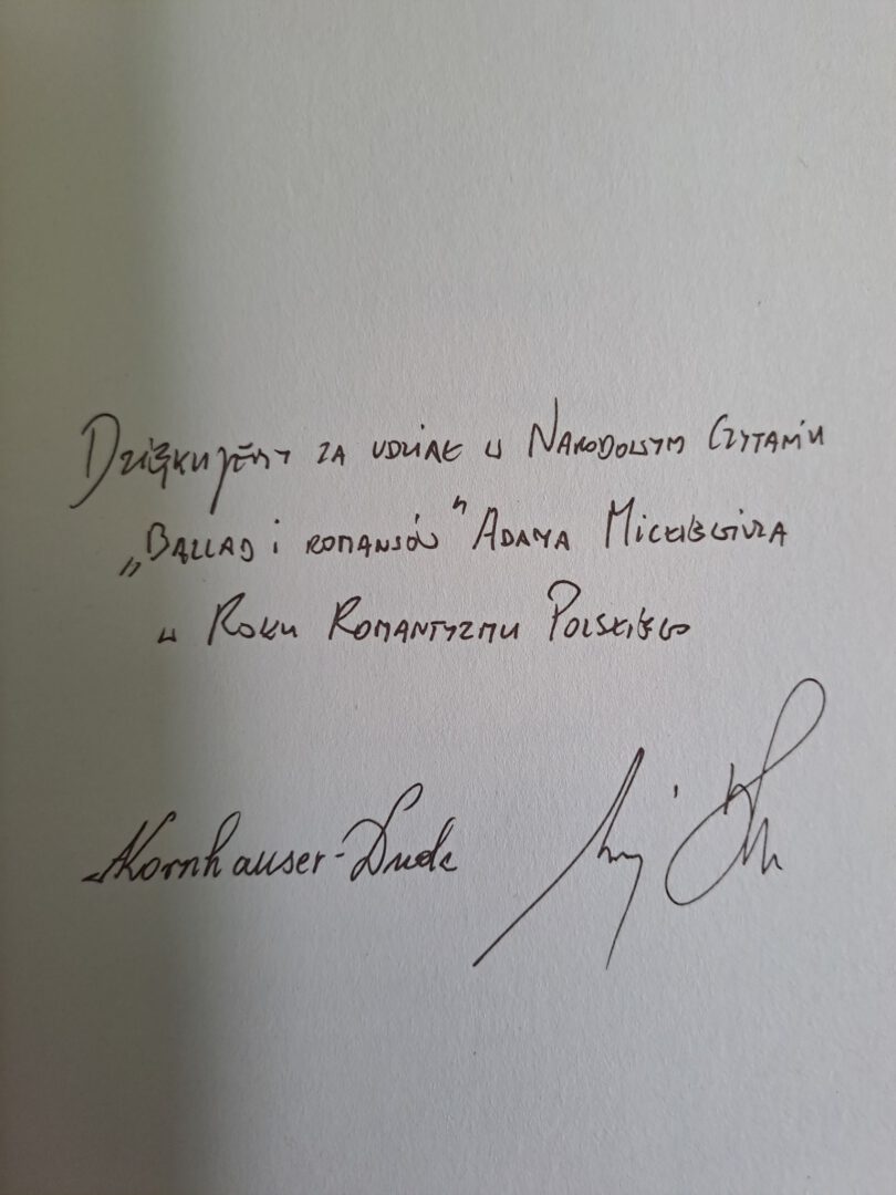 – Dwieście lat temu w Wilnie zostały wydane Ballady i romanse Adama Mickiewicza – zbiór poezji, który zapoczątkował w Polsce romantyzm. Młodzieńcze, a jednocześnie bardzo dojrzałe wiersze okazały się przełomowe i dzisiaj trudno wyobrazić sobie bez nich dalsze dzieje naszej literatury. (…) Romantyzm to istota polskości i fundament nowoczesnej tożsamości naszego narodu. To epoka zmagań z zaborcą, utrwalona w biografii Adama Mickiewicza oraz tych wszystkich polskich patriotów, uczestników tajnych stowarzyszeń i powstań, działaczy emigracyjnych i spiskowców, którzy na różne sposoby, w kraju i na obczyźnie, czynem i słowem toczyli bój o suwerenną Rzeczpospolitą  – napisał w liście Prezydent RP Andrzej Duda.
