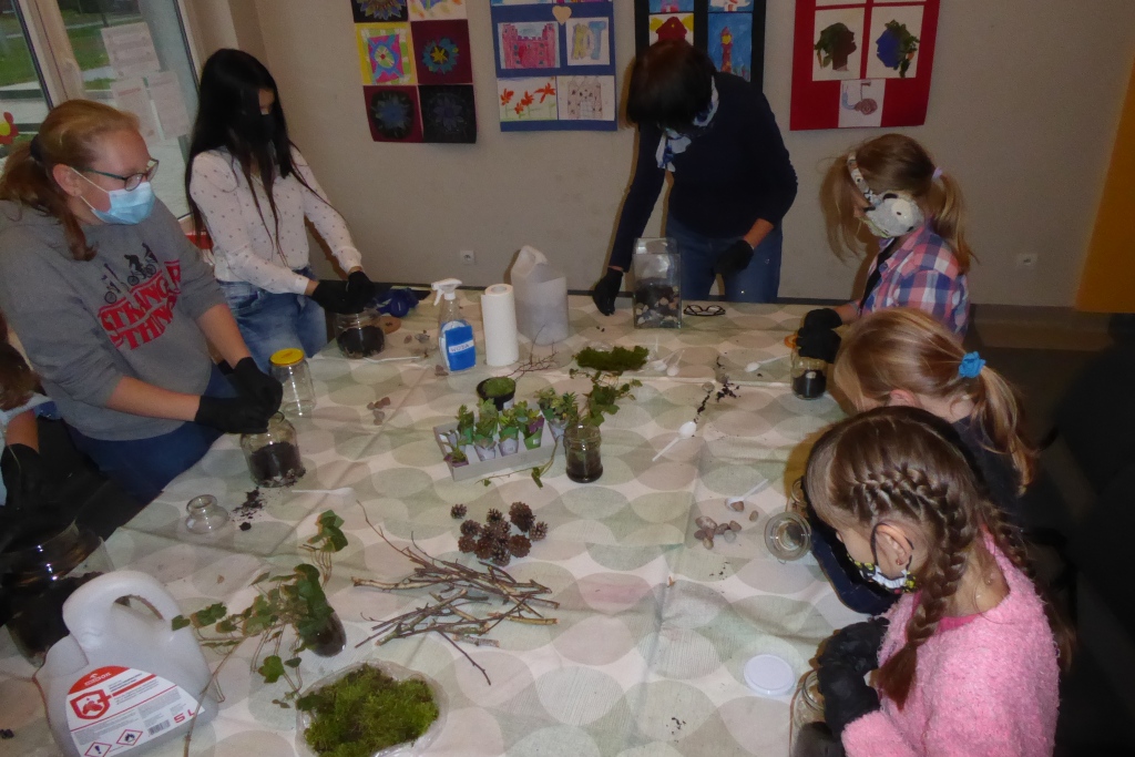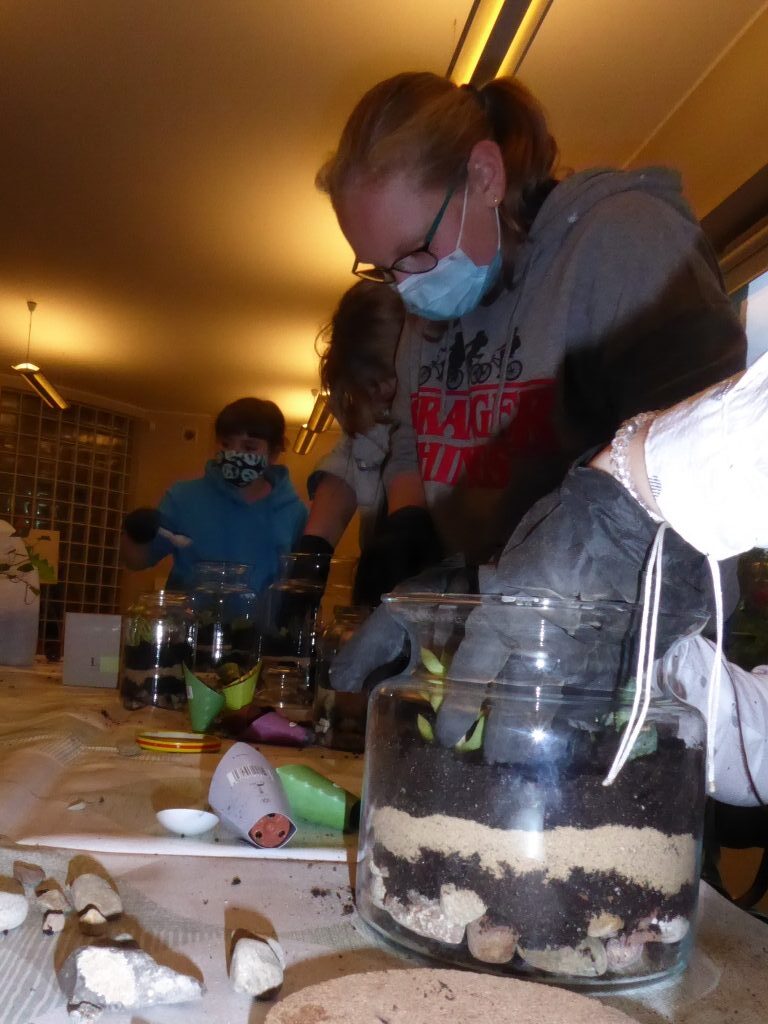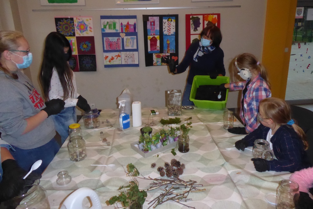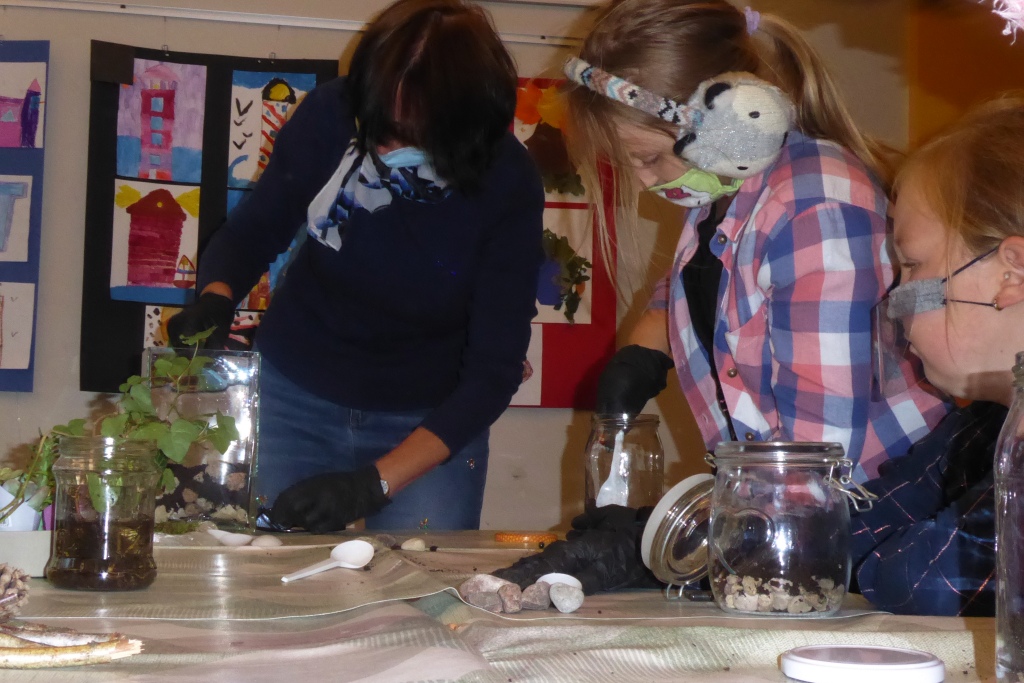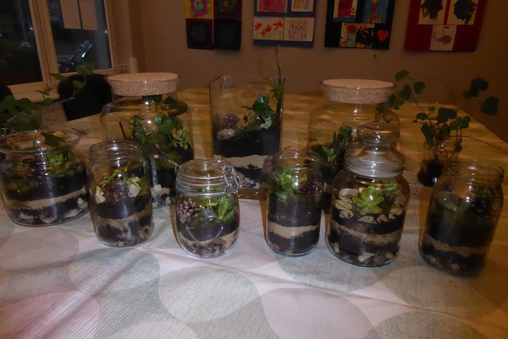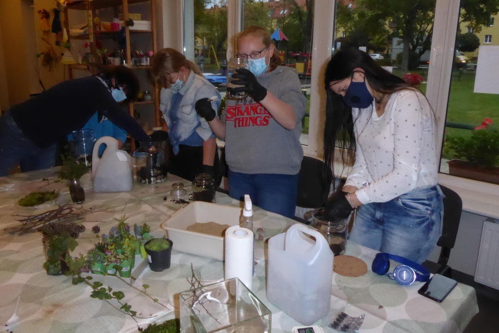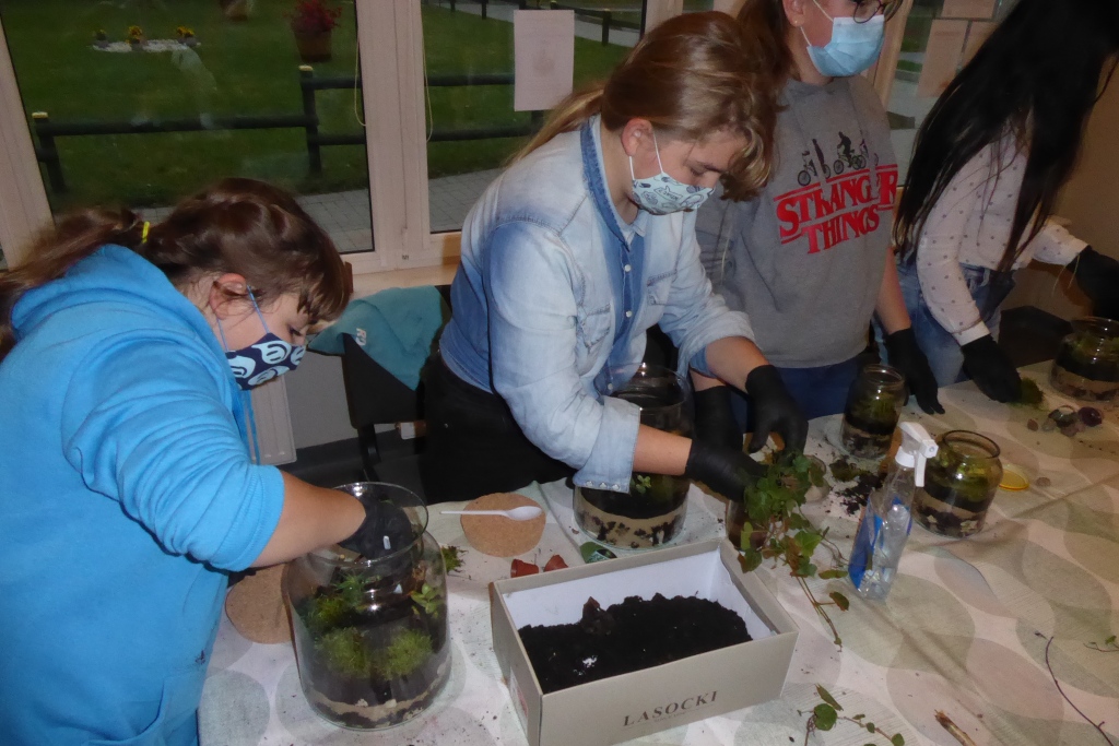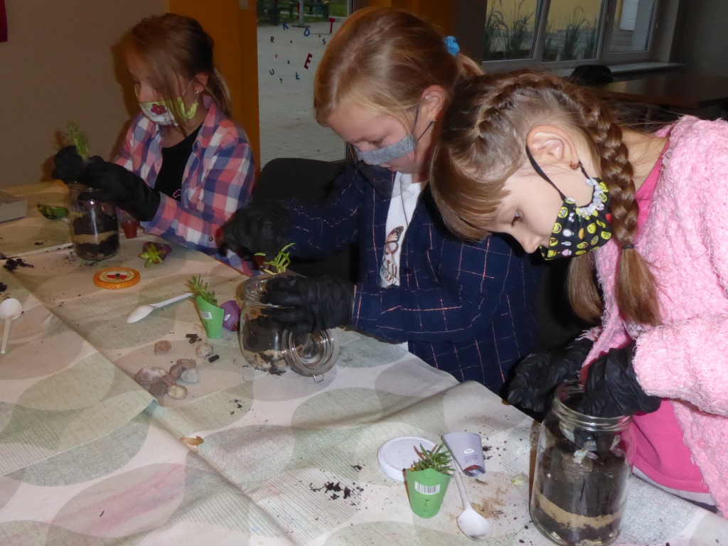 Spotkanie na warsztatach Ogrody zamknięte w słoiku zaowocowały pięknymi kompozycjami roślinnymi. Uczestniczki zajęć nauczyły się projektowania, sadzenia i układania roślin w przestrzeni zamkniętej. Wybór odpowiedniego podłoża, roślin- sucholen oraz pomysłowe ozdabianie mini ogrodów w słoiku to wiedza , florystyczna, którą zdobyły w praktyce. Zaangażowanie „małych ogrodniczek” w tworzeniu kompozycji było bardzo duże i przełożyło się na pomysłowe zielniki.