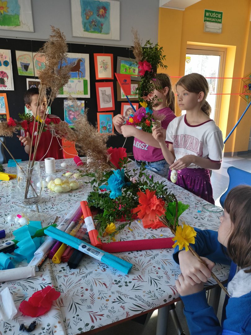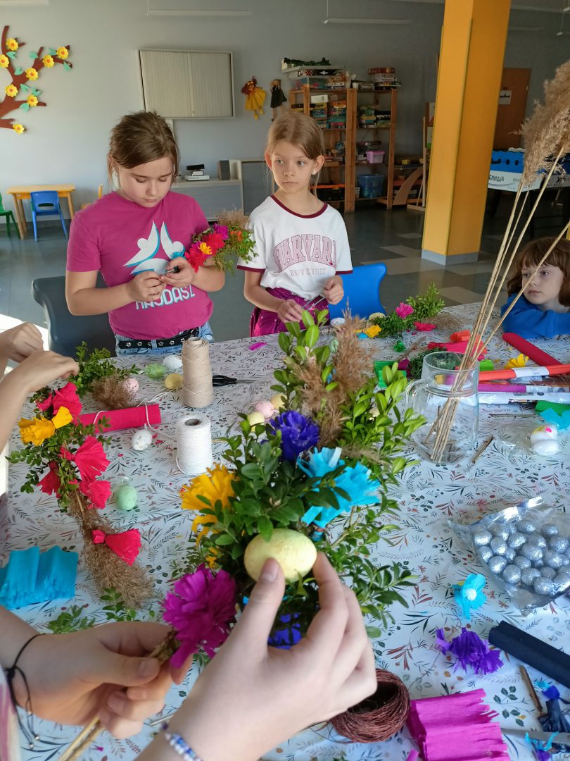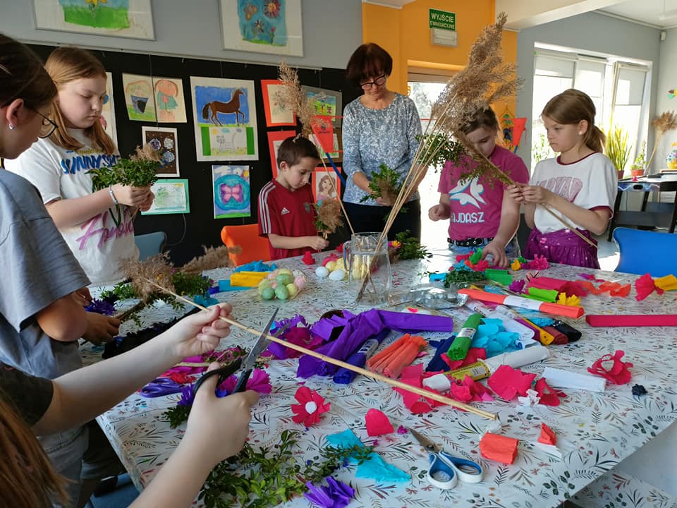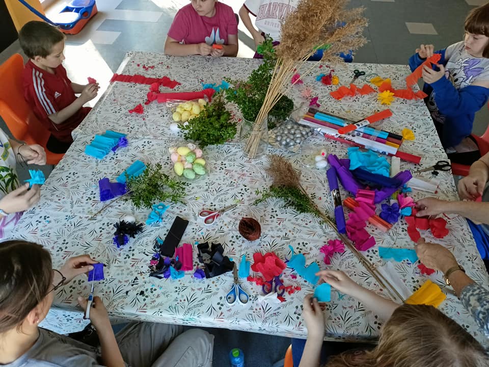 Warsztaty z wykonania Palm Wielkanocnych stały się świetną okazją by przybliżyć dzieciom tradycje wielkanocne. Dzieci z dużą cierpliwością i zaangażowaniem wykonały kolorowe palmy.