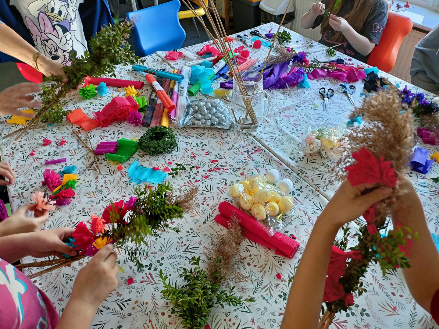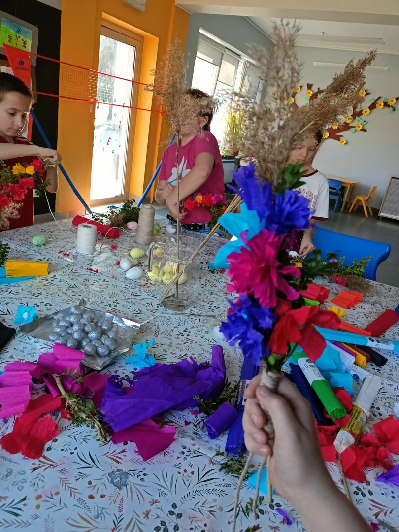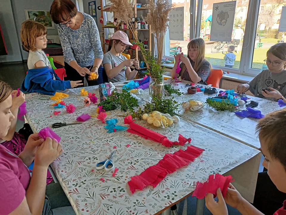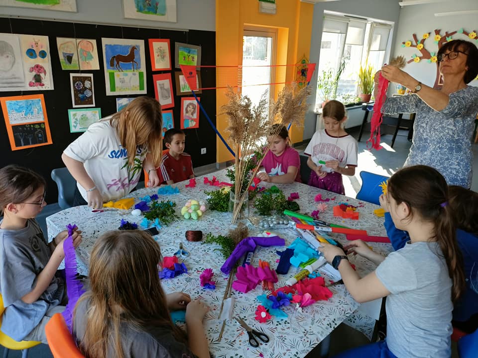Warsztaty z wykonania Palm Wielkanocnych stały się świetną okazją by przybliżyć dzieciom tradycje wielkanocne. Dzieci z dużą cierpliwością i zaangażowaniem wykonały kolorowe palmy.