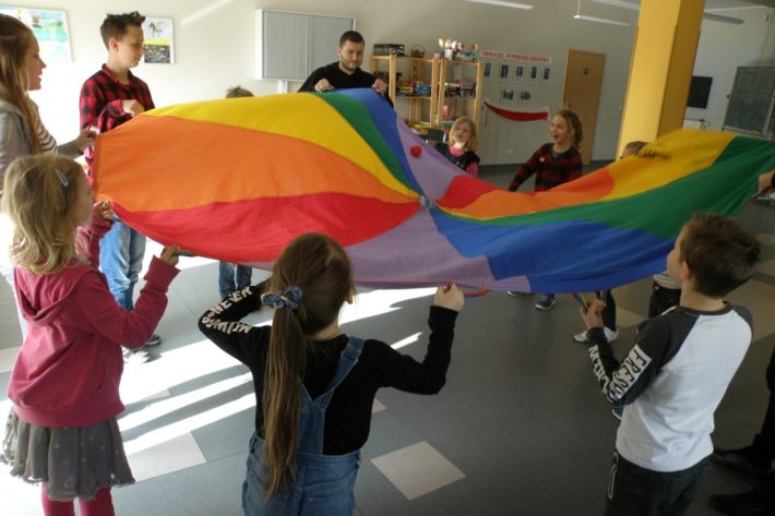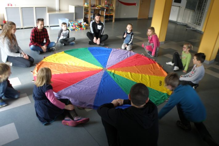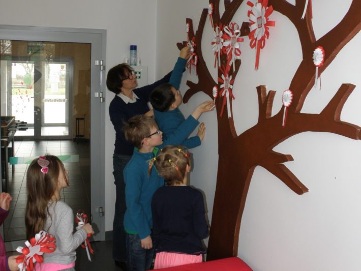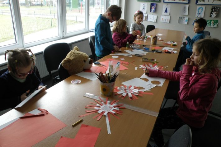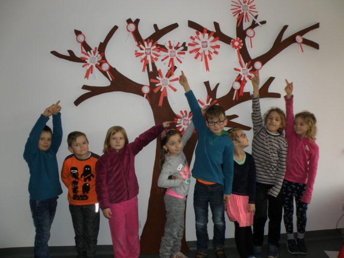 Rozpoczął się II tydzień półkolonii zimowych. Uczestnicy wykonali biało-czerwone kotyliony, które przywiesili na „Drzewie wolności”. Drzewo ma nam przypominać o 100. rocznicy odzyskania niepodległości przez Polskę. Ruch na sali gimnastycznej i słuchanie bajki umiliło pierwszy dzień.