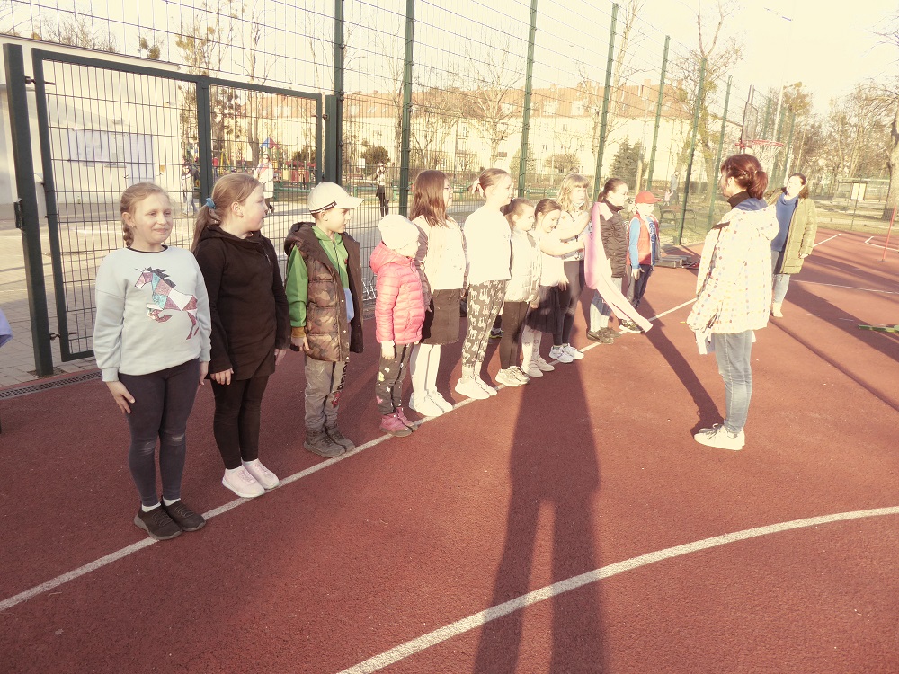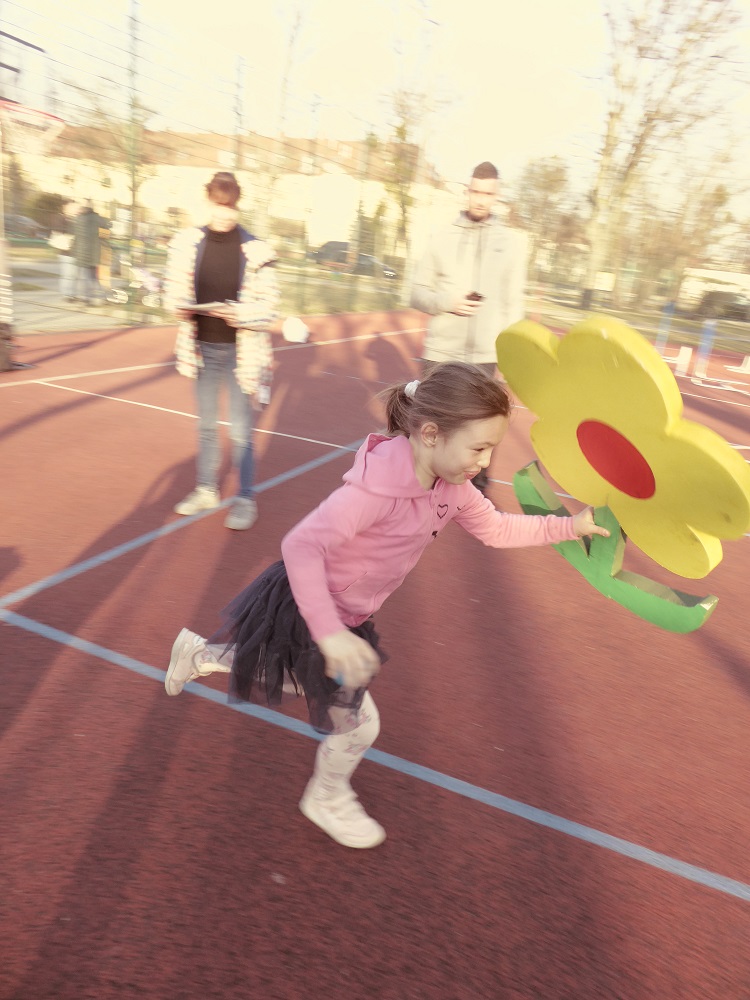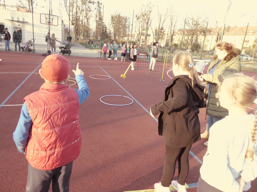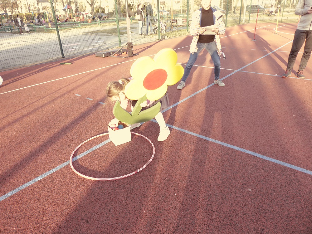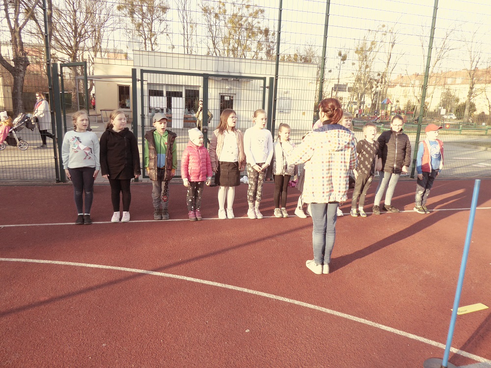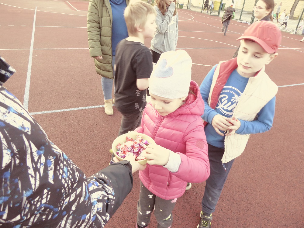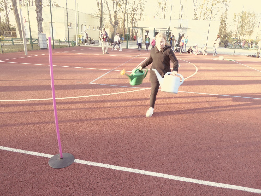 Piękna pogoda sprzyjała sportowym zawodom , które odbyły się na boisku Orlik z okazji rozpoczynającej się kalendarzowej wiosny. Wszystkie konkurencje miały wiosenny podtekst. Uczestnicy biegali na czas z konewkami, przenosili piłki trzymając w ręce kwiat, rzucali grabkami w dal i rywalizowali w slalomie ubrani w suknię Marzanny. Zabawie towarzyszyła ambitna, sportowa rywalizacja z uśmiechem na twarzy. Na zakończenie zawodów wszyscy uczestnicy rysowali kredami panią Wiosnę z kwiatami we włosach.