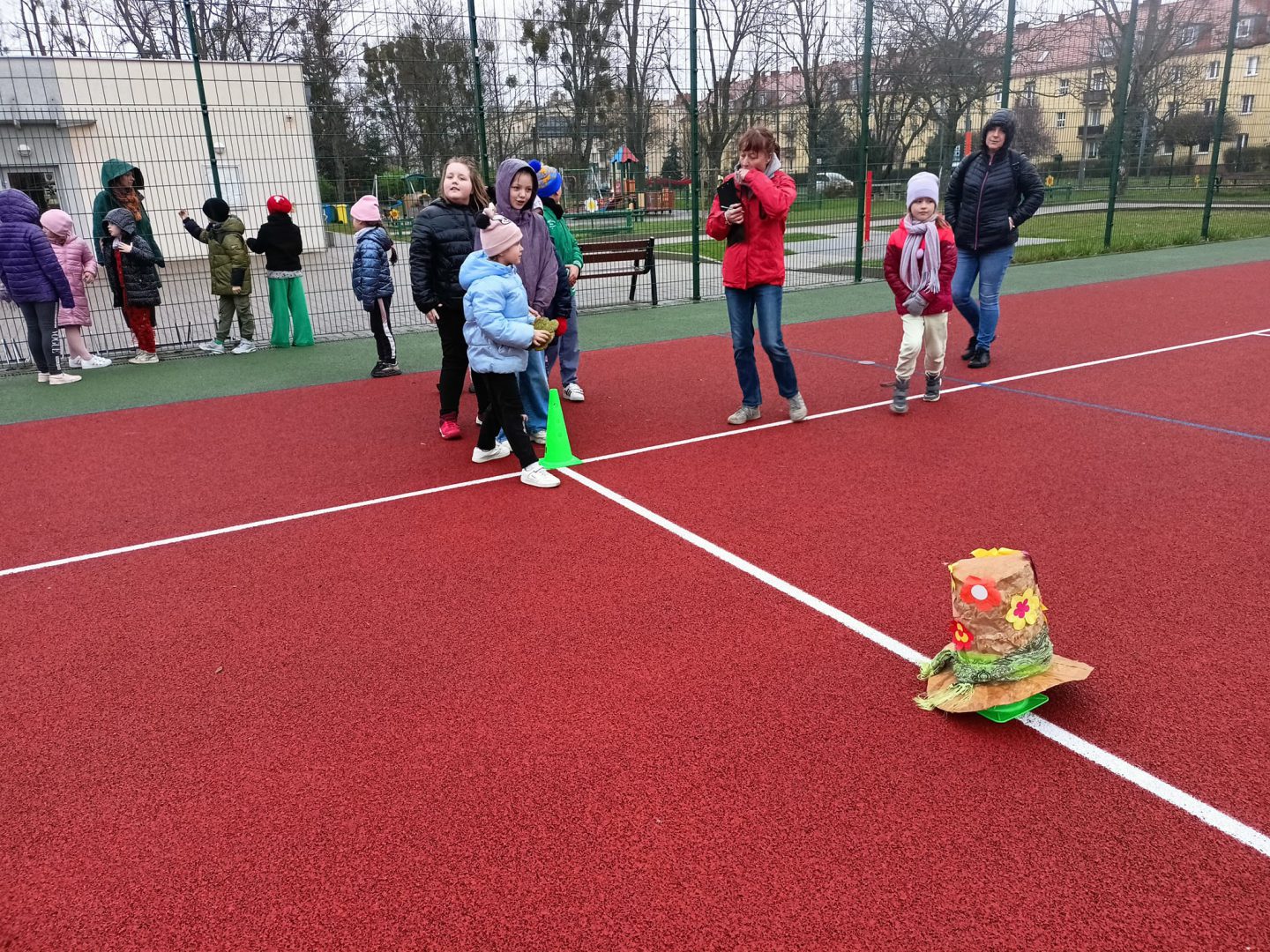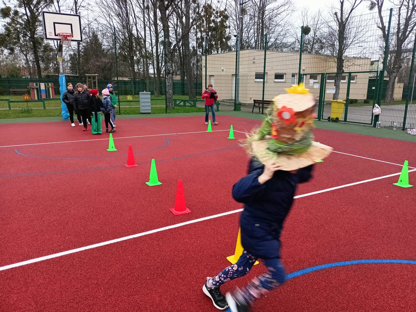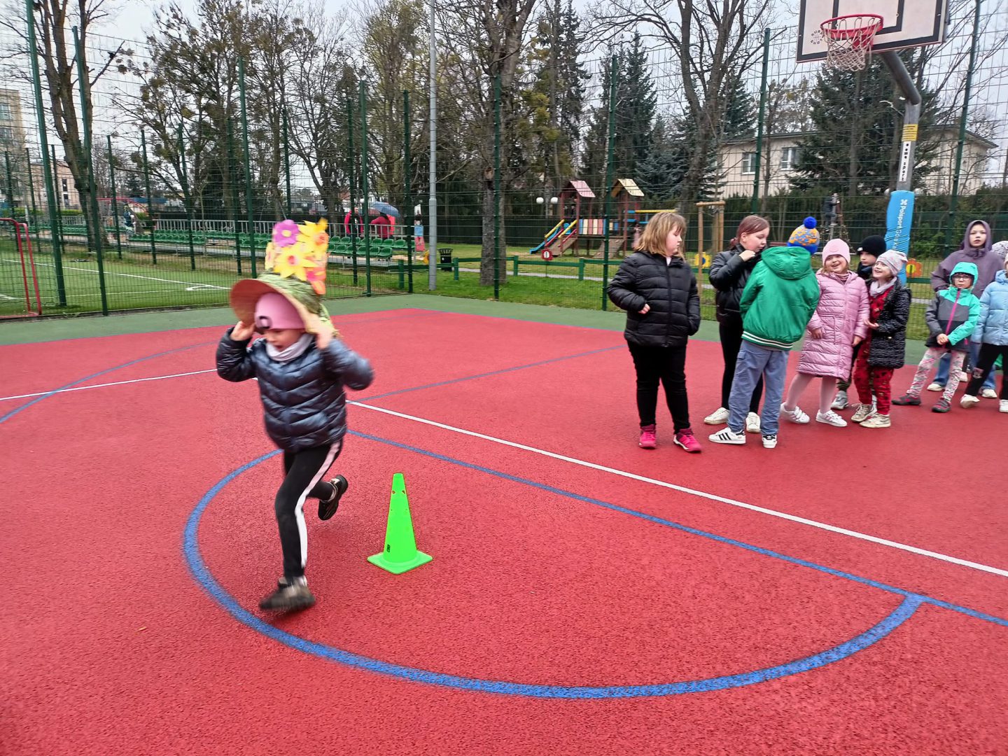 Mimo deszczowej aury, udało nam się przywitać wiosnę na sportowo. Był bieg z kapeluszem Pani Wiosny, przeskakiwanie kałuży oraz rzut kwiatami w kapelusz. Dziękujemy dzieciom za uczestnictwo i kształtowanie charakteru sportowca w myśl zasady ” nie ma złej pogody tylko niewłaściwe ubrani ludzie ”