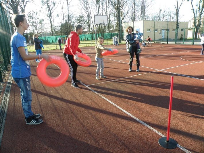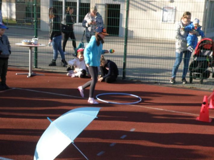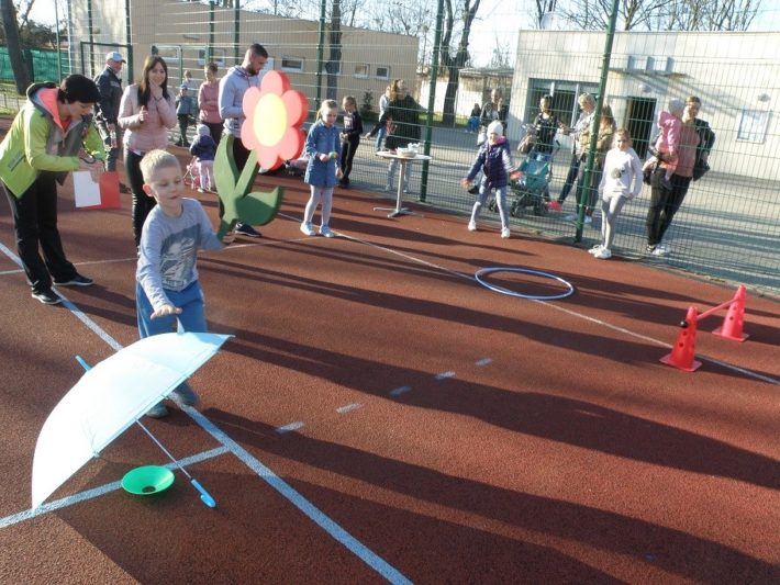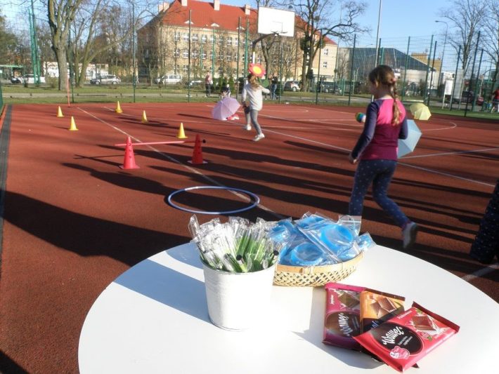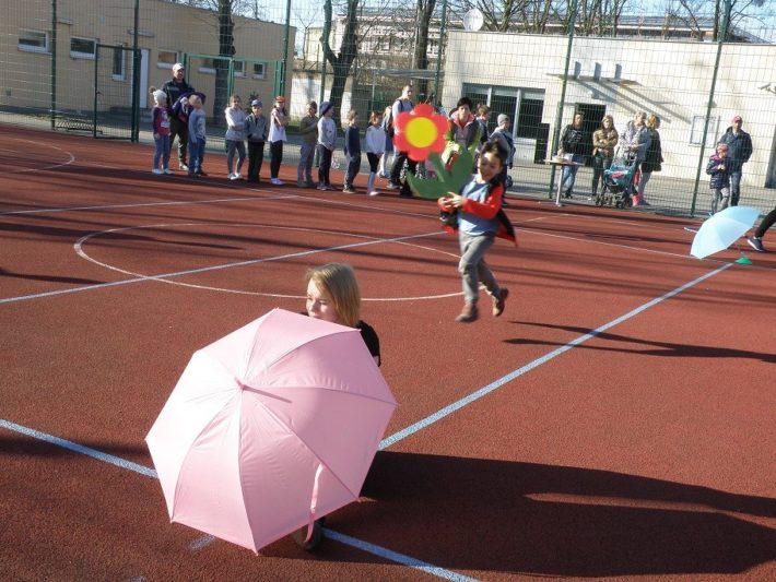 W piękne, ciepłe kwietniowe popołudnie powitaliśmy wiosnę. Przy muzyce, w miłej atmosferze dzieci i młodzież rywalizowała w konkurencjach sportowych na wesoło. Bieg z jajem między przeszkodami, slalom z kwiatem wokół parasoli i rzuty do celu „czym popadnie” to wyzwania sprawnościowe, które wykonywali ze śmiechem wszyscy chętni do zabawy. Swoim dzieciom kibicowali rodzice, a odważni sami próbowali sił w konkurencjach. Wszyscy uczestnicy otrzymali mały podarunek, a z zwycięzcy dodatkowo słodka czekoladę.