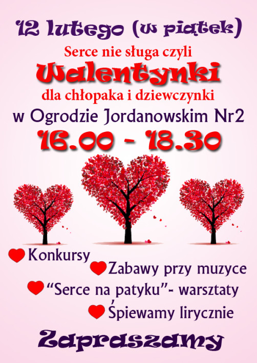 „Serce nie sługa czyli Walentynki dla chłopaka i dziewczynki” to impreza okazjonalna, która zgromadziła wychowanków do wspólnej zabawy. Były warsztaty z dekorowania papierowych „serc na patyku” w technice scrapbookingu, konkursy sprawnościowe „bieg z sercem”, konkurs tańca, nauka piosenki „Serduszko puka w rytmie cza, cza” oraz wiele zabaw przy muzyce. Wszyscy uczestnicy zabawy otrzymali słodki poczęstunek i balony w kształcie serca.
