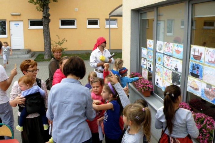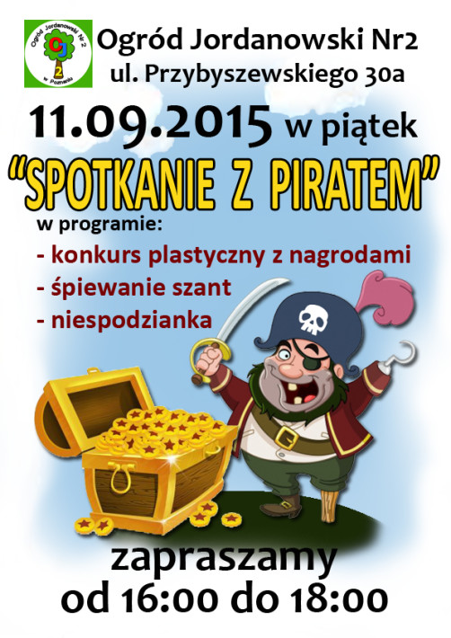 W ramach promocji Ogrodu Jordanowskiego Nr2,  w piątkowe popołudnie  na świeżym powietrzu, przy dźwiękach muzyki odbył się konkurs plastyczny „Spotkanie z piratem”  . Ku radości dzieci przybył osobiści „Pirat – Hak”, który umilał czas uczestnikom konkursu opowieściami o swoich przygodach, pozował do zdjęć i  zachęcał do udziału w zajęciach stałych w placówce.  W przerwie, między wykonaniem i ekspozycją  prac , a ogłoszeniem wyników  konkursu, pani Kamila Krawczyk rozśpiewała wszystkich uczestników żeglarskimi piosenkami –  szantami.