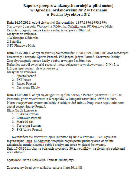 W dniu 17-08-2011 odbył się na terenie Ogrodu Jordanowskiego Nr 2 Turniej Piłki Nożnej.