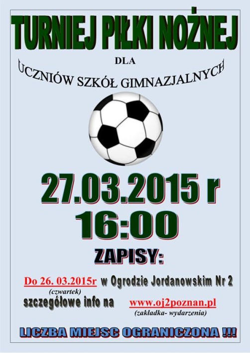 Ogród Jordanowski Nr 2 cyklicznie organizuje turnieje sportowe dla reprezentacji szkół i tzw. „dzikich drużyn”. Od piątkowego popołudnia zespoły: Zawisza Grunwald, FC Kermiole, FC Familia, AC Pajace i UKS Kopernik Poznań rywalizowały systemem „każdy z każdym” o zwycięstwo. Poziom był bardzo wysoki, a o końcowej klasyfikacji zadecydowało ostatnie spotkanie turnieju pomiędzy FC Familia a UKS Kopernik Poznań. Do połowy spotkania inicjatywa należała do drużyny FC Familia, która wyszła na prowadzenie 2:0. Chwilę później kontaktową bramkę dla UKS Kopernik Poznań z rzuty karnego zdobył Bartosz Grasza i rozpoczęło się oblężenie bramki rywali, którzy nie pozwolili doprowadzić do remisu i sięgnęli po puchar.