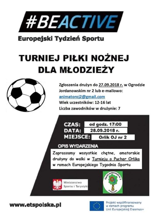 W ramach Europejskiego Tygodnia Sportu w Ogrodzie Jordanowskim nr 2 odbył się Turniej Piłki Nożnej o Puchar Orlika. Zespoły młodzieżowe rywalizowały ze sobą w przyjaznej atmosferze w systemie „każdy z każdym”. Gratulujemy zwycięzcom.