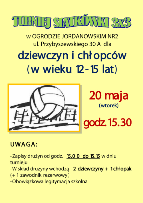 W dniu 20-05-2014 w Ogrodzie Jordanowskim Nr 2 rozegrany został turniej siatkówki. Do rywalizacji przystąpiło 5 drużyn, które grały systemem każdy z każdym o nagrodę specjalną – ciasto czekoladowe.