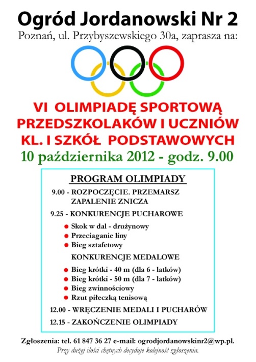 W dniu 10-10-2012 w Ogrodzie Jordanowskim Nr 2 miało miejsce coroczne święto dla najmłodszych sportowców. Była to VI Olimpiada Sportowa Przedszkolaków oraz Uczniów klas I Szkół Podstawowych.