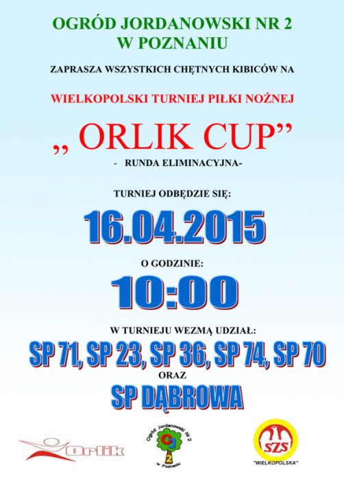Turniej eliminacyjny Orlik Cup odbył się w czwartek na Orliku zlokalizowanym w Ogrodzie Jordanowskim Nr 2 i zakończył się zwycięstwem Szkoły Podstawowej Nr 71 w Poznaniu.