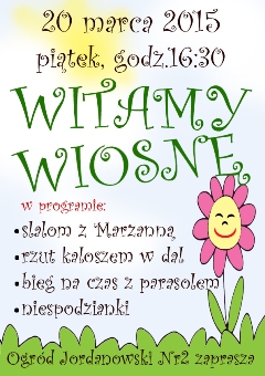 W przeddzień kalendarzowej wiosny w Ogrodzie Jordanowskim Nr 2 odbyły się zabawy sportowe na wesoło. Wykonana przez dzieci „Marzanna” została uroczyście przeniesiona ze świetlicy na boisko Orlik. Konkurencje takie jak: slalom z „Marzanną”, rzut kaloszem sołtysa w dal, bieg na czas z parasolem, rzut kapeluszem do celu umiliły słoneczne popołudnie. Impreza zgromadziła wielu uczestników z towarzyszącymi rodzicami i opiekunami. Dzieci zostały podzielone na trzy kategorie wiekowych. Zabawie towarzyszyła muzyka a starania i wysiłki dzieci zostały nagrodzone czekoladowym poczęstunkiem.