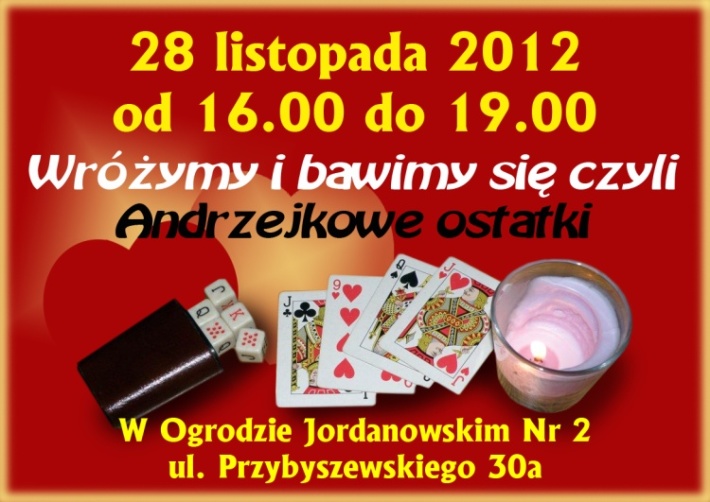 W dniu 28-11-2012 odbyła się w świetlicy OJ Nr 2 zabawa andrzejkowa połączona z wróżbami i konkursami. Było lanie wosku na zimną wodę przez ucho od klucza i odczytywanie przyszłości z cienia rzucanego przez zastygłą masę. Rzucanie lotkami do przyklejonych papierowych serduszek, na których napisane były imiona, dziewczyn na jednej, a chłopców na drugiej stronie tablicy. W ten sposób uczestnicy zabawy „polowali” na imiona swoich przyszłych sympatii.