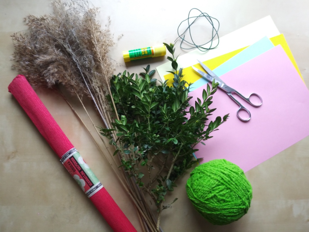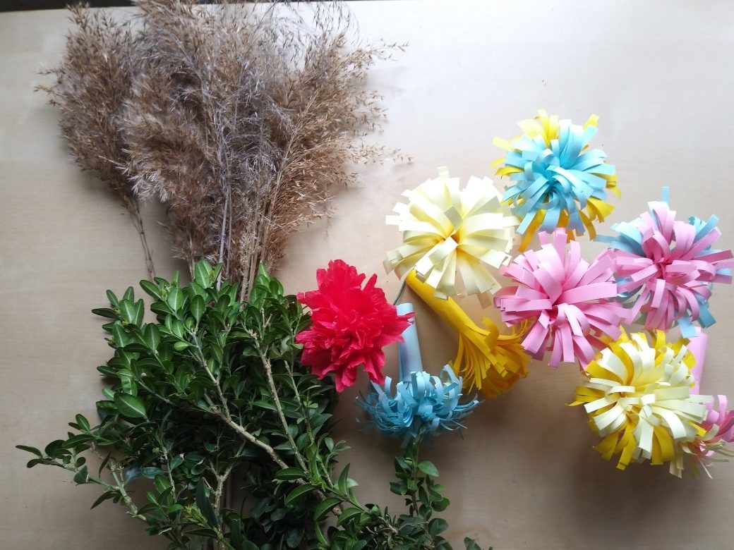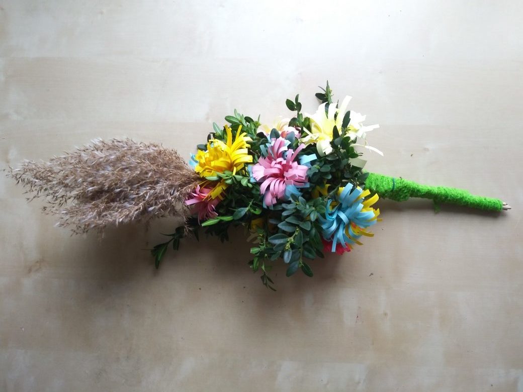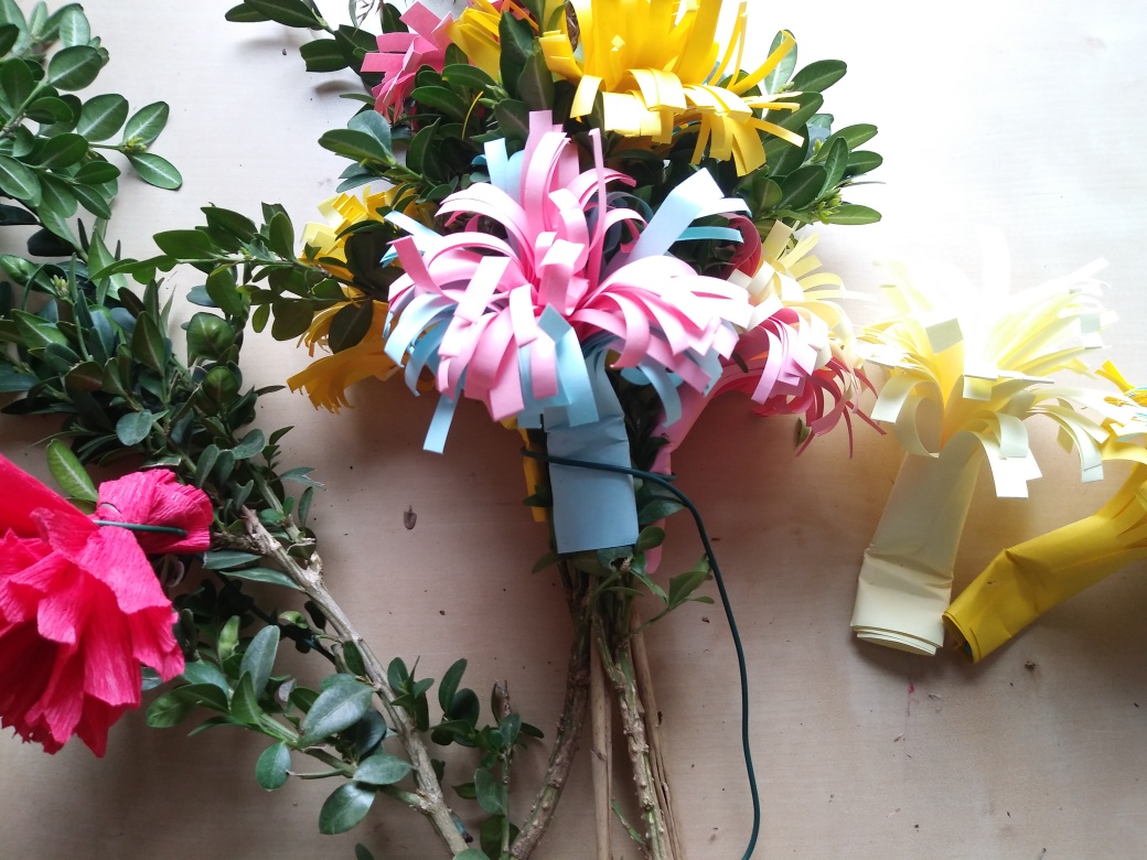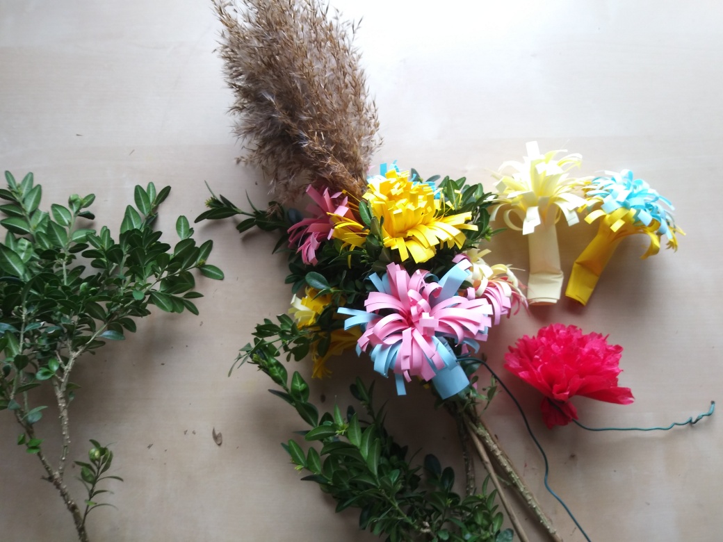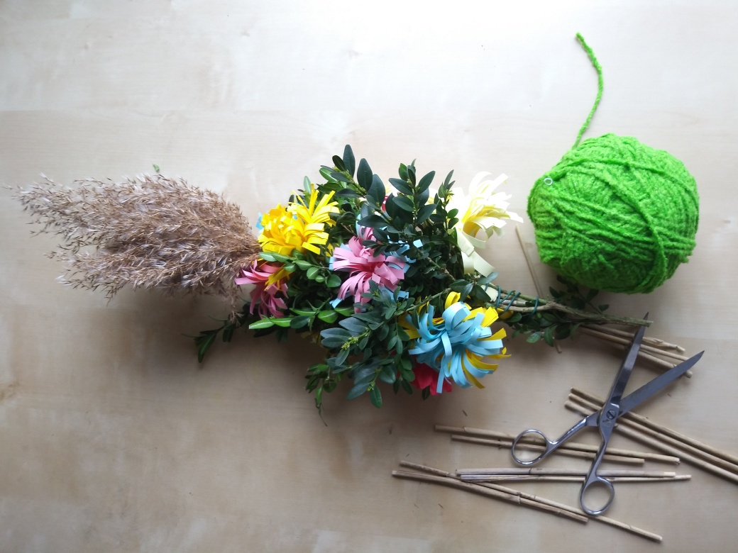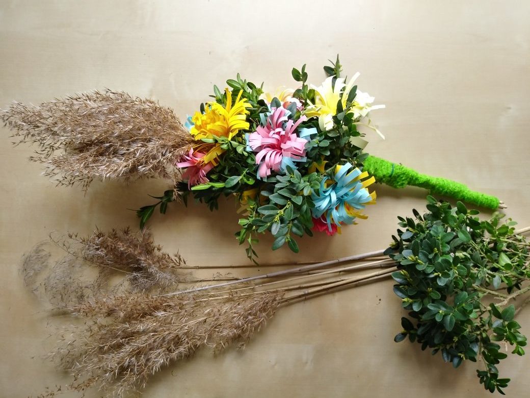 - zgromadzić materiały (gałązki, trawy, bazie, bukszpan, kolorowy papier, krepę, nożyczki, klej, drut) i zrobić kolorowe kwiaty