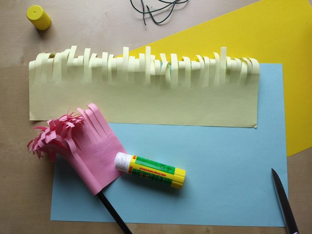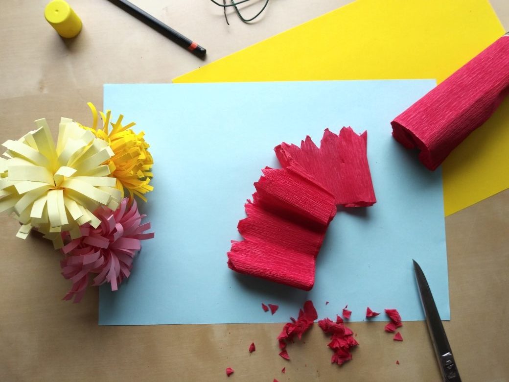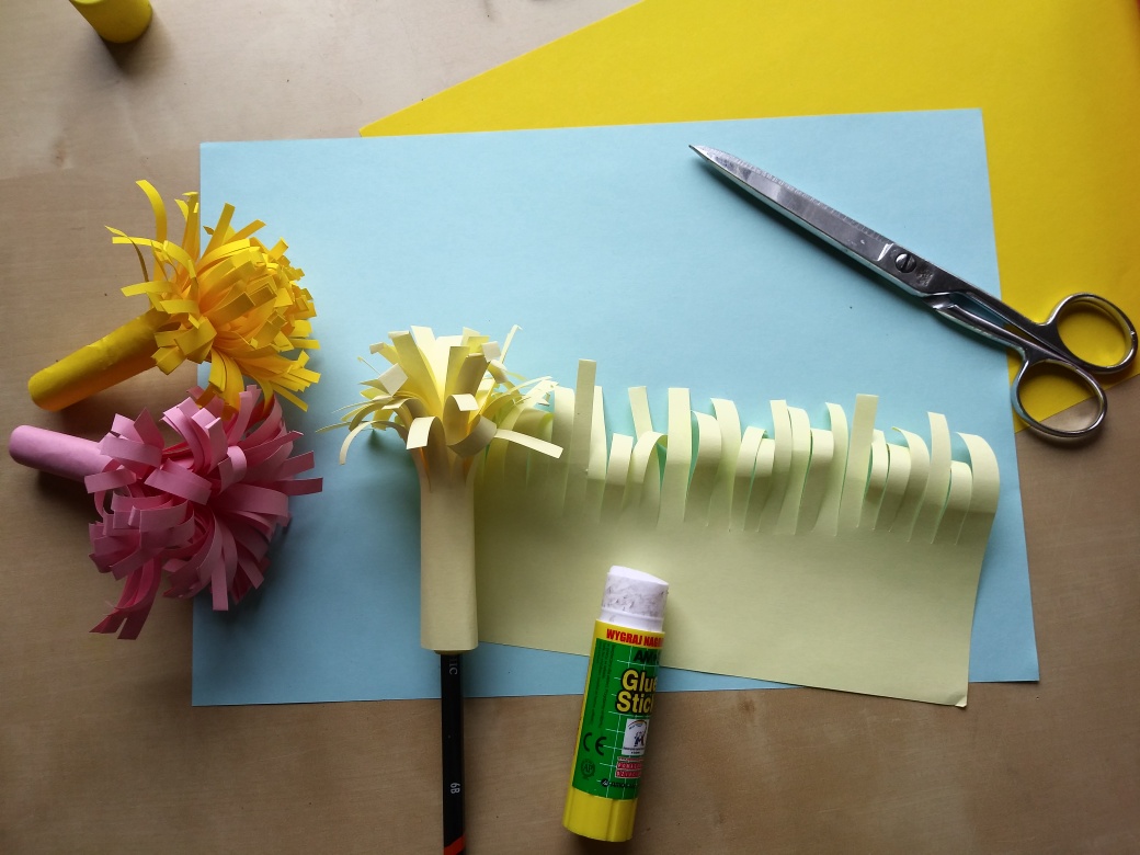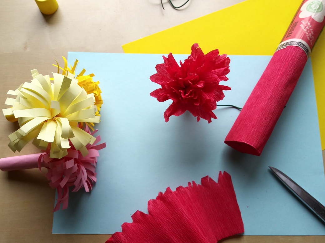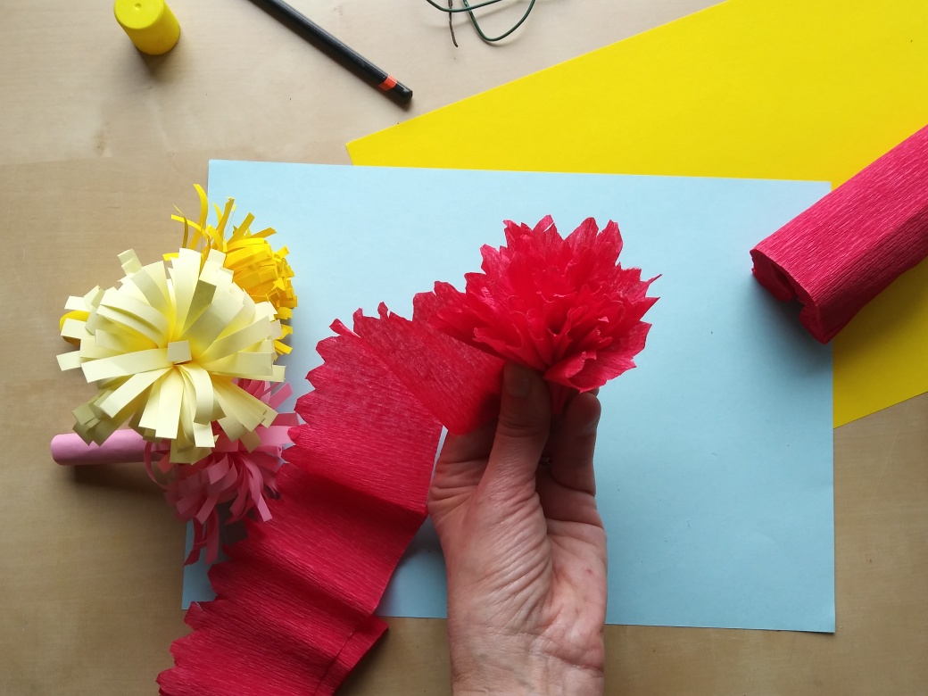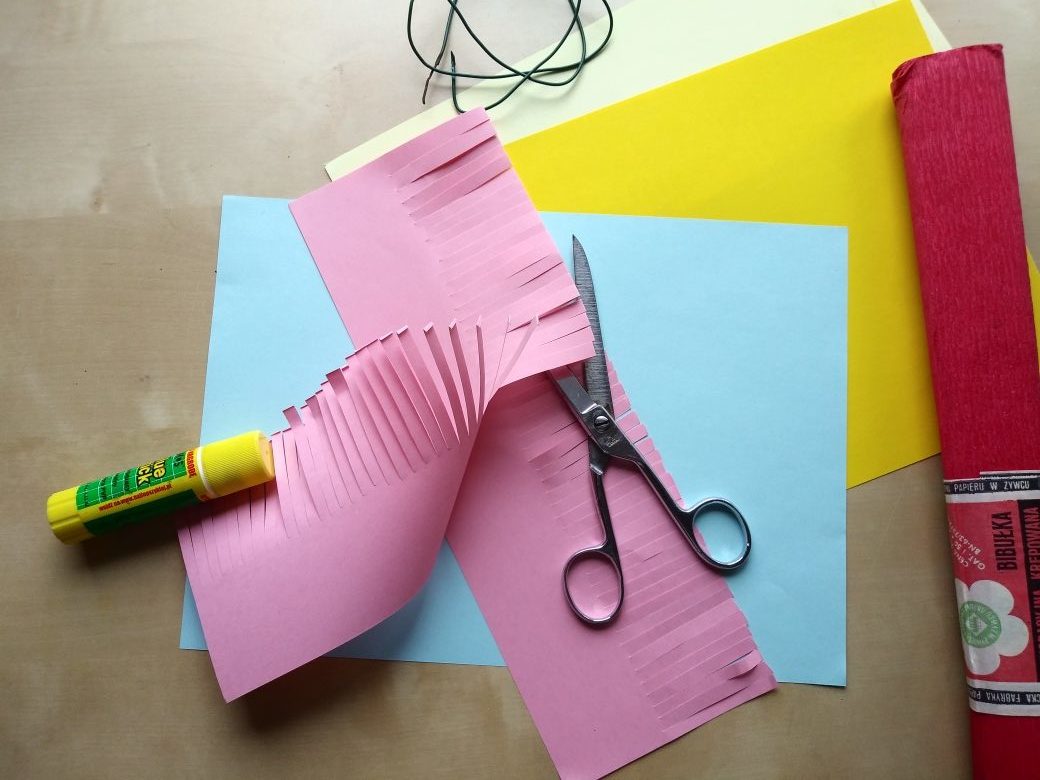 - zgromadzić materiały (gałązki, trawy, bazie, bukszpan, kolorowy papier, krepę, nożyczki, klej, drut) i zrobić kolorowe kwiaty