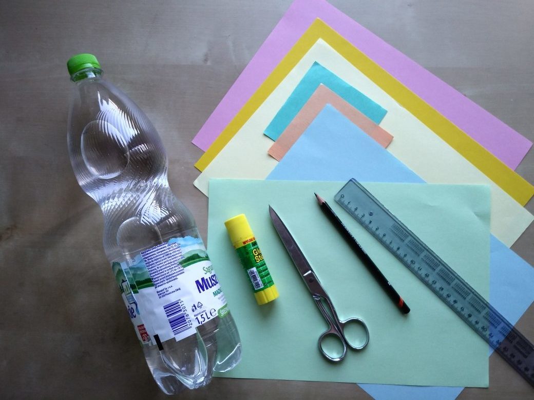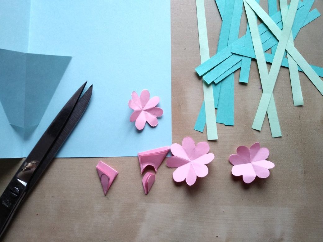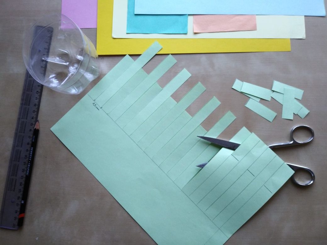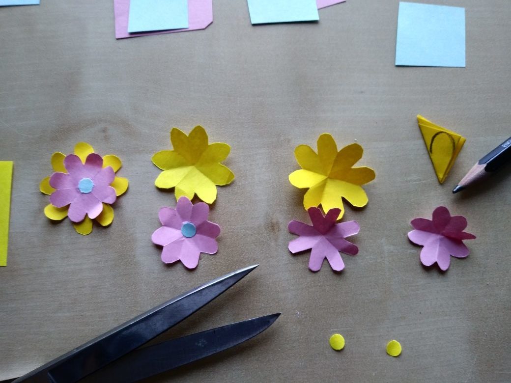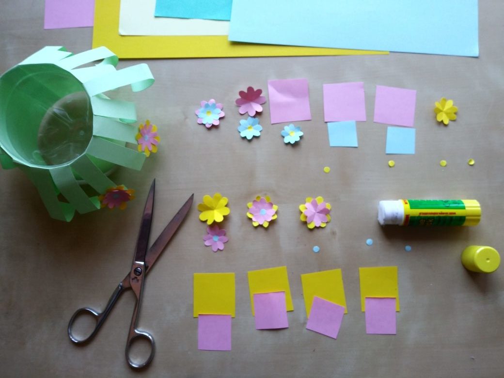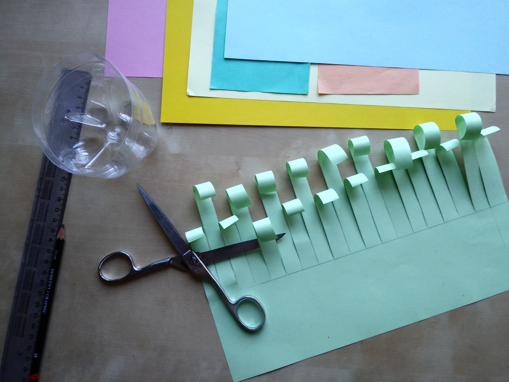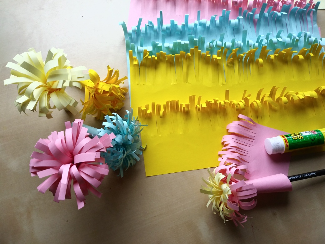 - zgromadzić materiały (gałązki, trawy, bazie, bukszpan, kolorowy papier, krepę, nożyczki, klej, drut) i zrobić kolorowe kwiaty
