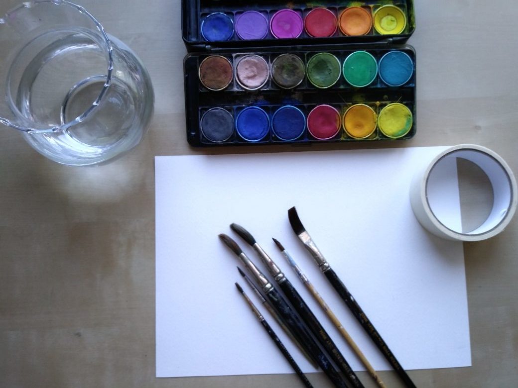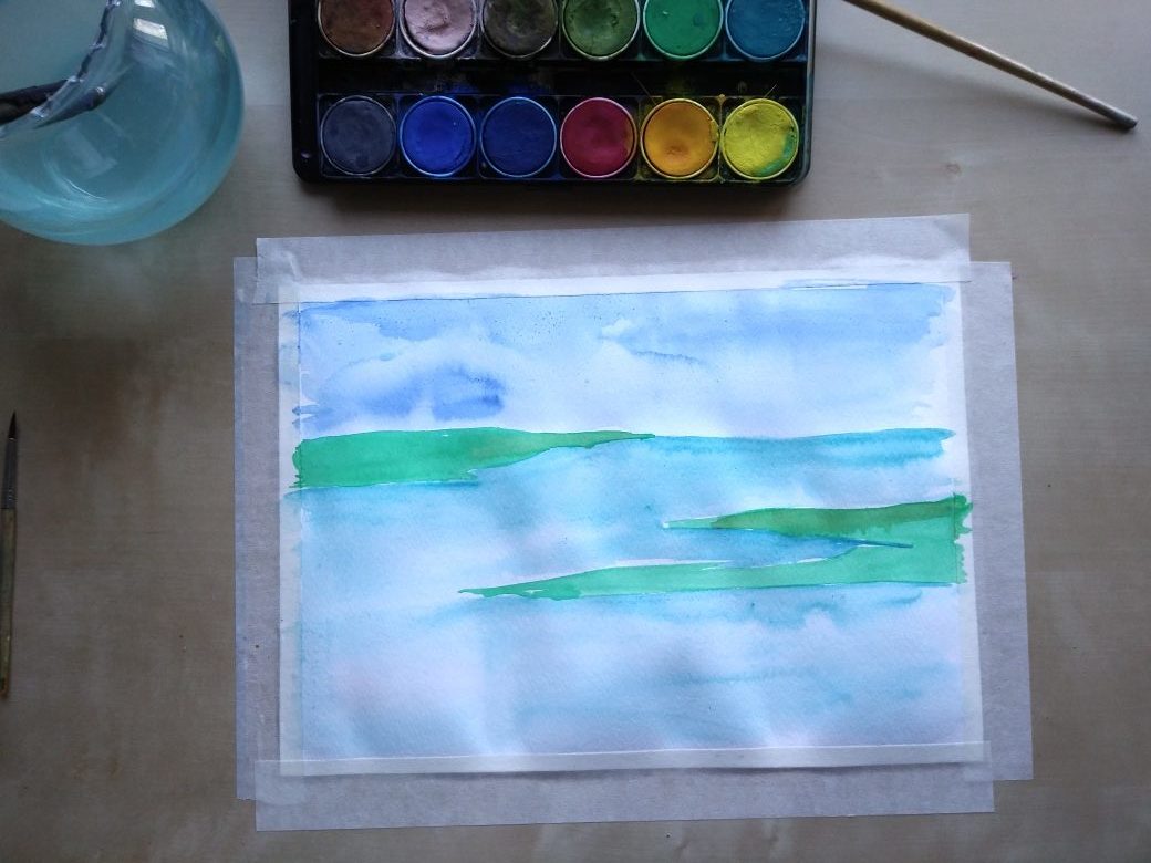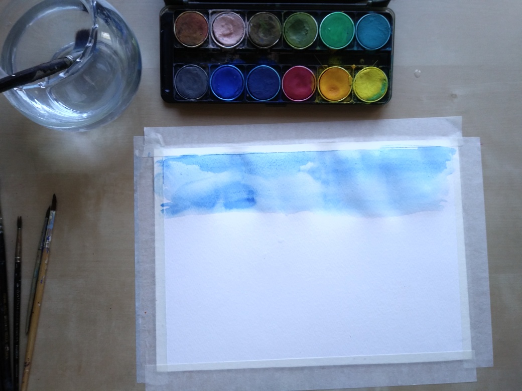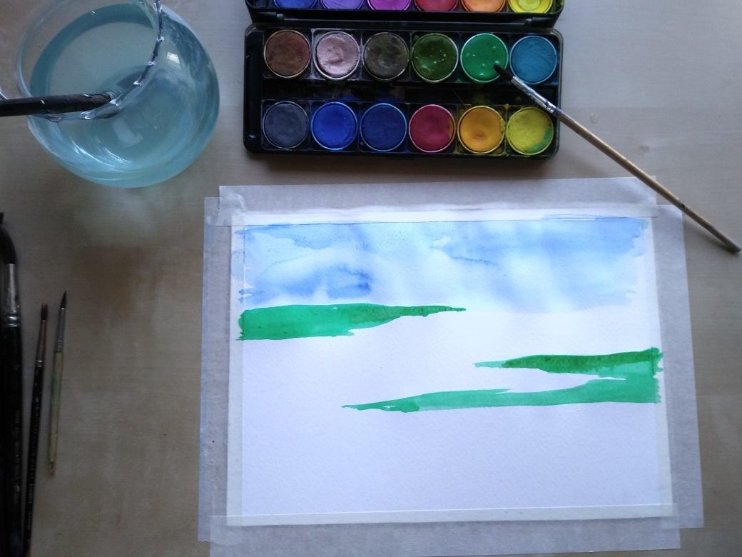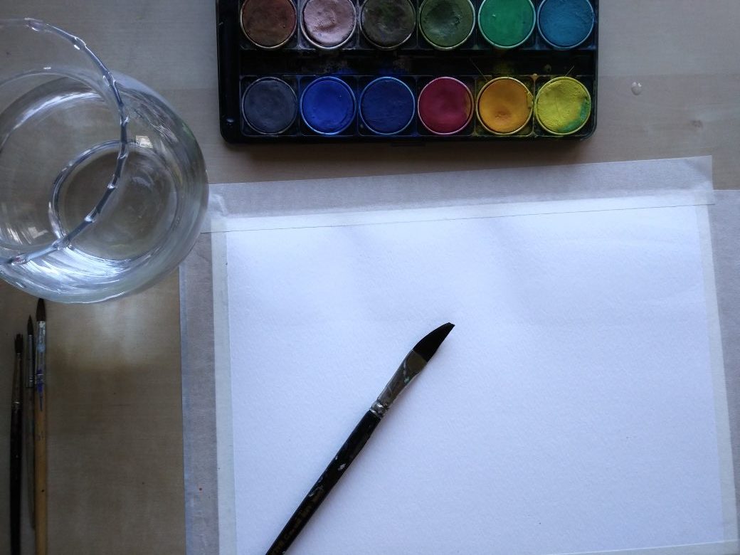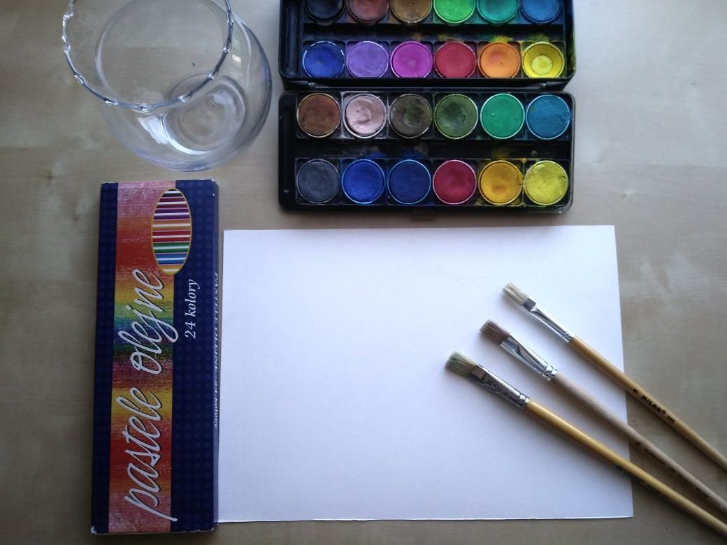 By wykorzystać wszystkie możliwości farb akwarelowych potrzebny jest dobry podkład. Malujemy na grubym papierze dobrze wchłaniającym wilgoć. Akwarele lubią dużo wody. Papier przyklejamy taśmą malarską by się nie deformował podczas pracy. Płaszczyznę, którą chcemy pomalować moczymy wodą. Zaczynamy malować od jasnych kolorów. Nakładając kolejne warstwy czekamy, aż poprzednia wyschnie. Kieruj się poniższą instrukcją i maluj. Powodzenia.