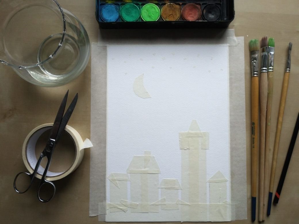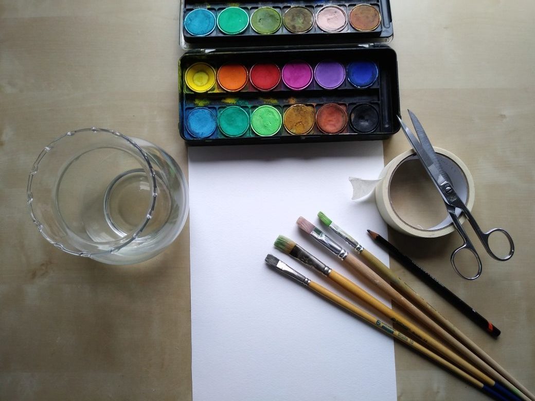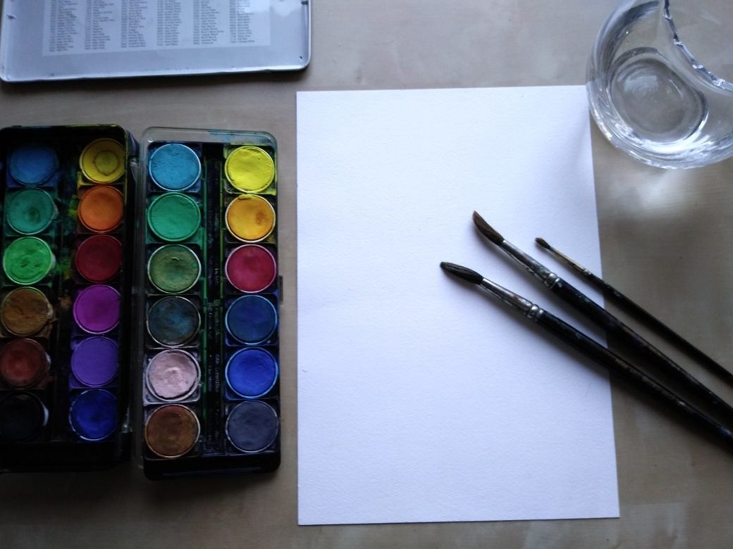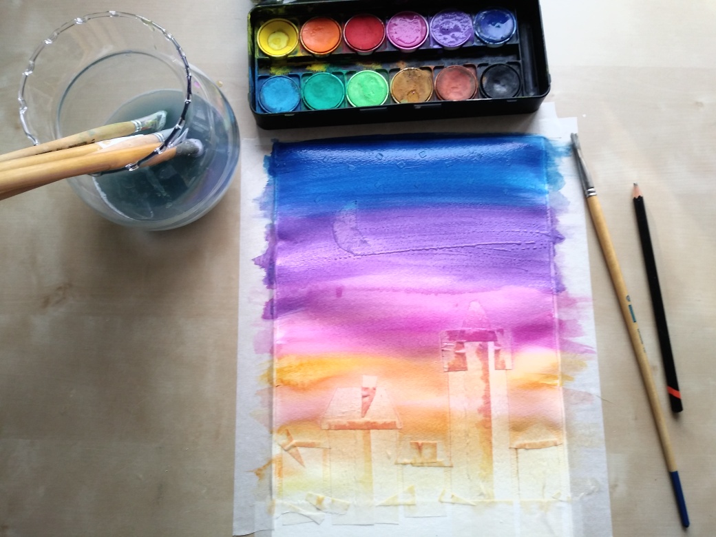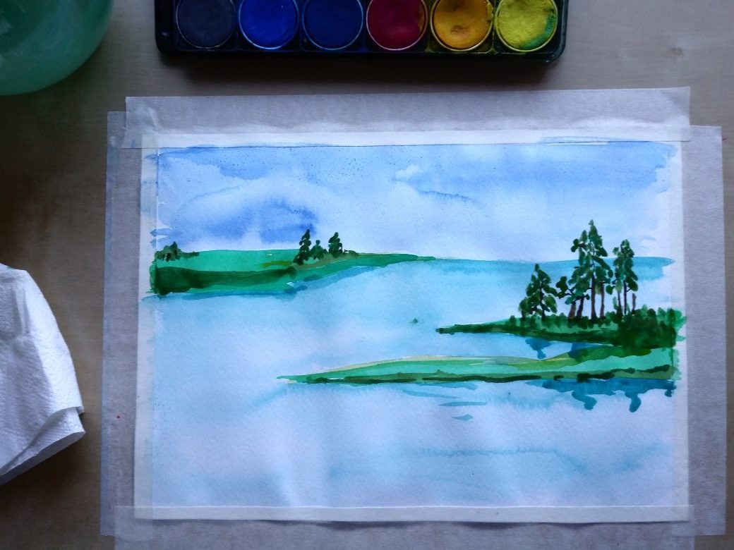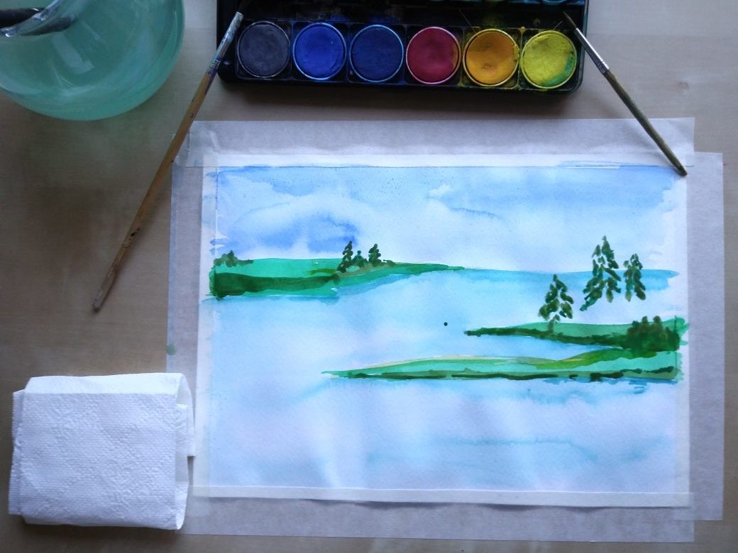 By wykorzystać wszystkie możliwości farb akwarelowych potrzebny jest dobry podkład. Malujemy na grubym papierze dobrze wchłaniającym wilgoć. Akwarele lubią dużo wody. Papier przyklejamy taśmą malarską by się nie deformował podczas pracy. Płaszczyznę, którą chcemy pomalować moczymy wodą. Zaczynamy malować od jasnych kolorów. Nakładając kolejne warstwy czekamy, aż poprzednia wyschnie. Kieruj się poniższą instrukcją i maluj. Powodzenia.