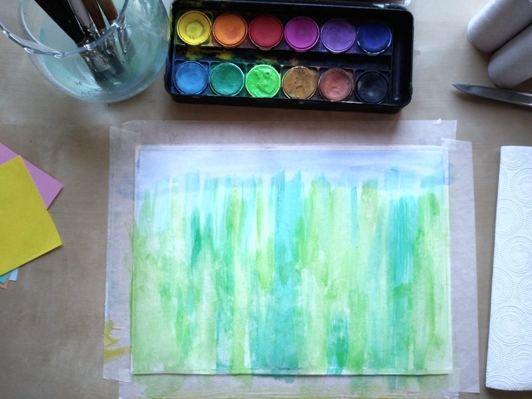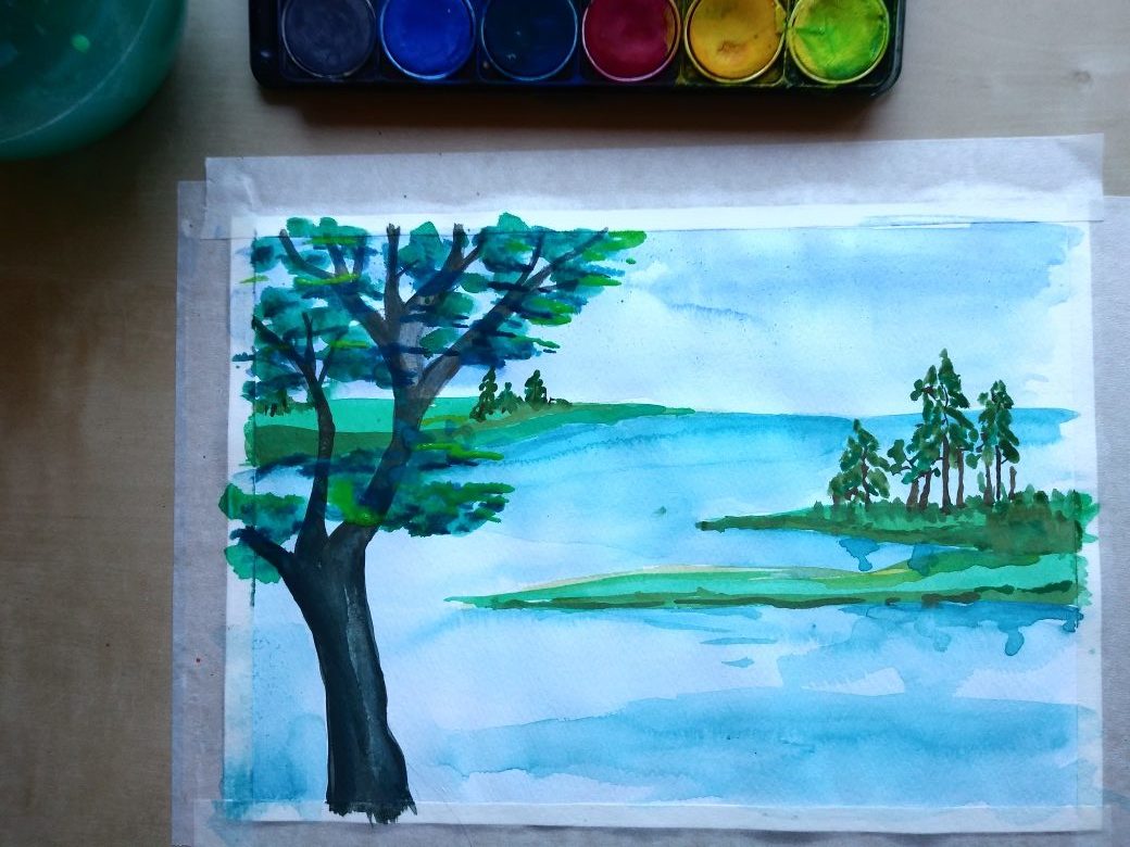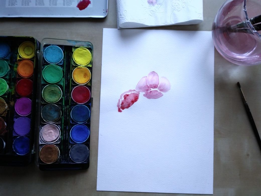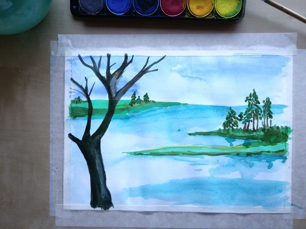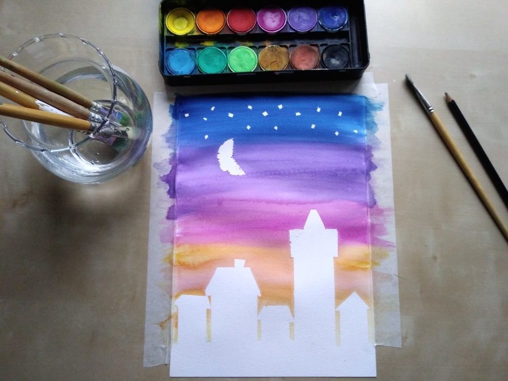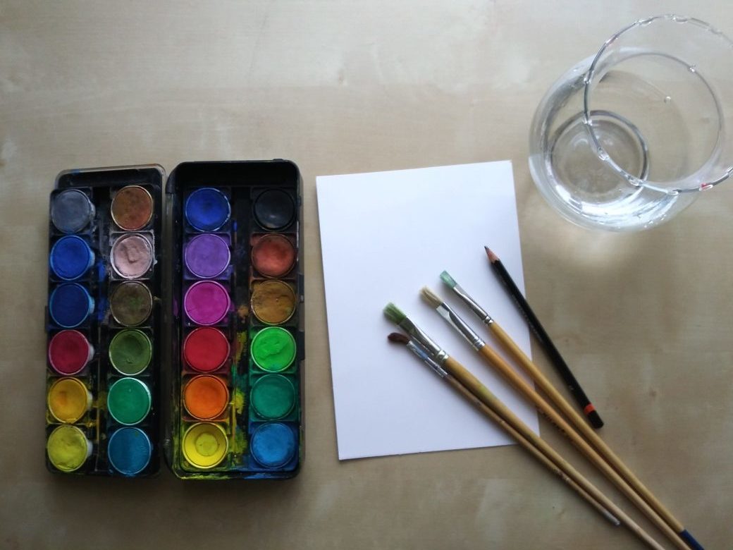By wykorzystać wszystkie możliwości farb akwarelowych potrzebny jest dobry podkład. Malujemy na grubym papierze dobrze wchłaniającym wilgoć. Akwarele lubią dużo wody. Papier przyklejamy taśmą malarską by się nie deformował podczas pracy. Płaszczyznę, którą chcemy pomalować moczymy wodą. Zaczynamy malować od jasnych kolorów. Nakładając kolejne warstwy czekamy, aż poprzednia wyschnie. Kieruj się poniższą instrukcją i maluj. Powodzenia.