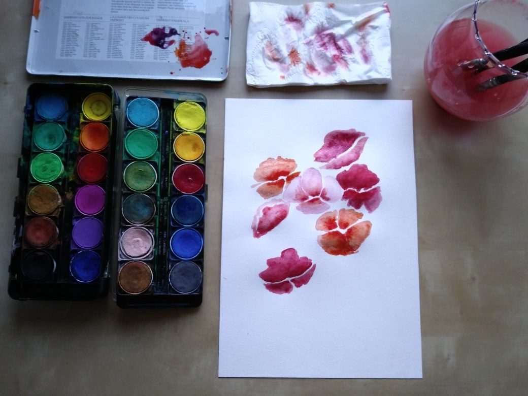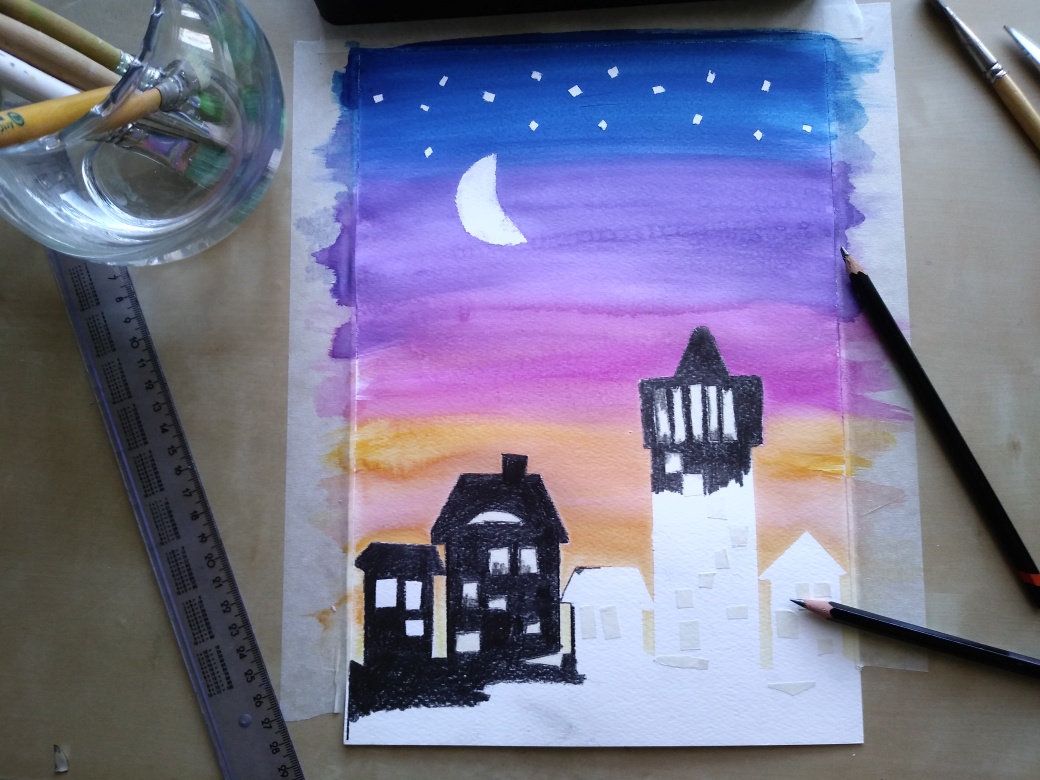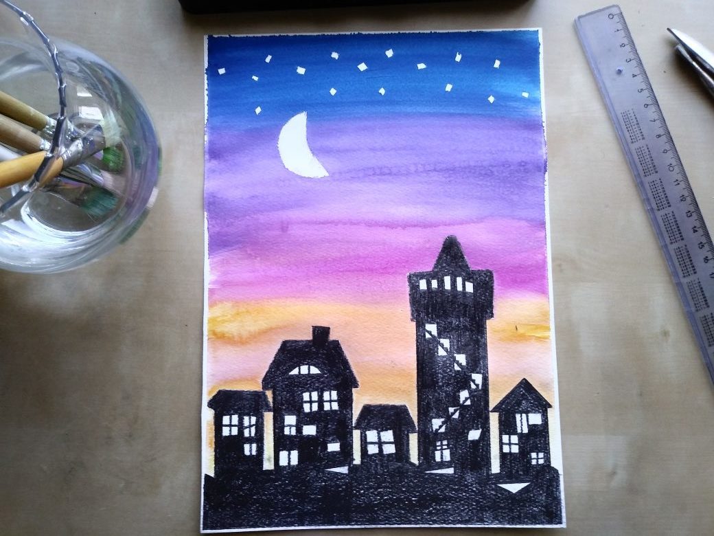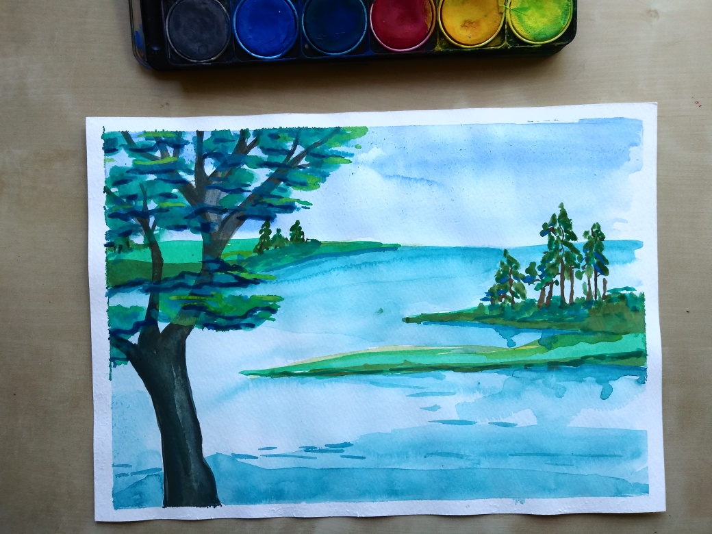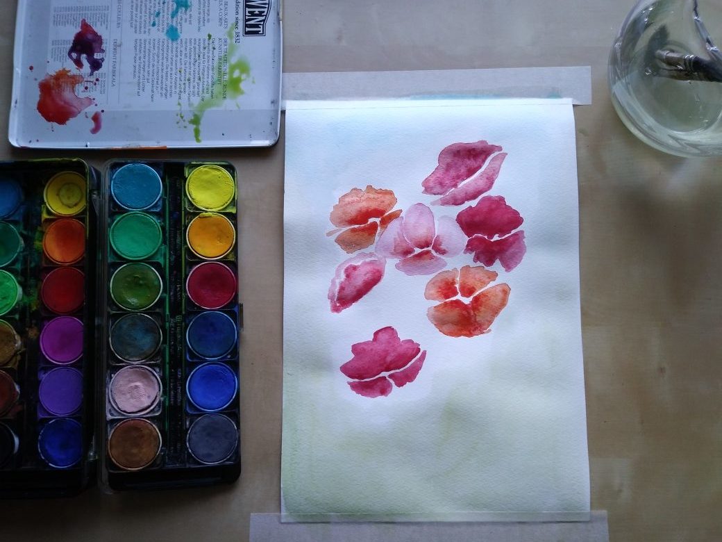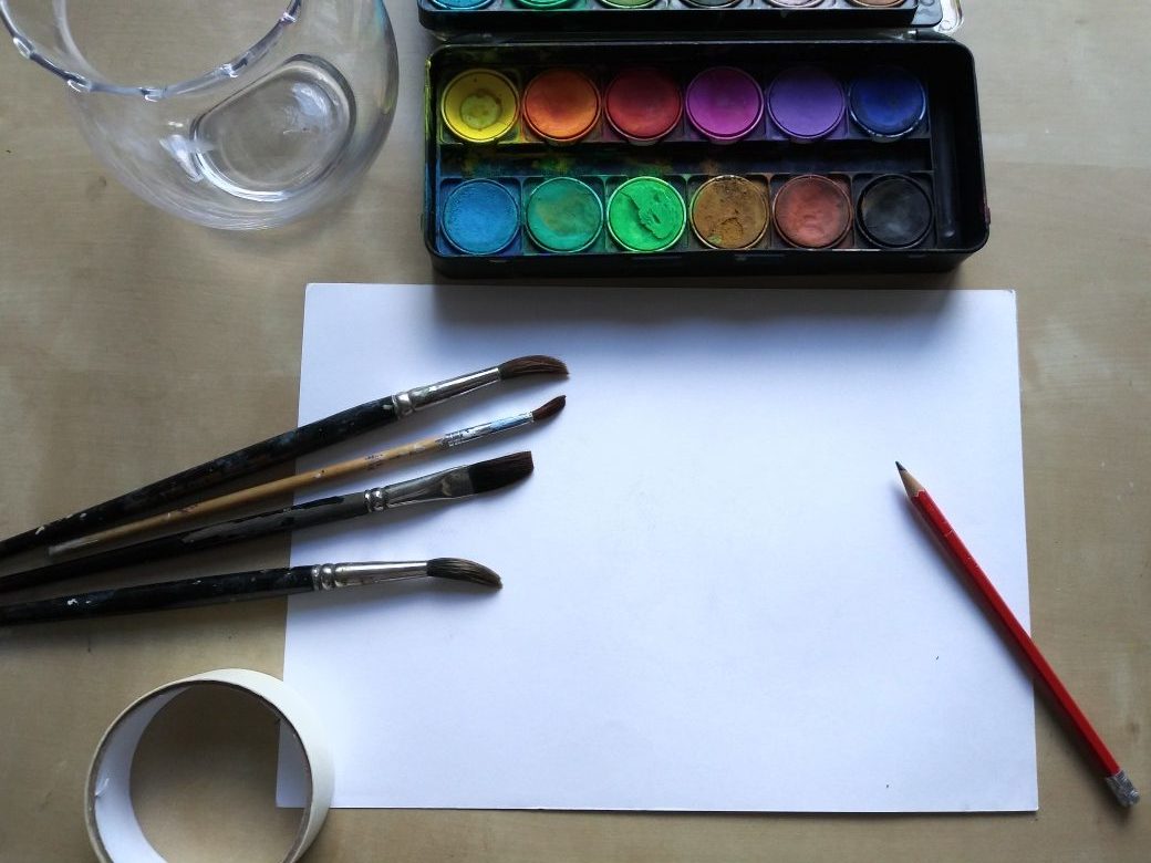By wykorzystać wszystkie możliwości farb akwarelowych potrzebny jest dobry podkład. Malujemy na grubym papierze dobrze wchłaniającym wilgoć. Akwarele lubią dużo wody. Papier przyklejamy taśmą malarską by się nie deformował podczas pracy. Płaszczyznę, którą chcemy pomalować moczymy wodą. Zaczynamy malować od jasnych kolorów. Nakładając kolejne warstwy czekamy, aż poprzednia wyschnie. Kieruj się poniższą instrukcją i maluj. Powodzenia.