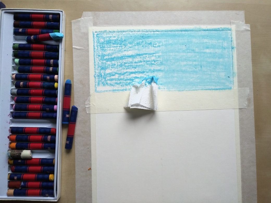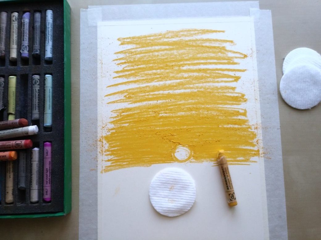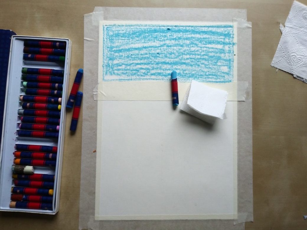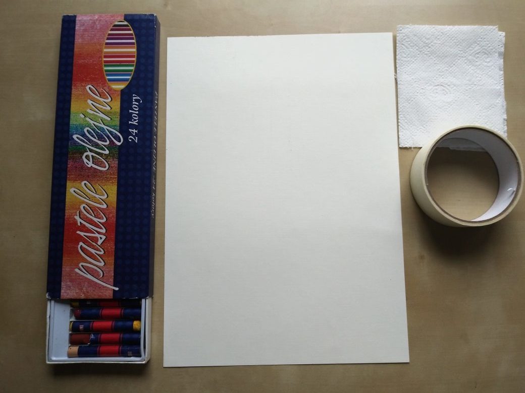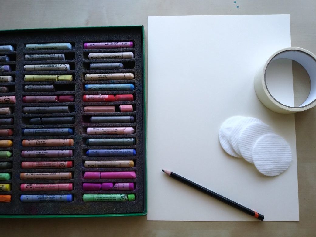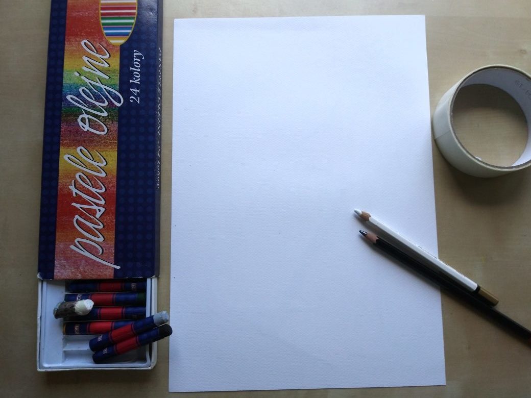 By wykonać rysunek suchymi pastelami potrzebny jest papier o wysokiej gramaturze i z drobną fakturą. Suche pastele są idealne do zapełniania tła, wystarczy parę ruchów kredką, a później tylko techniką rozcierania (palcem lub płatkami do demakijażu) złagodzić przejście pomiędzy odcieniami kolorów. Kolory można nakładać jeden na drugi zaczynając od jasnych. Musimy pamiętać by nie zamazać rysunku w trakcie pracy, więc warto podłożyć czystą kartkę pod dłoń, którą rysujemy. Ostrożnie zdmuchujemy nadmiar kredy, a gdy rysunek jest gotowy werniksujemy go ( może to być lakier do włosów).
