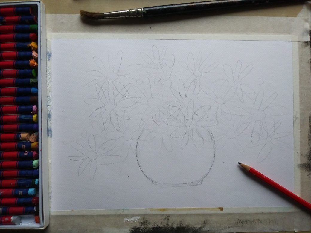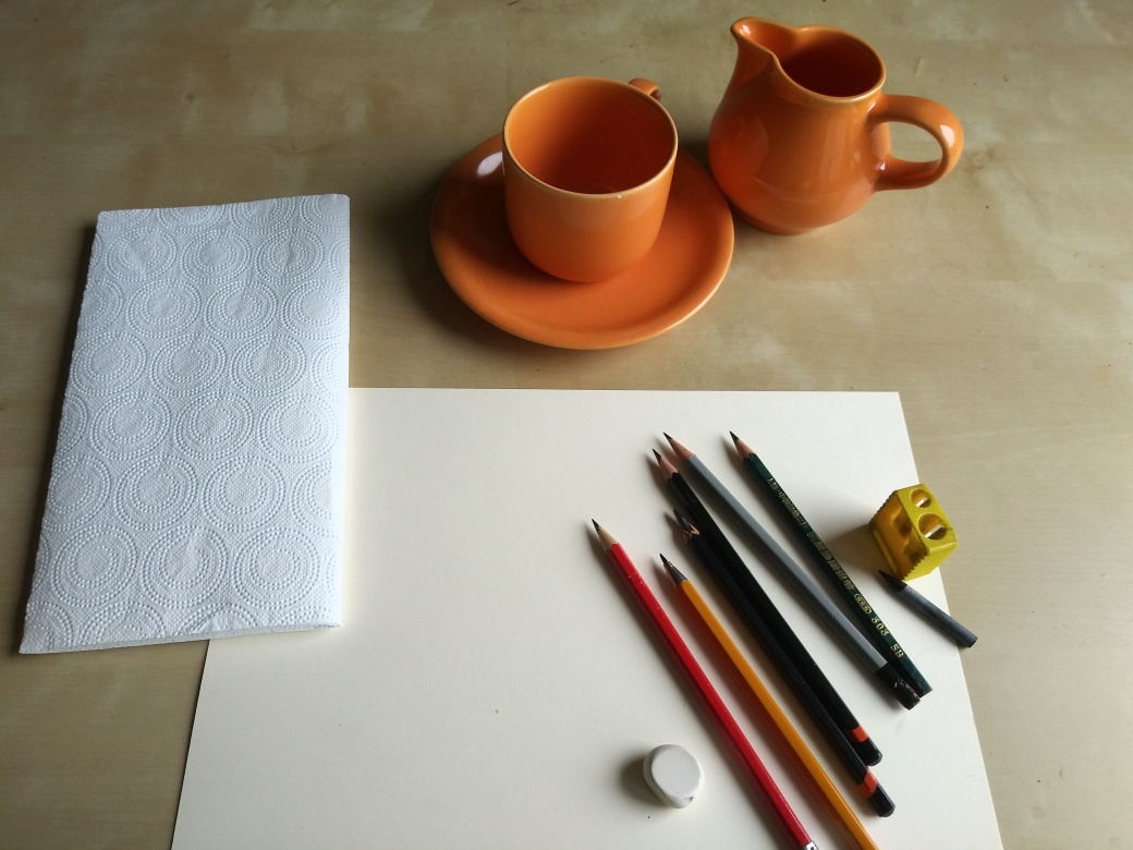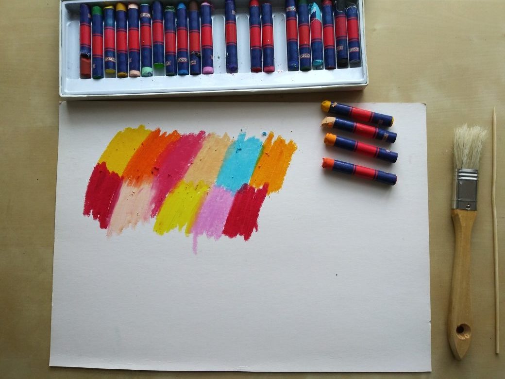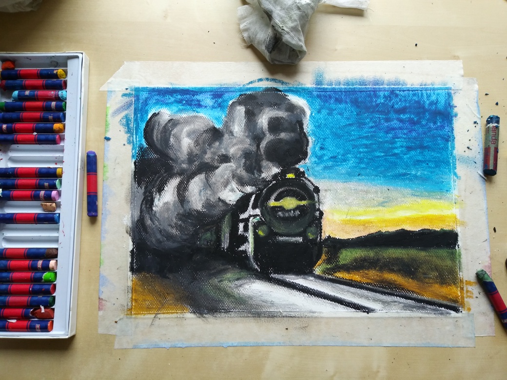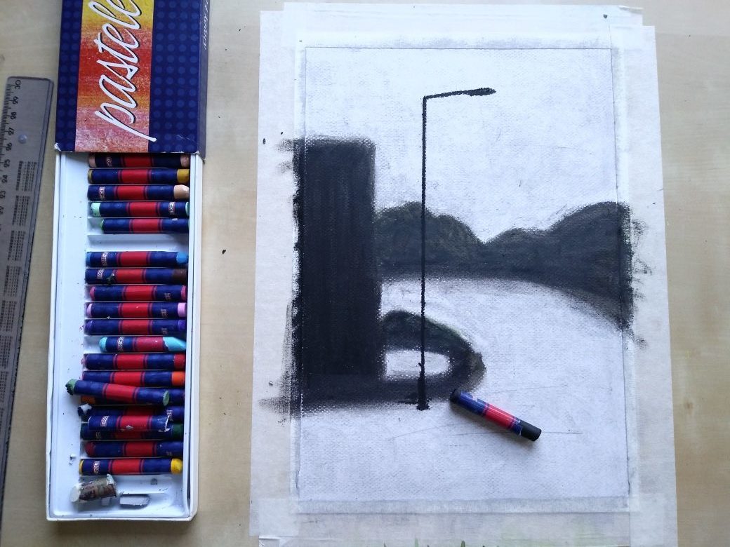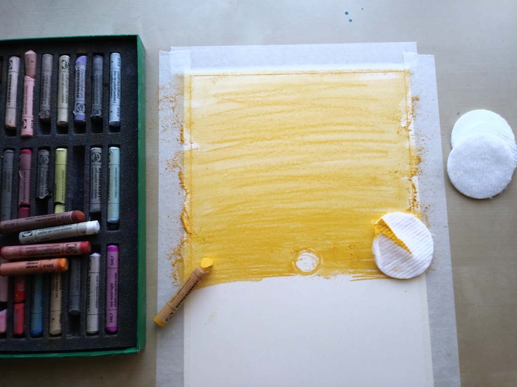 By wykonać rysunek suchymi pastelami potrzebny jest papier o wysokiej gramaturze i z drobną fakturą. Suche pastele są idealne do zapełniania tła, wystarczy parę ruchów kredką, a później tylko techniką rozcierania (palcem lub płatkami do demakijażu) złagodzić przejście pomiędzy odcieniami kolorów. Kolory można nakładać jeden na drugi zaczynając od jasnych. Musimy pamiętać by nie zamazać rysunku w trakcie pracy, więc warto podłożyć czystą kartkę pod dłoń, którą rysujemy. Ostrożnie zdmuchujemy nadmiar kredy, a gdy rysunek jest gotowy werniksujemy go ( może to być lakier do włosów).