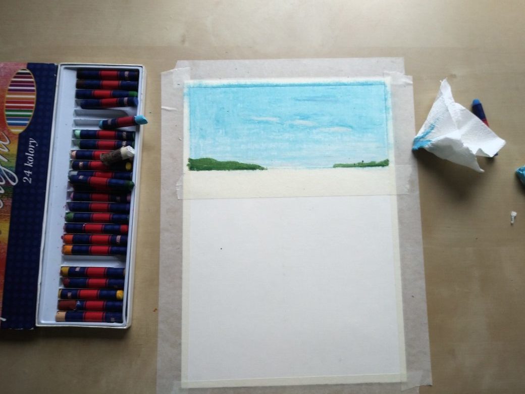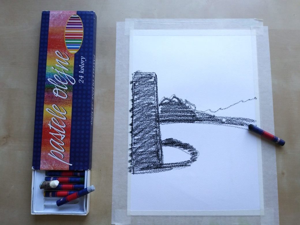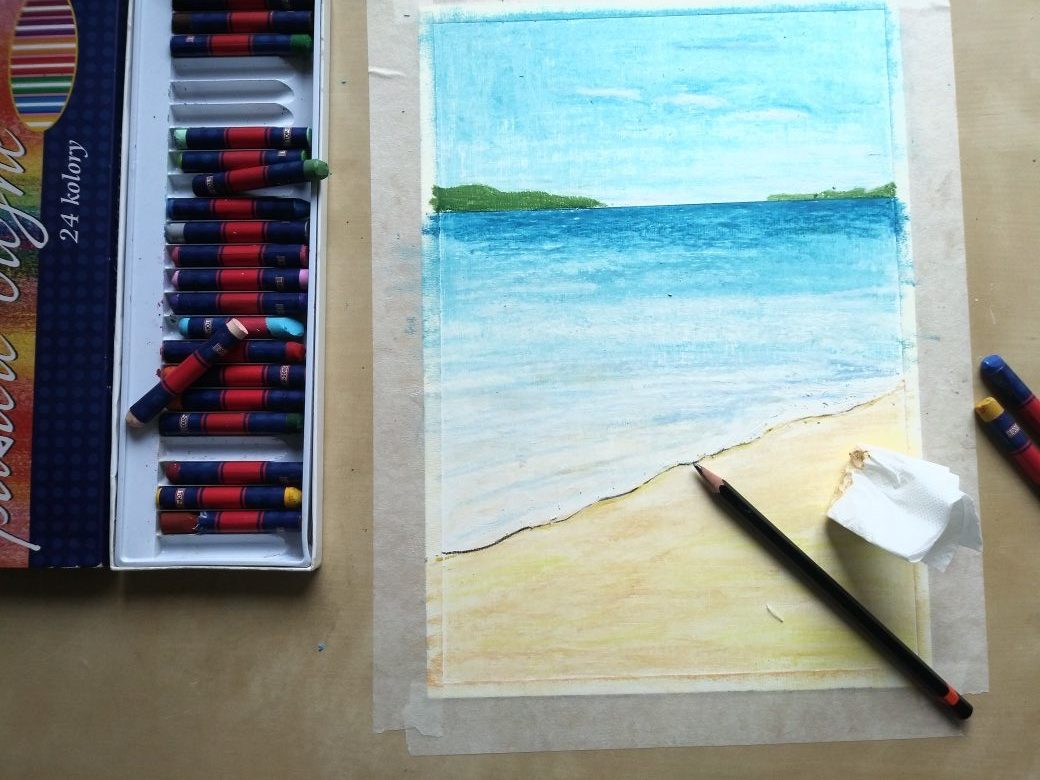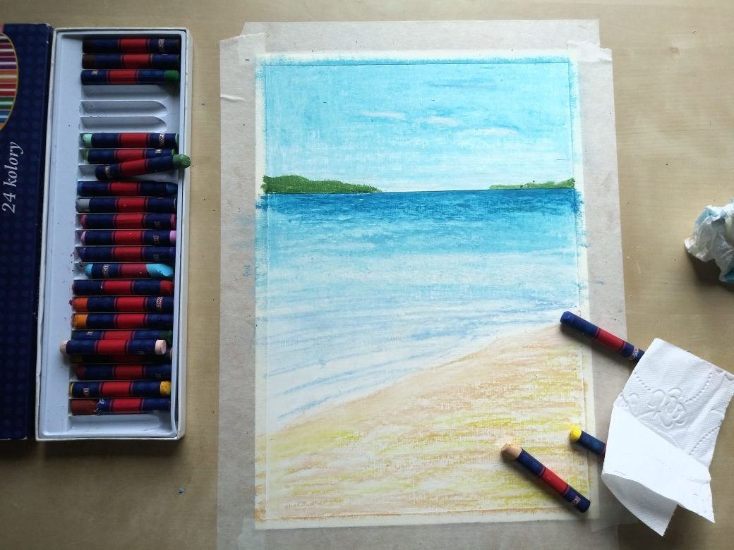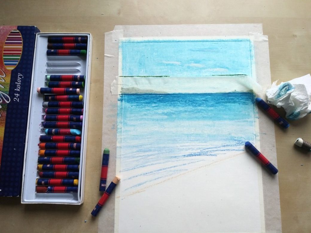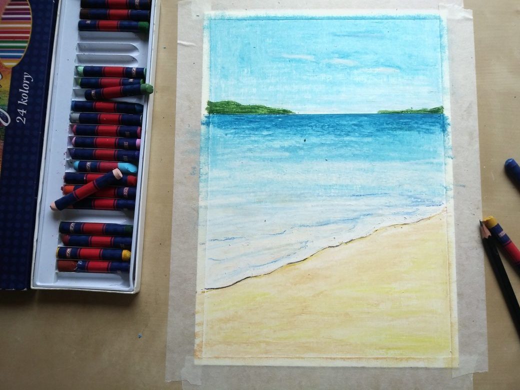 Pejzaż morski to wdzięczny temat, pomoże nam nauczyć się w jaki sposób rysować pastelami olejnymi. Rysunek najlepiej wykonać na papierze o wysokiej gramaturze i drobnej fakturze. Każda warstwę nałożonego koloru rozcieramy miękkim papierem lub szmatką tak by powstały łagodne barwne przejścia. Pastele olejne nakładamy jasne na ciemne lub odwrotnie, w miarę potrzeb. Narzędziem posiadającym krawędź (nożyczki, pilniczek) możemy delikatnie zdrapać źle nałożoną warstwę i jeszcze raz ją zakolorować. Skorzystaj z instrukcji lub stwórz własny pejzaż. Powodzenia.