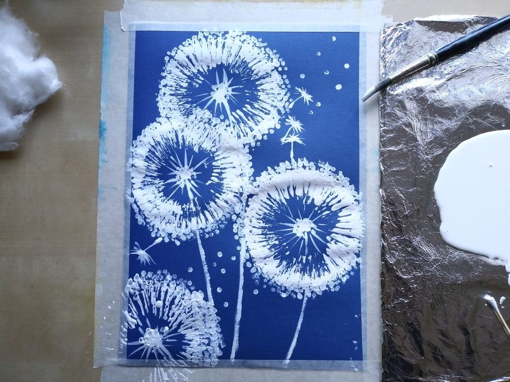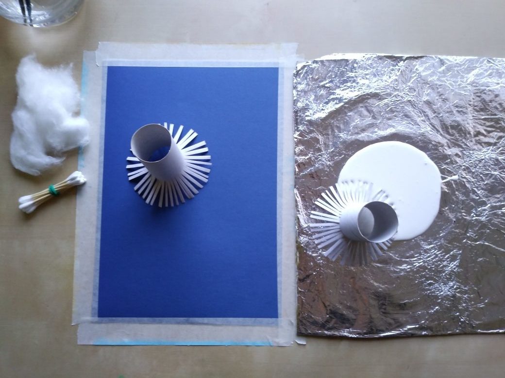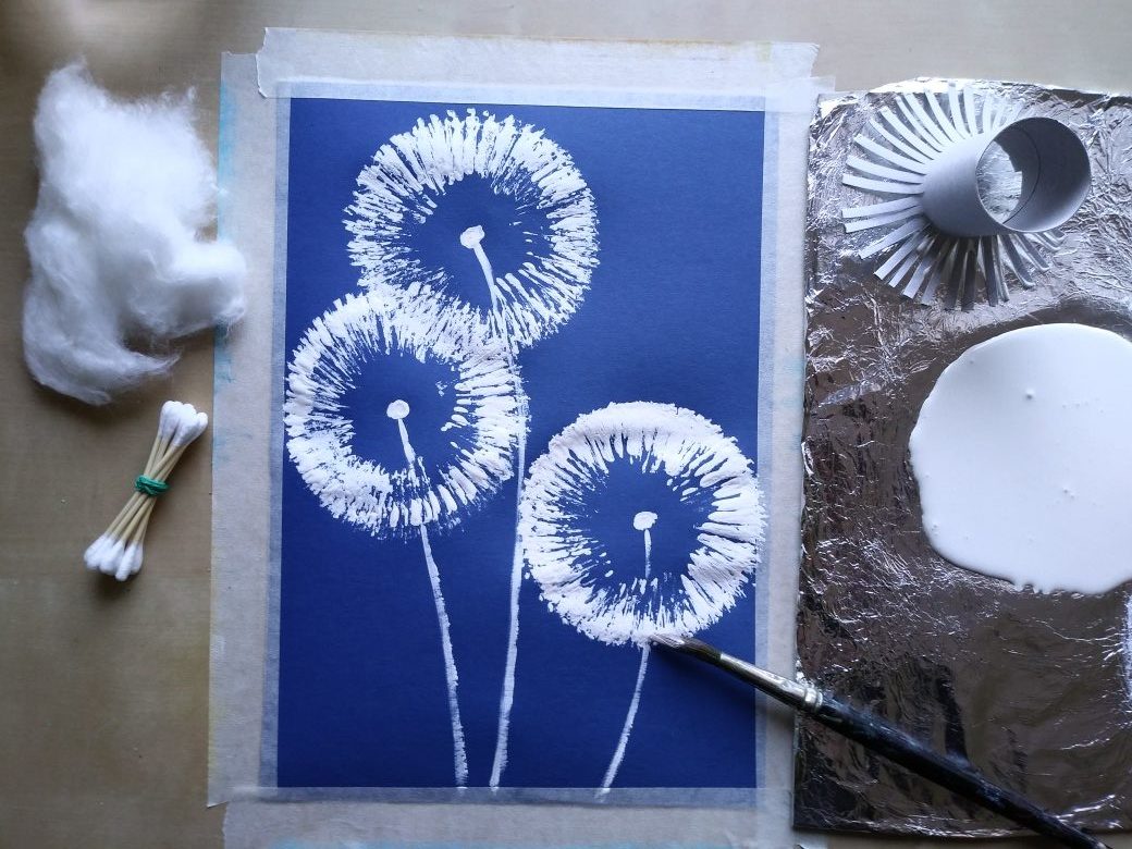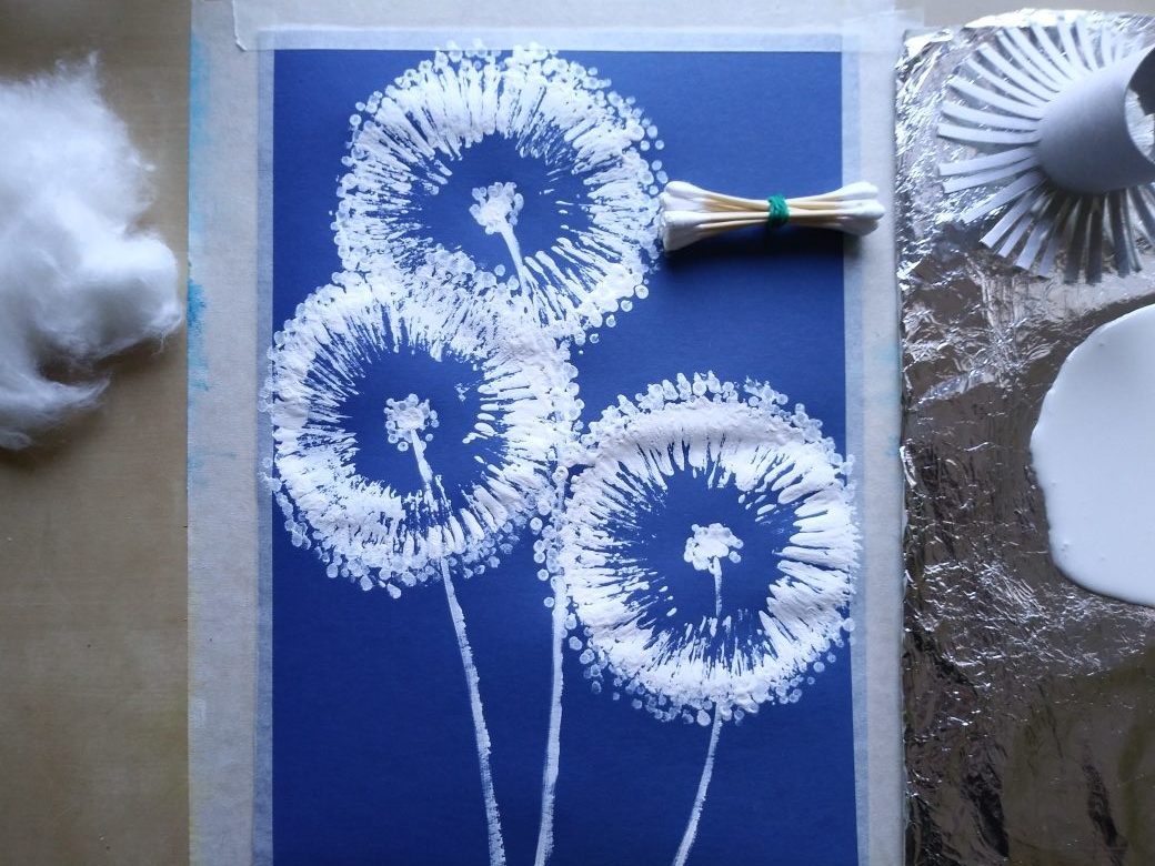 Delikatne dmuchawce malujemy białą farbą akrylową. Do tego celu przygotuj paletę, może to być folia aluminiowa nałożona na karton. Prace wykonaj według instrukcji pokazanej na kolejnych zdjęciach. Pamiętaj, farba akrylowa po wyschnięciu zostawia trwałe plamy. Zabezpiecz swoje miejsce pracy.