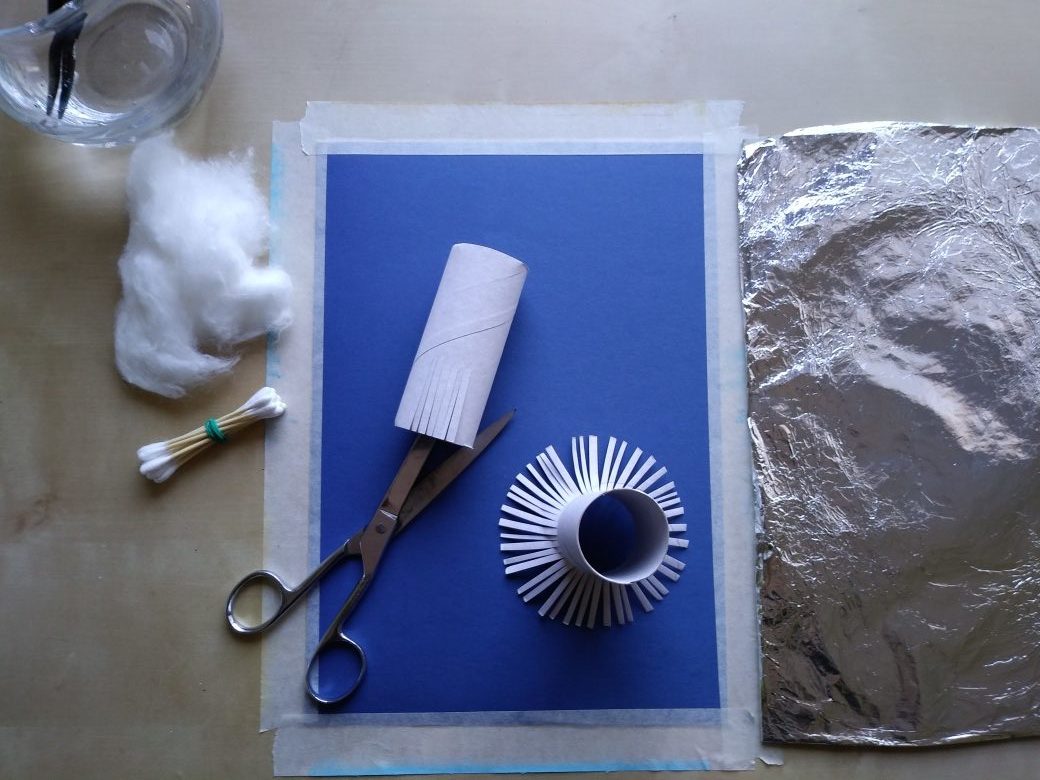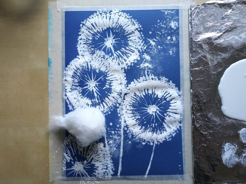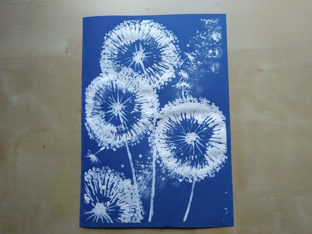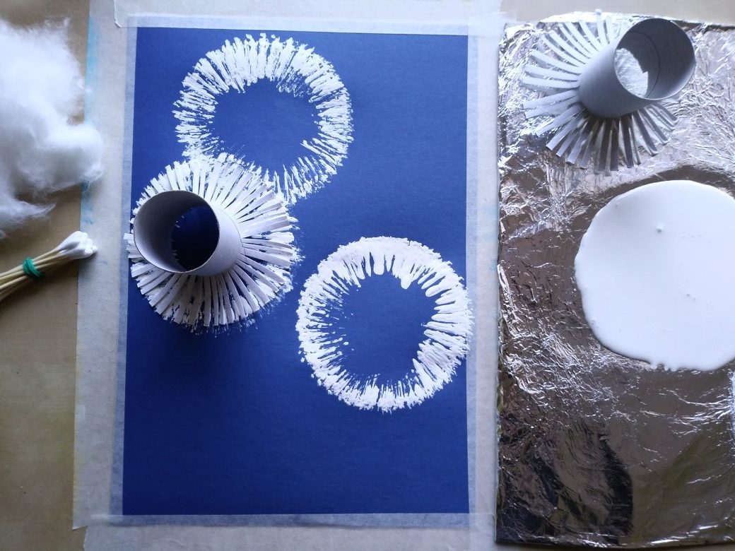Delikatne dmuchawce malujemy białą farbą akrylową. Do tego celu przygotuj paletę, może to być folia aluminiowa nałożona na karton. Prace wykonaj według instrukcji pokazanej na kolejnych zdjęciach. Pamiętaj, farba akrylowa po wyschnięciu zostawia trwałe plamy. Zabezpiecz swoje miejsce pracy.