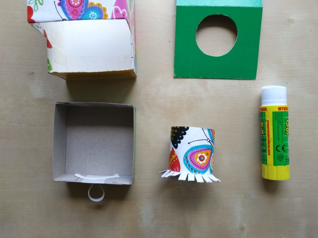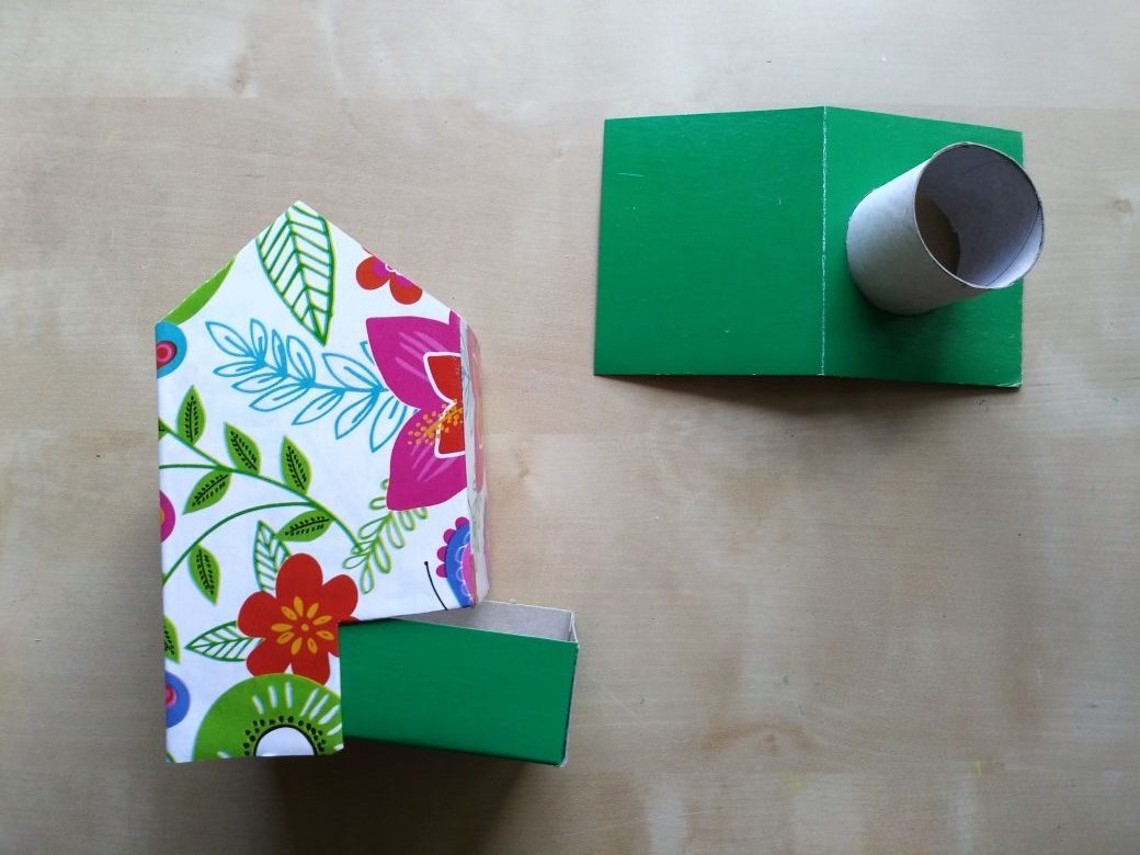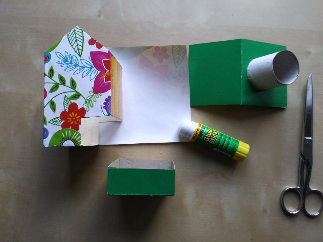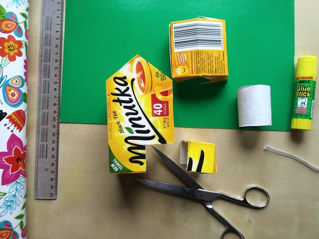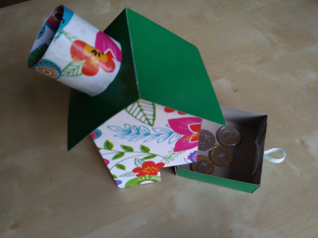 Domek – skarbonkę wykonaj z pudełka, kartonu i rolki po papierze toaletowym. By skarbonka była ładna i estetyczna obklei ją papierem pakowym, kolorowym. Wykonaj wszystkie czynności według instrukcji na zdjęciach. Do gotowego domku – skarbonki wrzucaj monety lub inne skarby przez komin. Oszczędności możesz wyciągnąć wysuwając szufladkę.