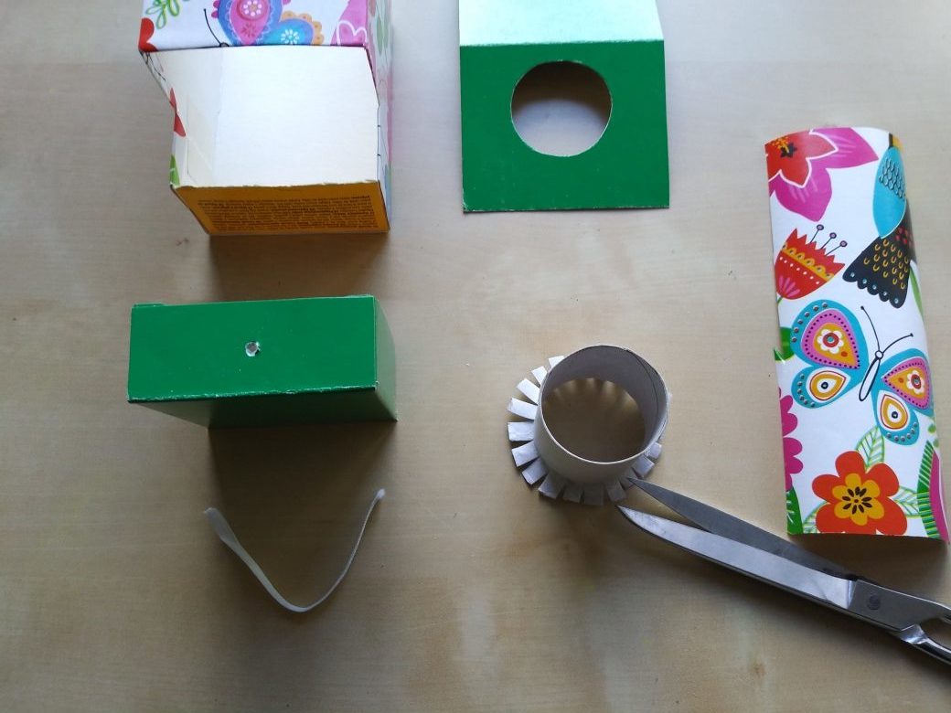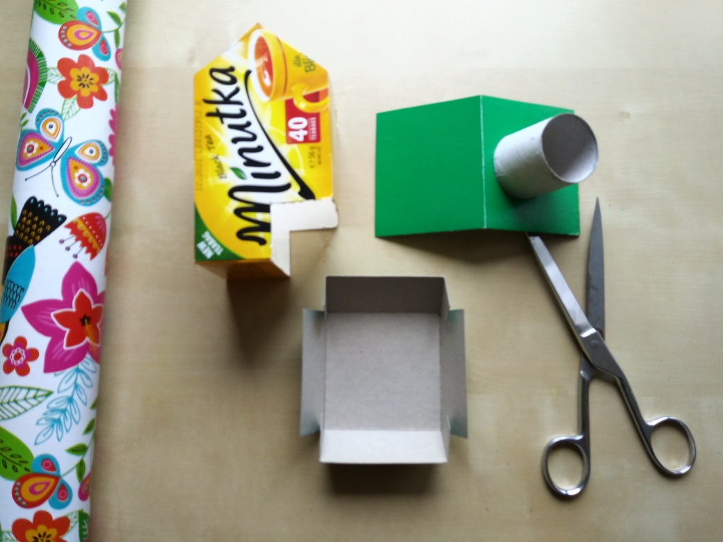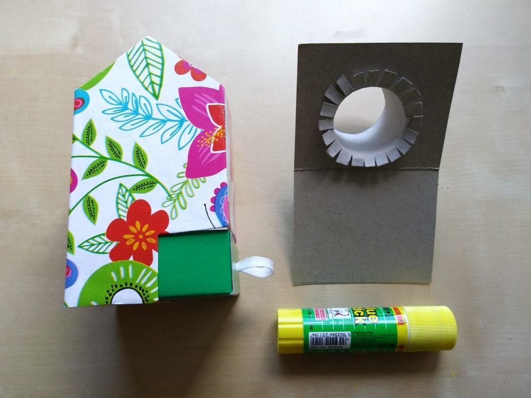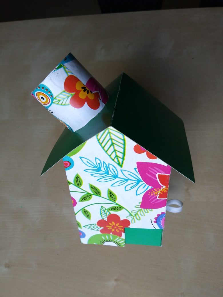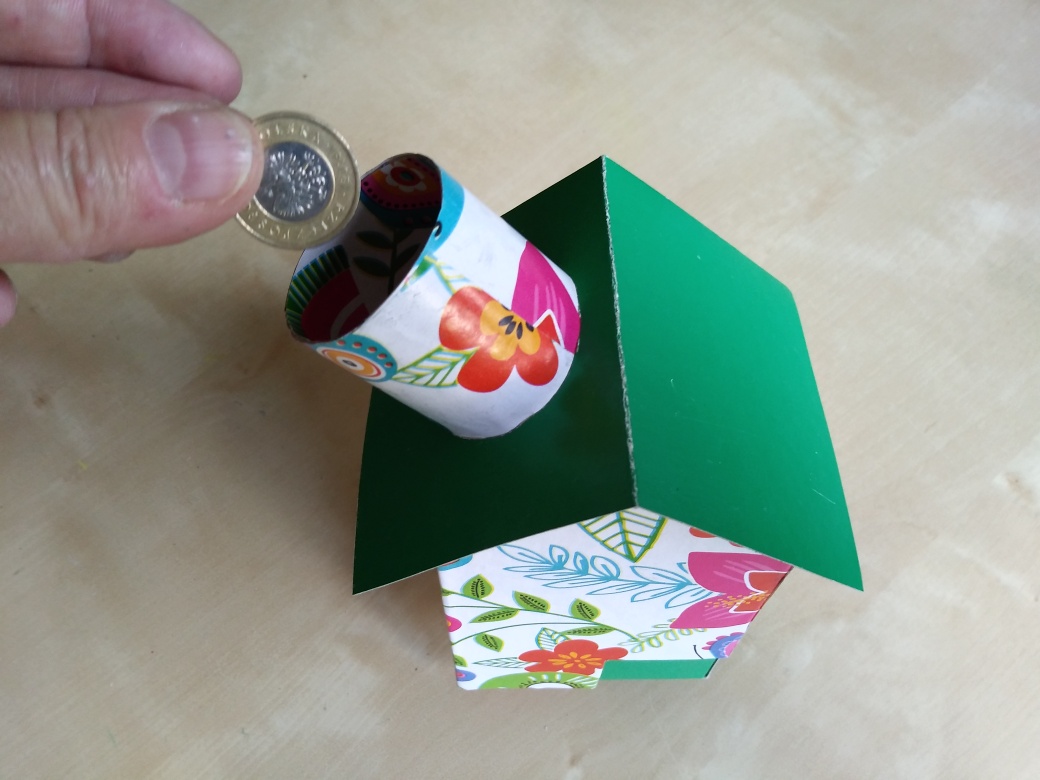 Domek – skarbonkę wykonaj z pudełka, kartonu i rolki po papierze toaletowym. By skarbonka była ładna i estetyczna obklei ją papierem pakowym, kolorowym. Wykonaj wszystkie czynności według instrukcji na zdjęciach. Do gotowego domku – skarbonki wrzucaj monety lub inne skarby przez komin. Oszczędności możesz wyciągnąć wysuwając szufladkę.
