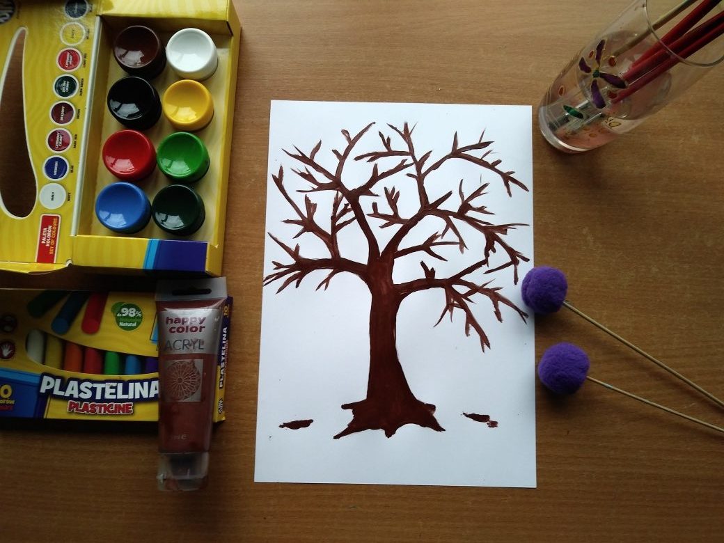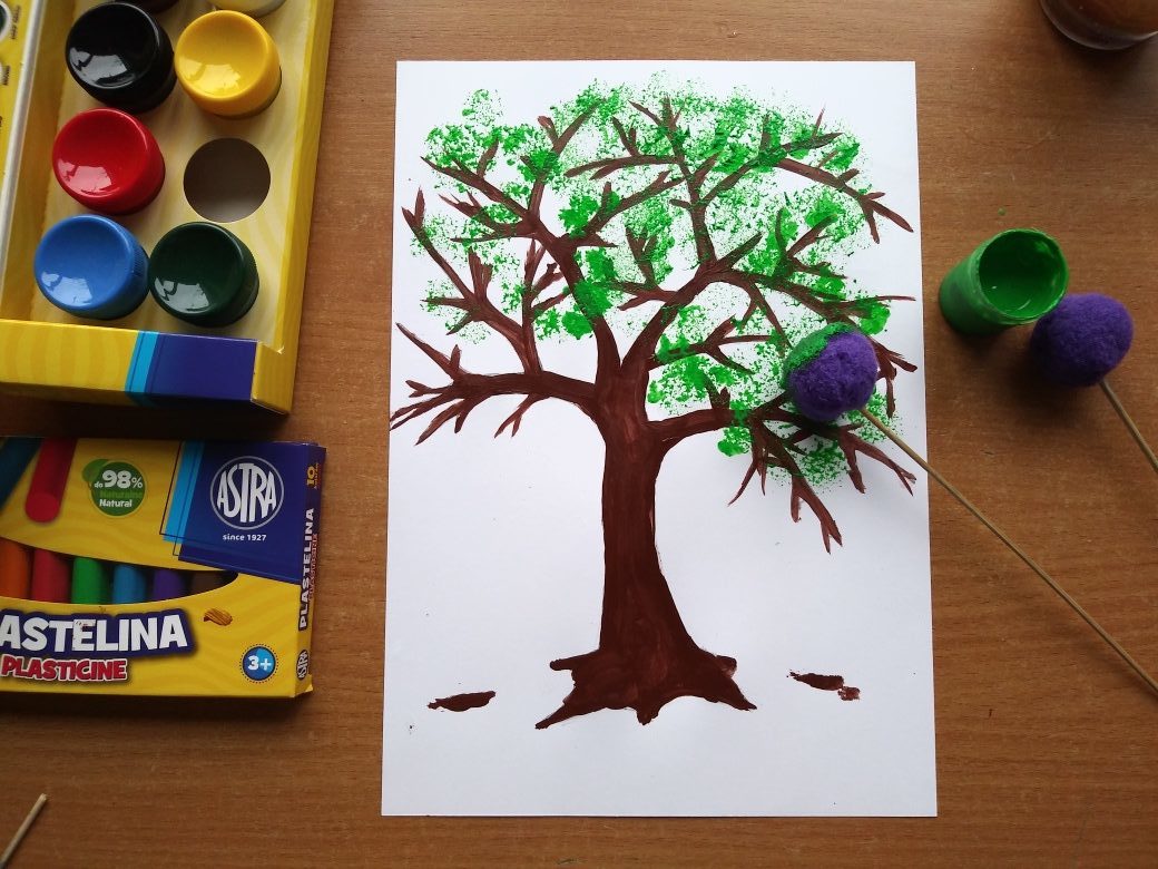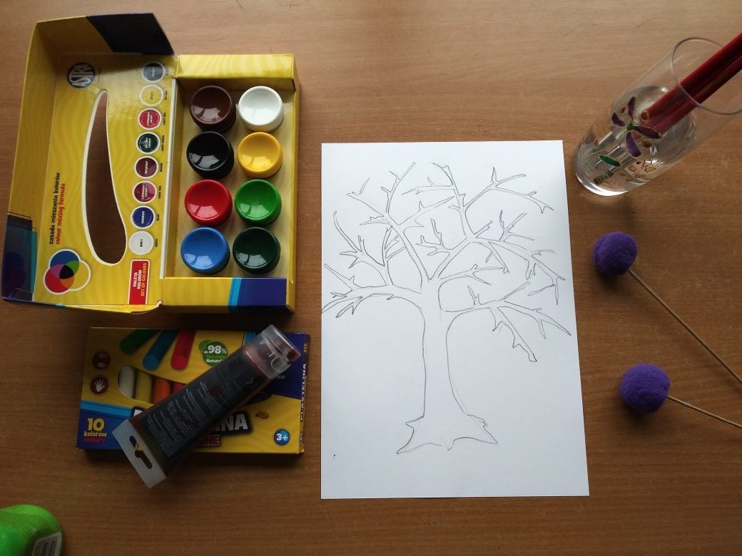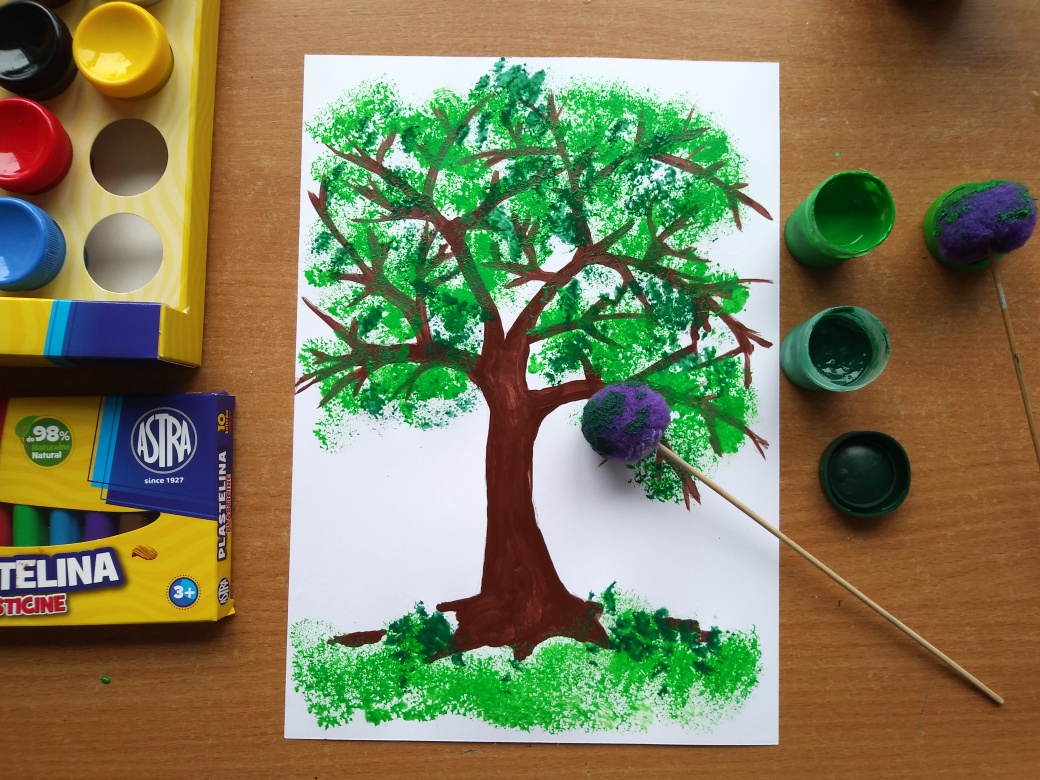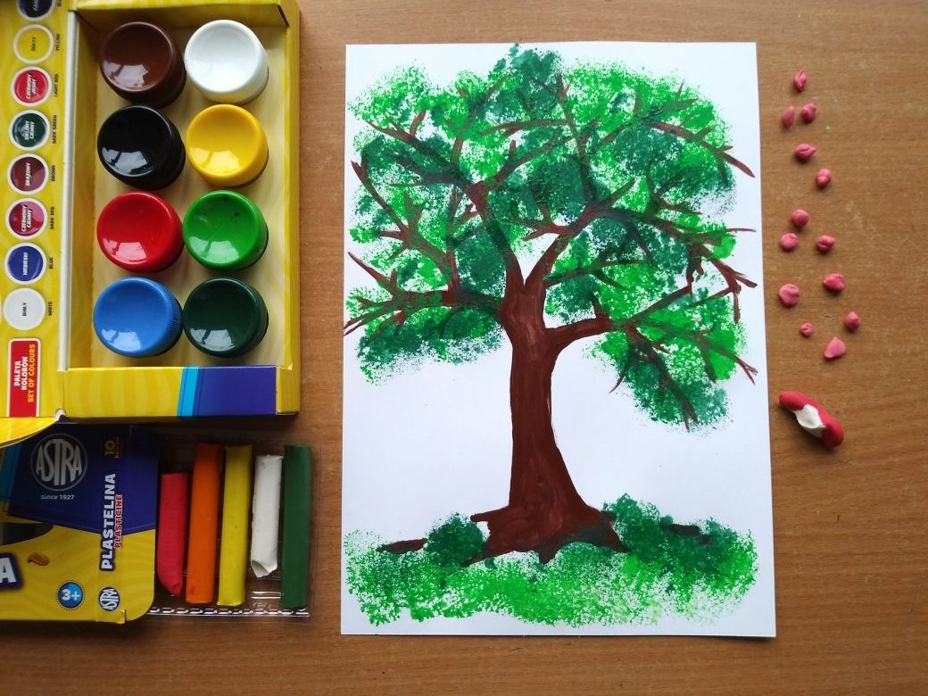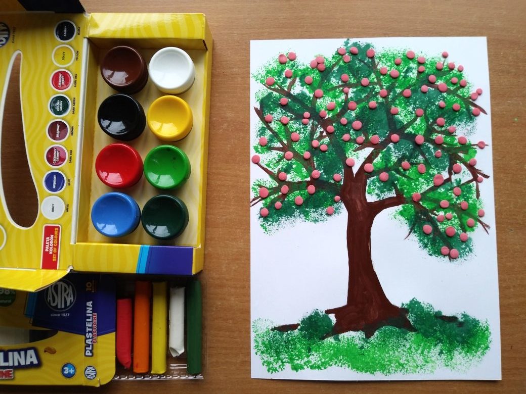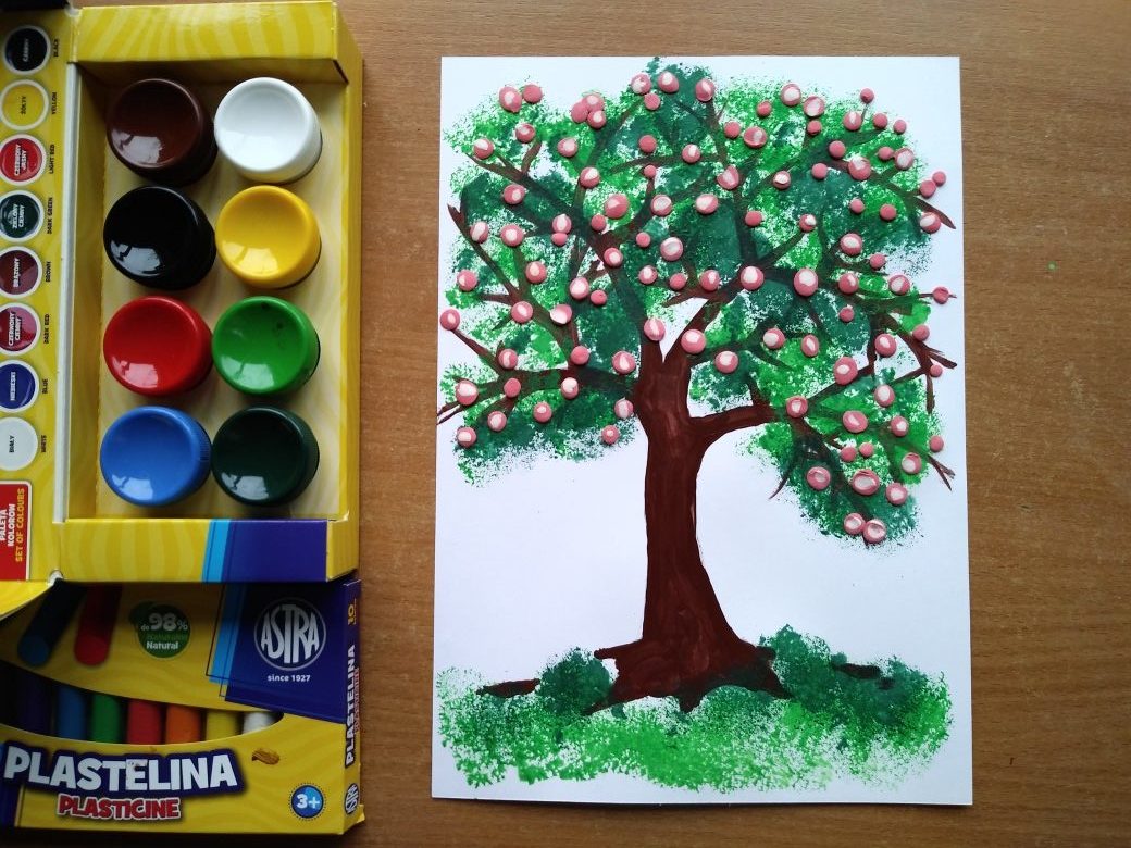 Wiosna to czas kwitnienia drzew owocowych. Do wykonania kwitnącej jabłoni zastosujemy farby plakatowe, akrylowe i plastelinę. Pień i gałęzie drzewa pomaluj farbą akrylową, ona po wyschnięciu nie będzie się łączyła z innym nakładanymi kolorami. Kwiatostan to różowo- białe kwiaty, w tym celu połącz czerwoną i białą plastelinę. Małe rozgniecione kuleczki będą świetnie prezentować się na drzewie. Skorzystaj z instrukcji na zdjęciach.