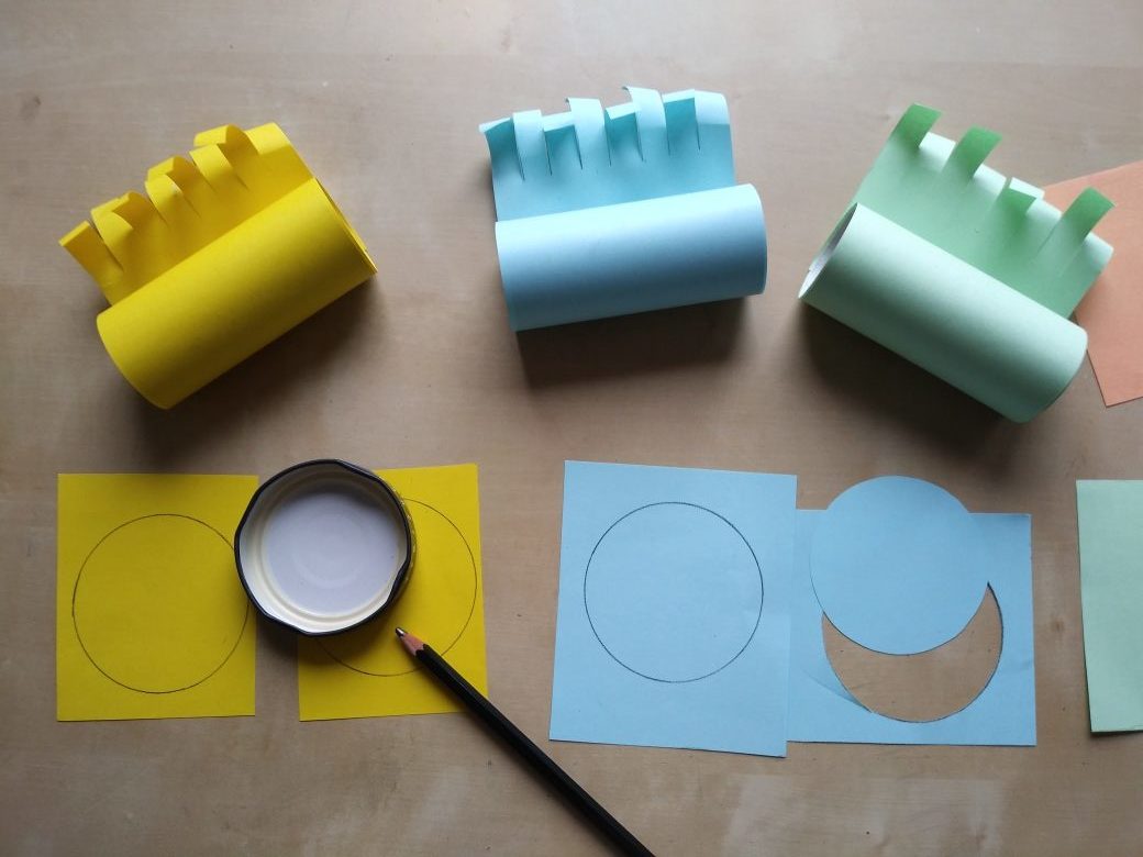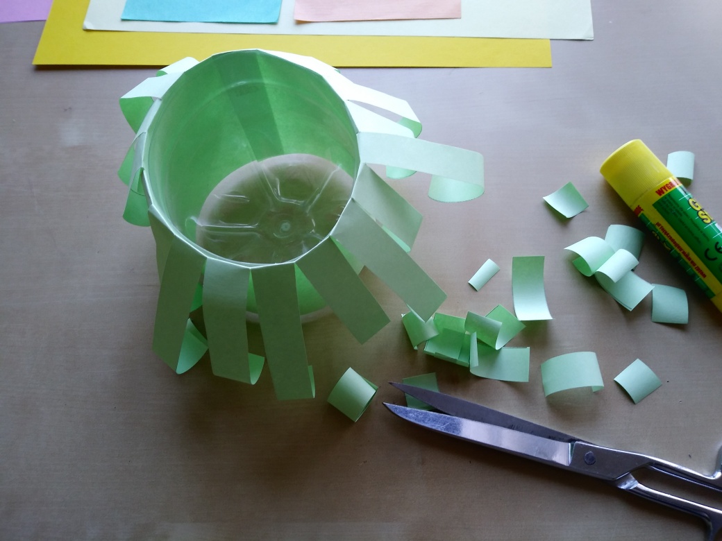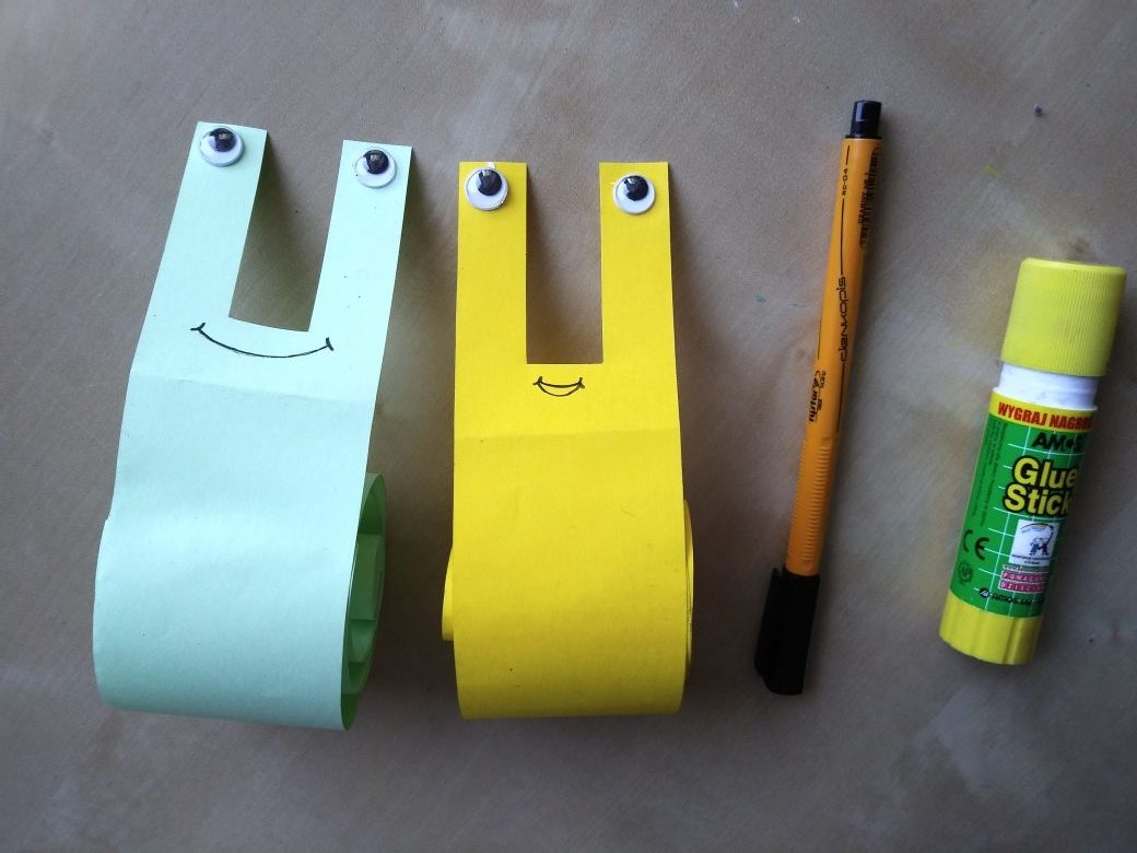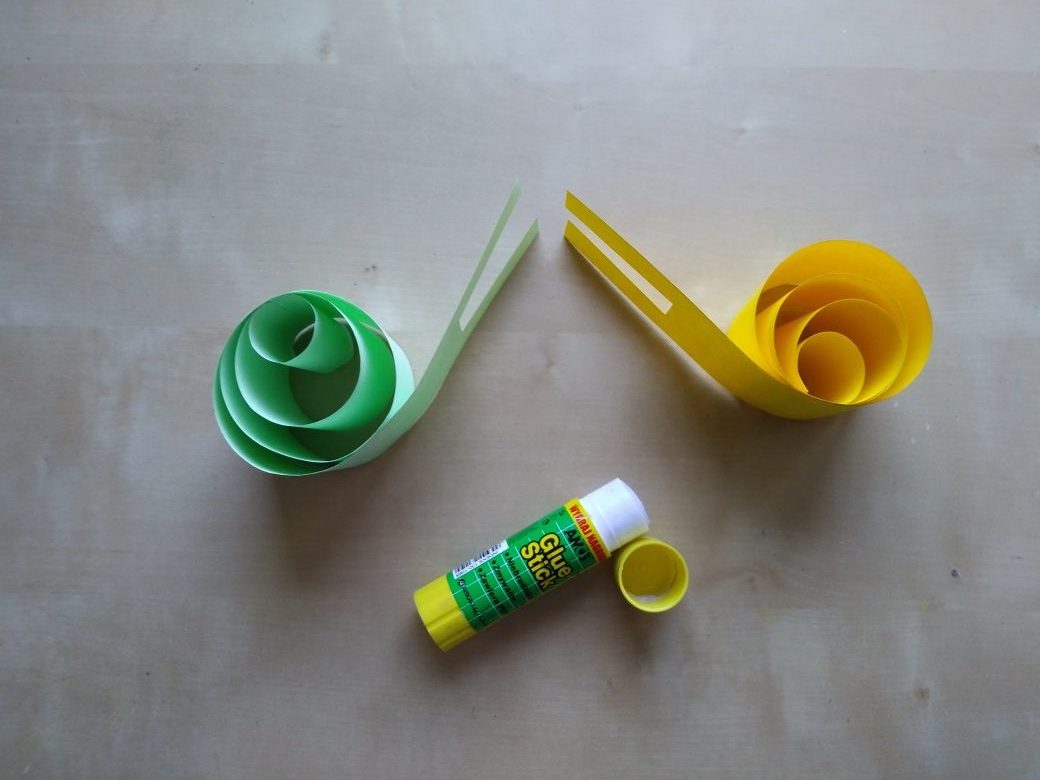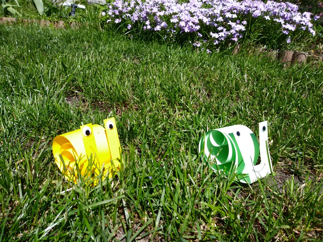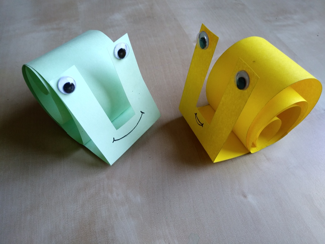 Kolorowe papierowe ślimaki są łatwe w wykonaniu i ślicznie się prezentują w otoczeniu przyrody. Wystarczy kolorowy papier, nożyczki i ołówek. Dwa równe paski połącz w jeden długi, a na końcu jednego wytnij rogi. Zwiń pasek tak by powstała muszla, sklej, narysuj oczy i buzie. Gotowe.