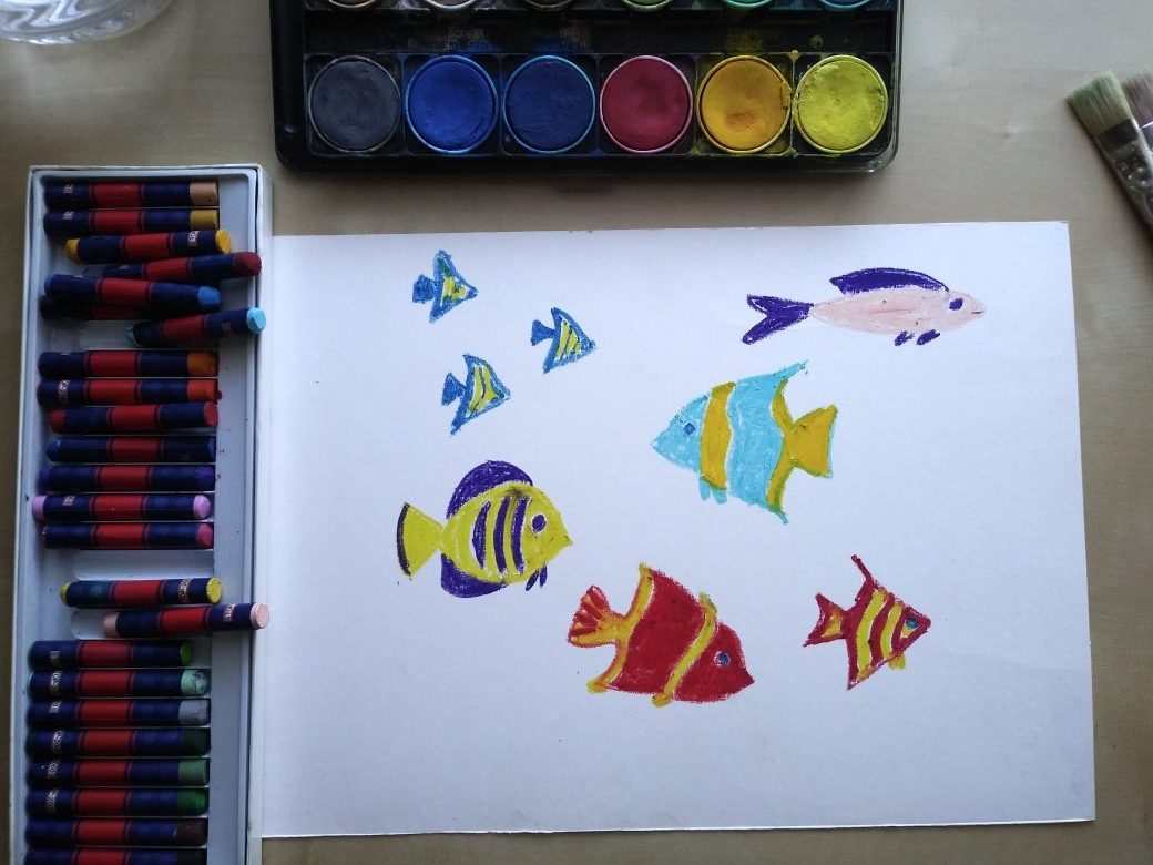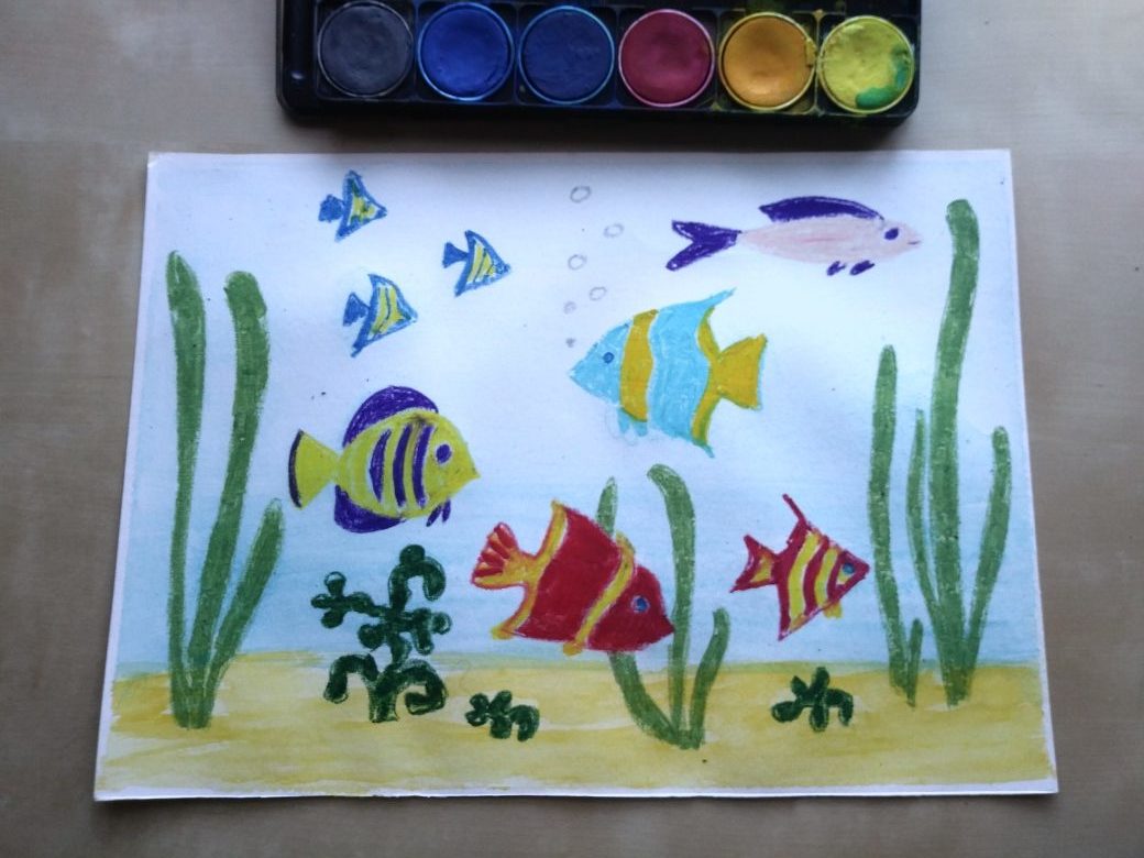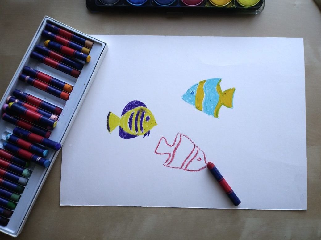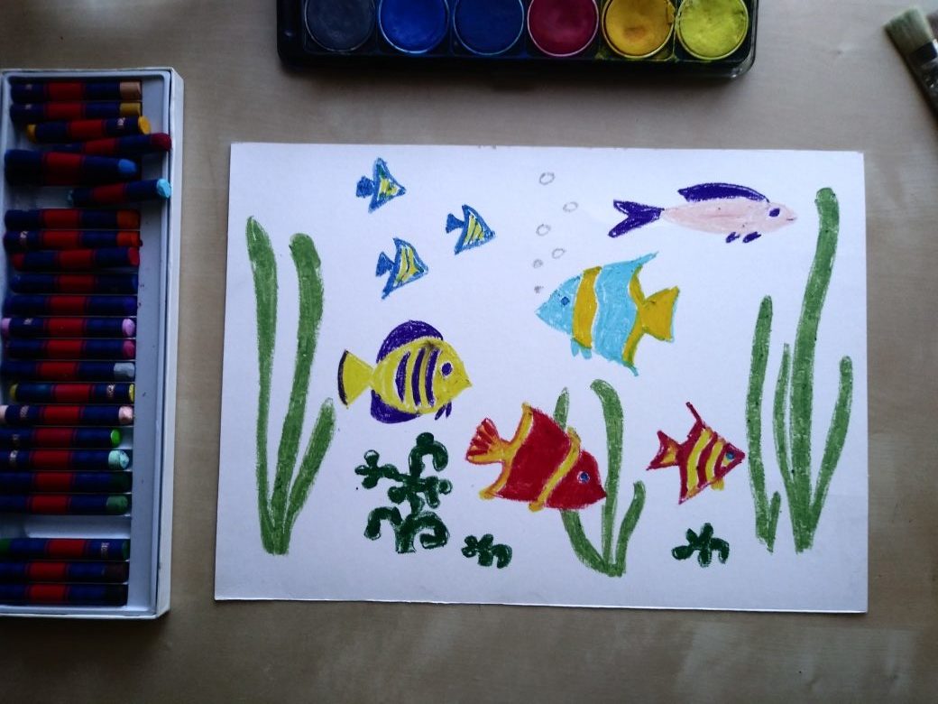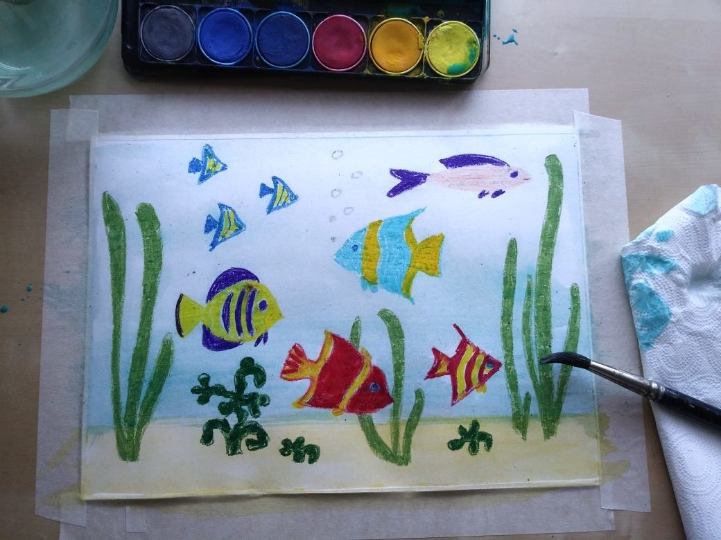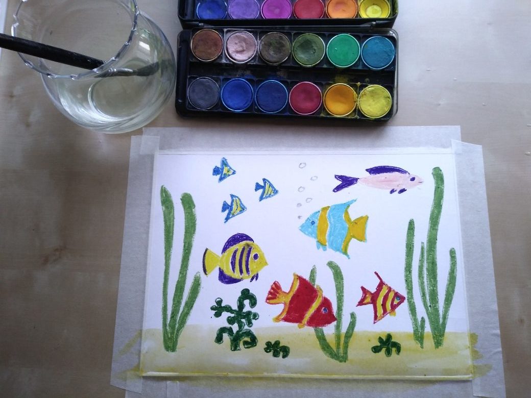 Zastosujemy do wykonania akwarium techniki mieszane. Połączymy rysunek wykonany pastelami olejnymi lub kredkami świecowymi z farbami wodnymi.
