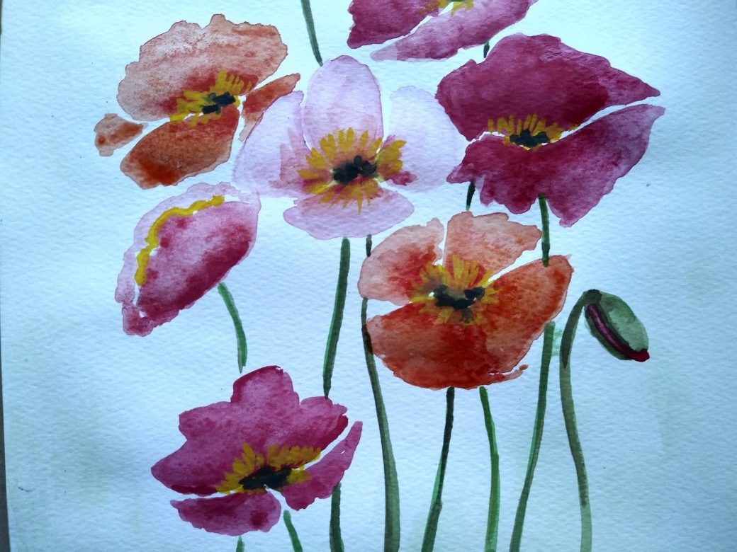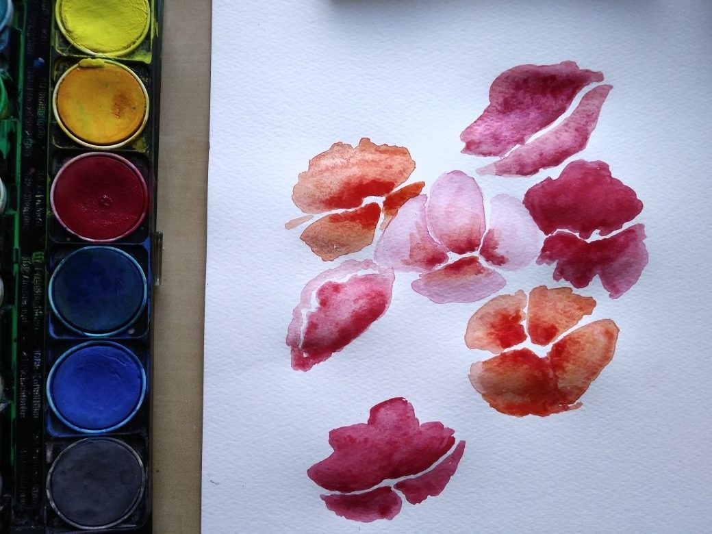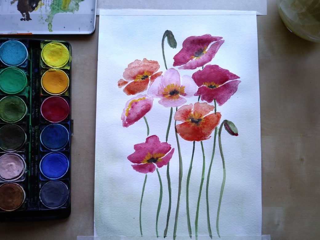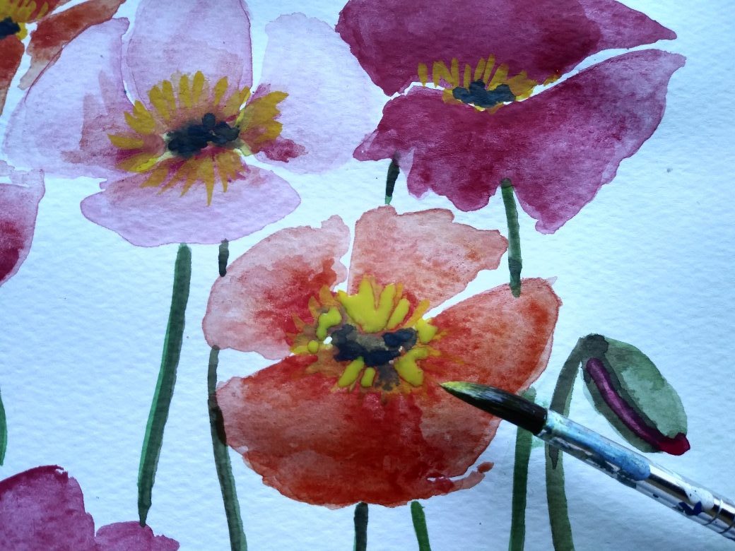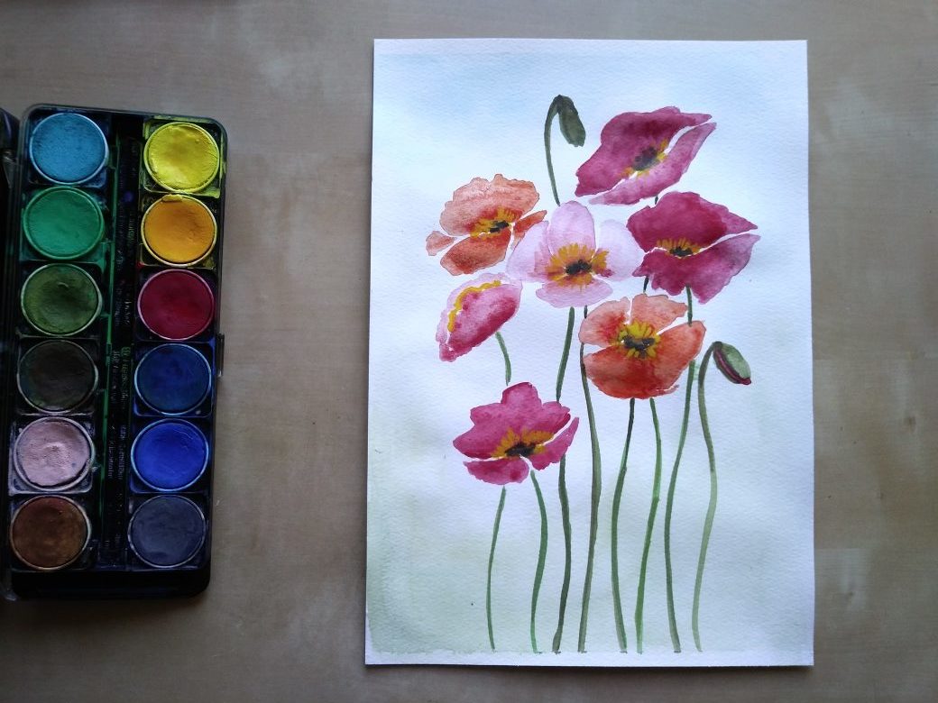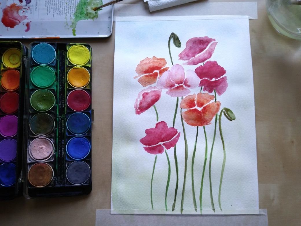 Przypominam, do malowania akwarelami używamy papieru o wyższej gramaturze i z fakturą. Kwiaty zaczynamy malować od płatków, w różnych odcieniach czerwieni. Na przygotowanej palecie możesz łączyć barwy lub przez dodanie dużej ilości wody malować farbą delikatnie, laserunkowo. Nadmiar wody na pędzlu odsączaj w przygotowany papier do rąk. Jeśli wilgotne płatki dotkniesz pędzlem z nasyconym kolorem, farba rozleje się nadając kwiatom naturalnych przebarwień. Do namalowania tła musimy obraz przykleić do stołu taśmą malarską. Mocno rozcieńczona farba mogłaby zniekształcić papier. Łodygi i wnętrza kwiatów maluj po wyschnięciu tła i płatków. Patrz na fotografie i działaj twórczo.