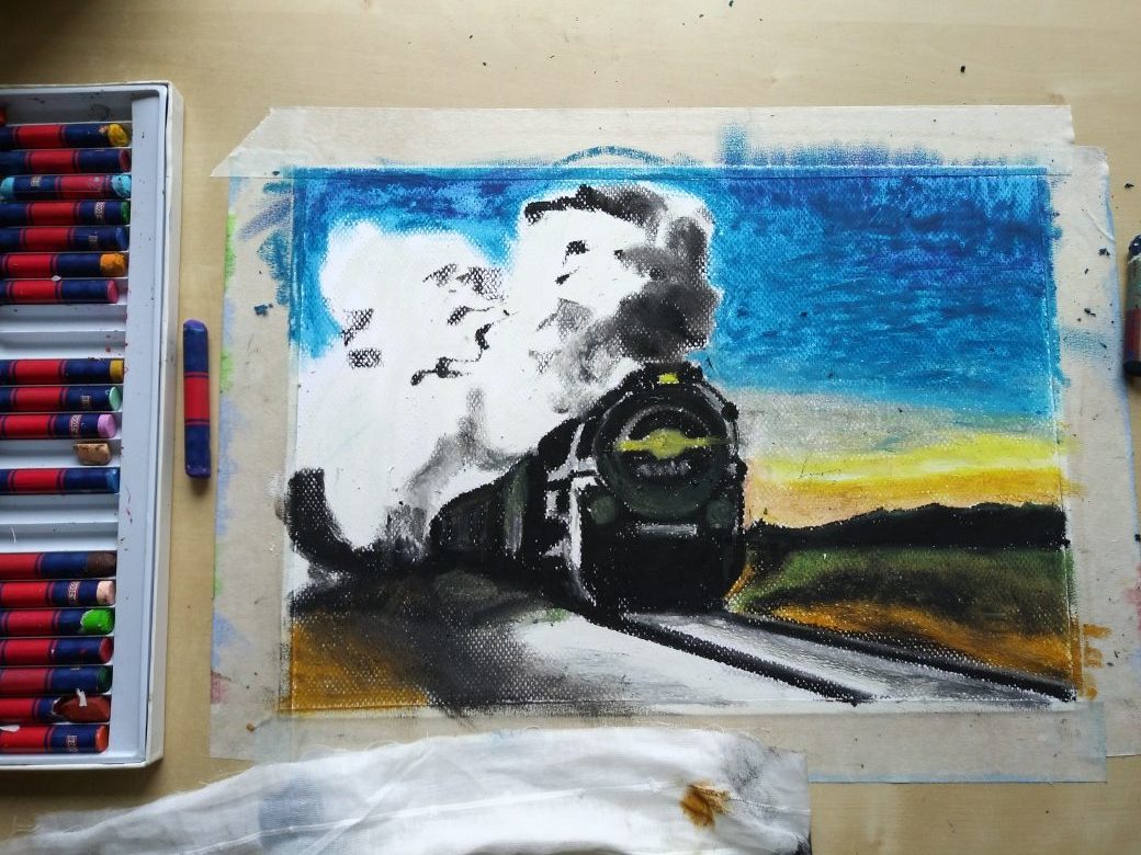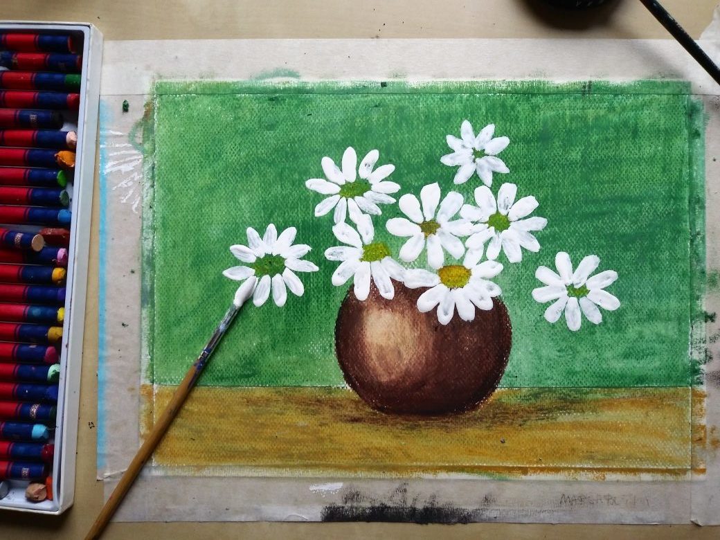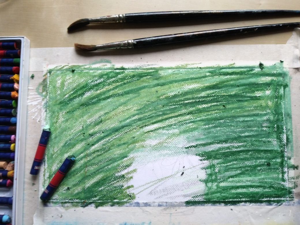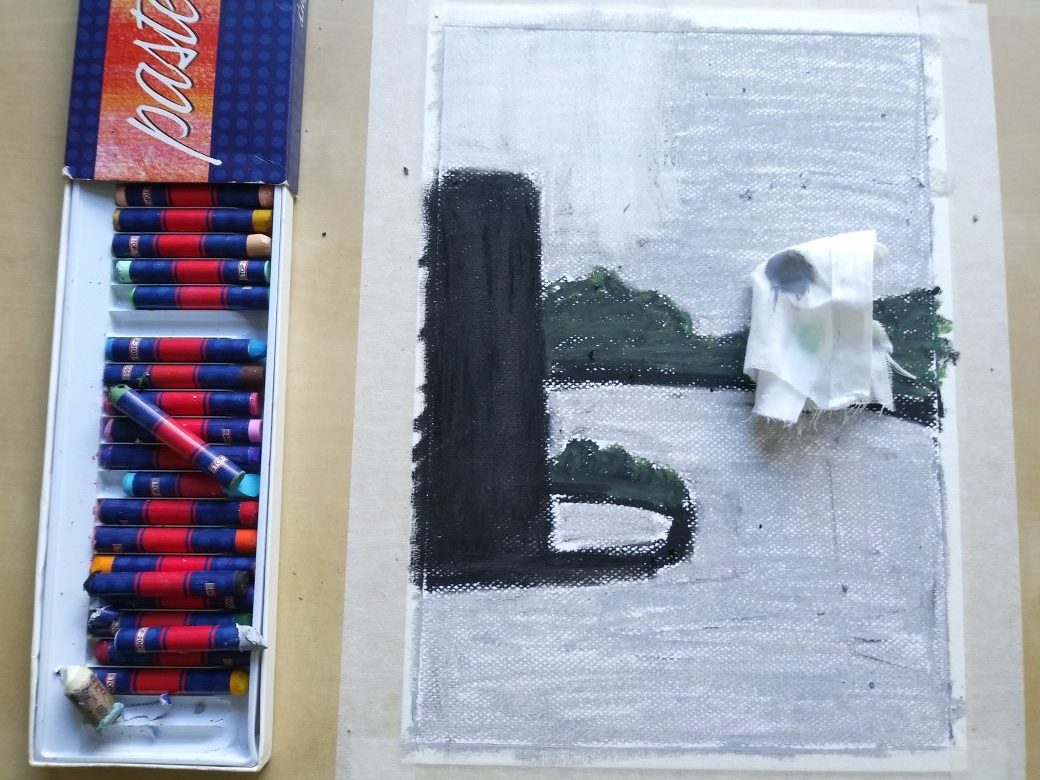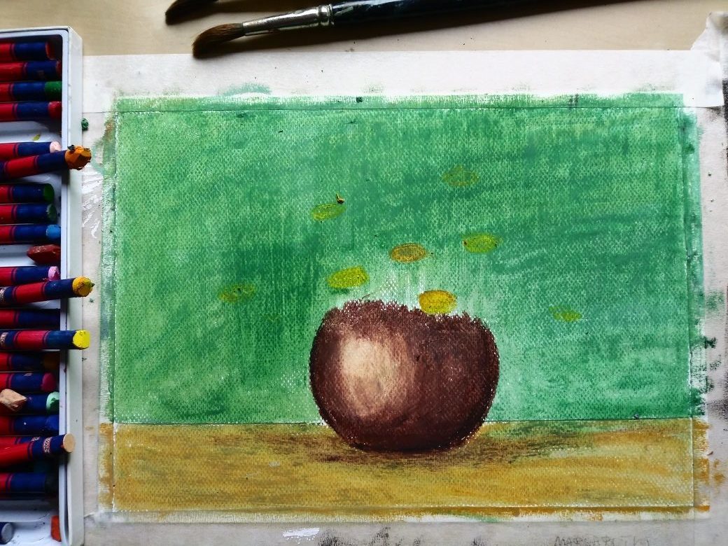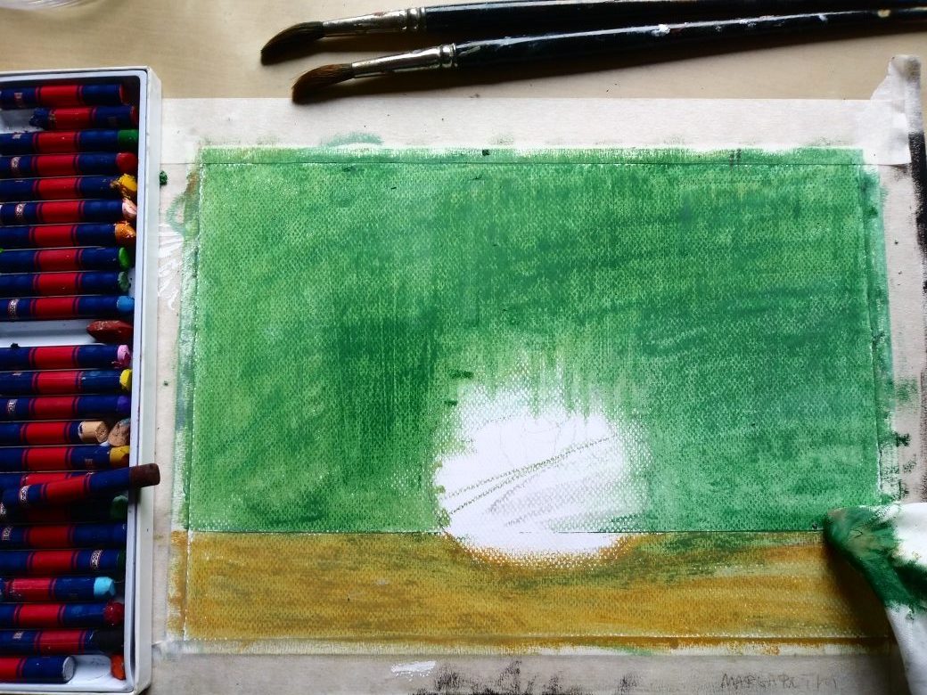 Łączenie pasteli olejnych z farbami akrylowymi jest możliwy bo obydwie techniki nie są transparentne. Warto eksperymentować w pracy twórczej, w ten sposób uczymy się i doświadczamy nowych wyzwań.